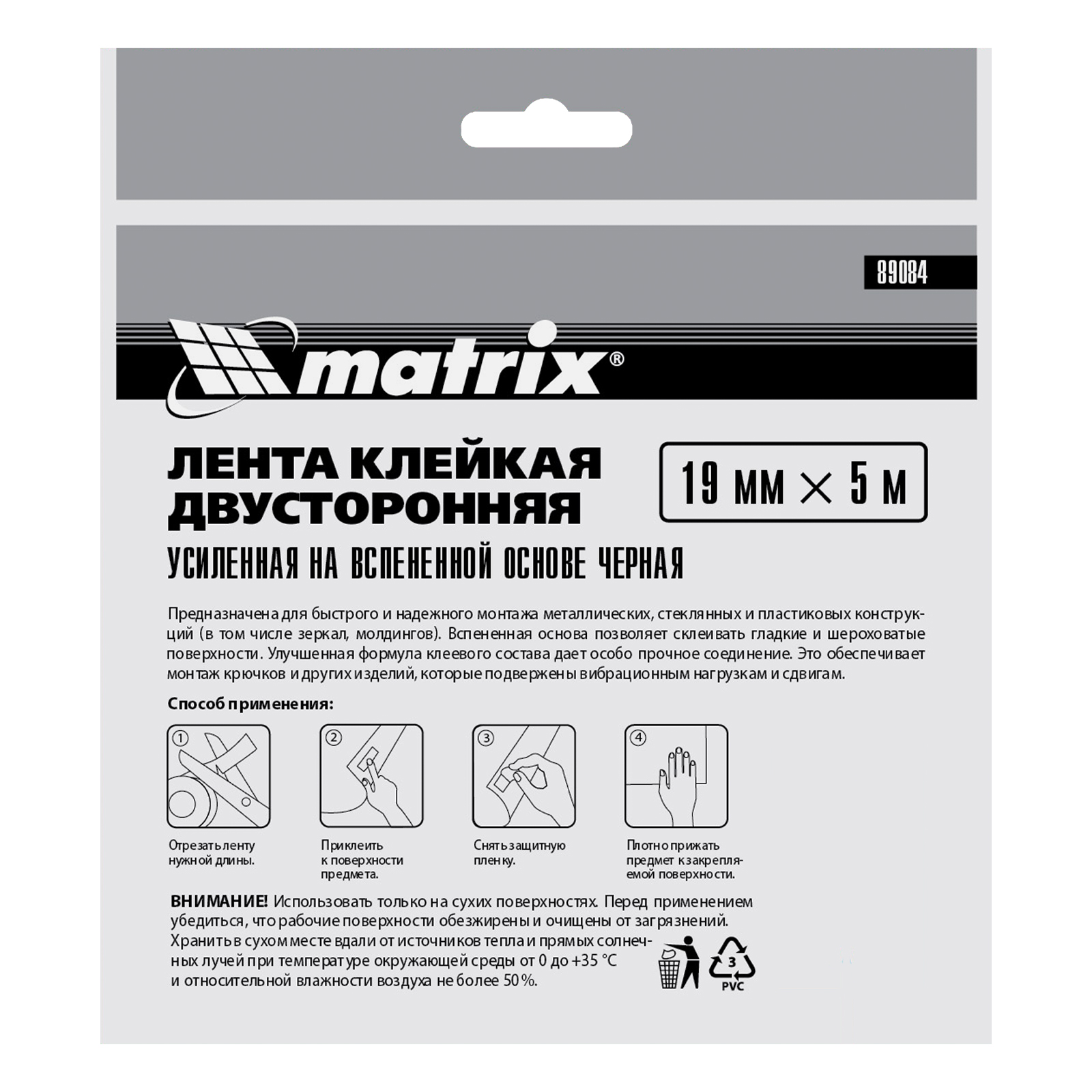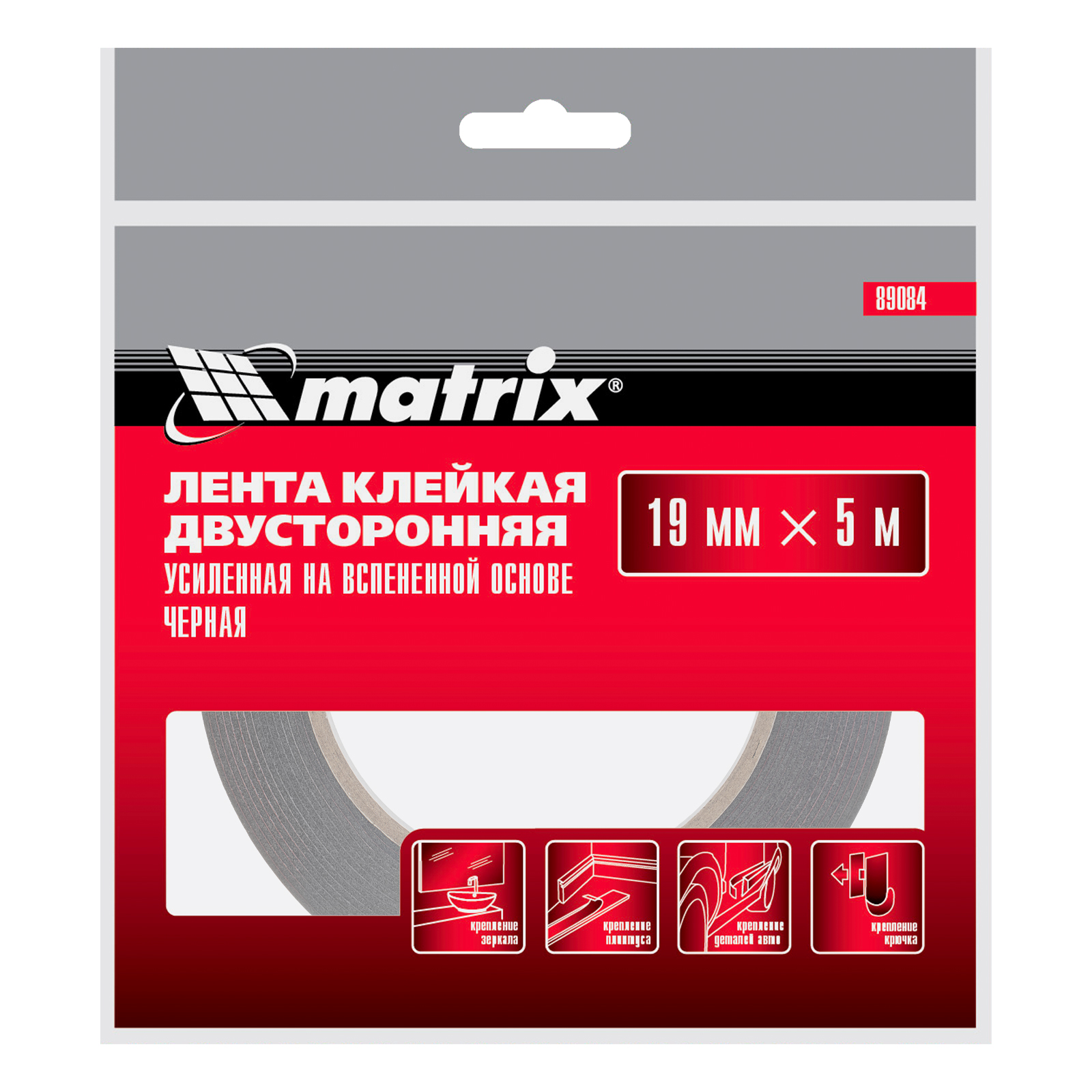 Усиленная двусторонняя клейкая лента Matrix 89084 на вспененной основе, размером 19 мм х 5 м, черного цвета, надежно соединяет ровные и шероховатые поверхности без риска их повреждения. Подходит для склеивания предметов из металла, пластика, картона, керамики, стекла. Пригодится в ходе проведения ремонтных, монтажных работ, а также для занятий рукоделием. Лента может использоваться для монтажа предметов, подвергающихся вибронагрузкам и сдвигам: автомобильных молдингов, зеркал, крючков и т.д.