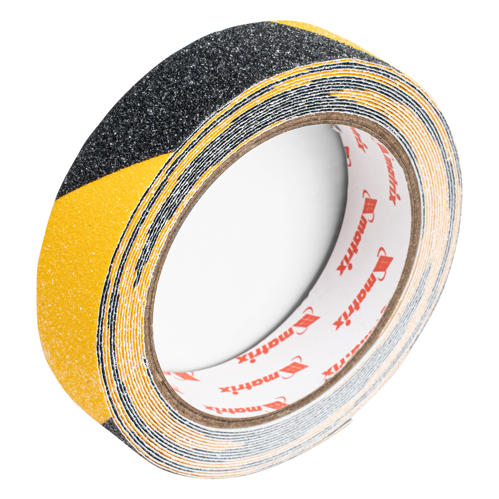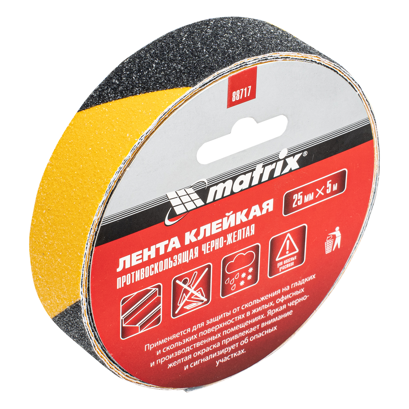 Клейкая противоскользящая лента Matrix 88717 черно-желтого цвета, размером 25 мм х 5 м, предназначена для предотвращения несчастных случаев на лестницах, кафельном полу и других скользких поверхностях. Позволяет обезопасить посетителей людных мест: общественного здания, многоквартирного дома, производства, магазина. Ленту следует наклеивать на очищенные сухие поверхности при температуре выше +12 °C.