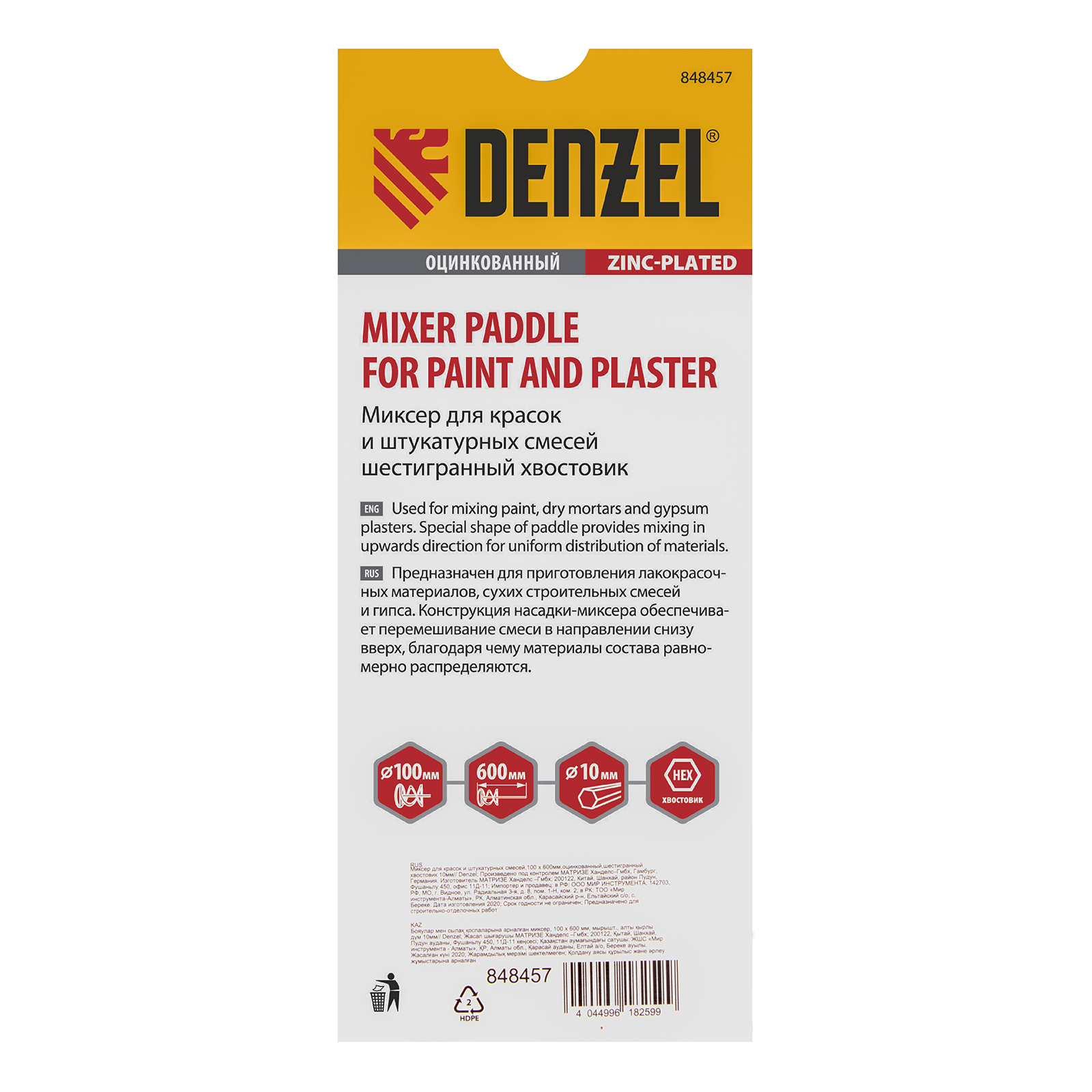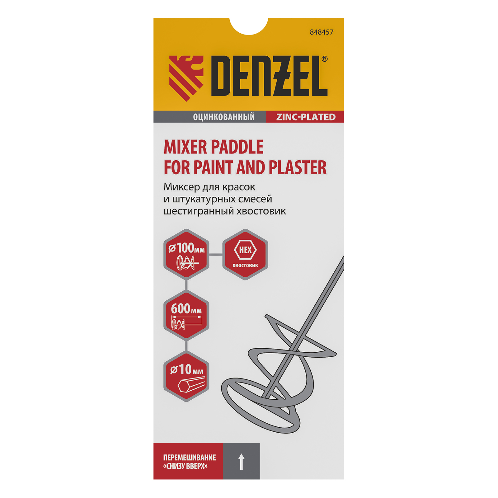 Оцинкованный миксер для красок и штукатурных смесей Denzel 848457 длиной 600 мм, с шестигранным хвостовиком 10 мм, имеет венчик диаметром 100 мм и используется для приготовления строительных растворов. Насадка перемешивает состав снизу вверх, что позволяет добиться полной однородности готовой смеси. Защитное кольцо предотвращает повреждение емкости, в которой готовится раствор. Миксер пригодится во время строительства и ремонта.