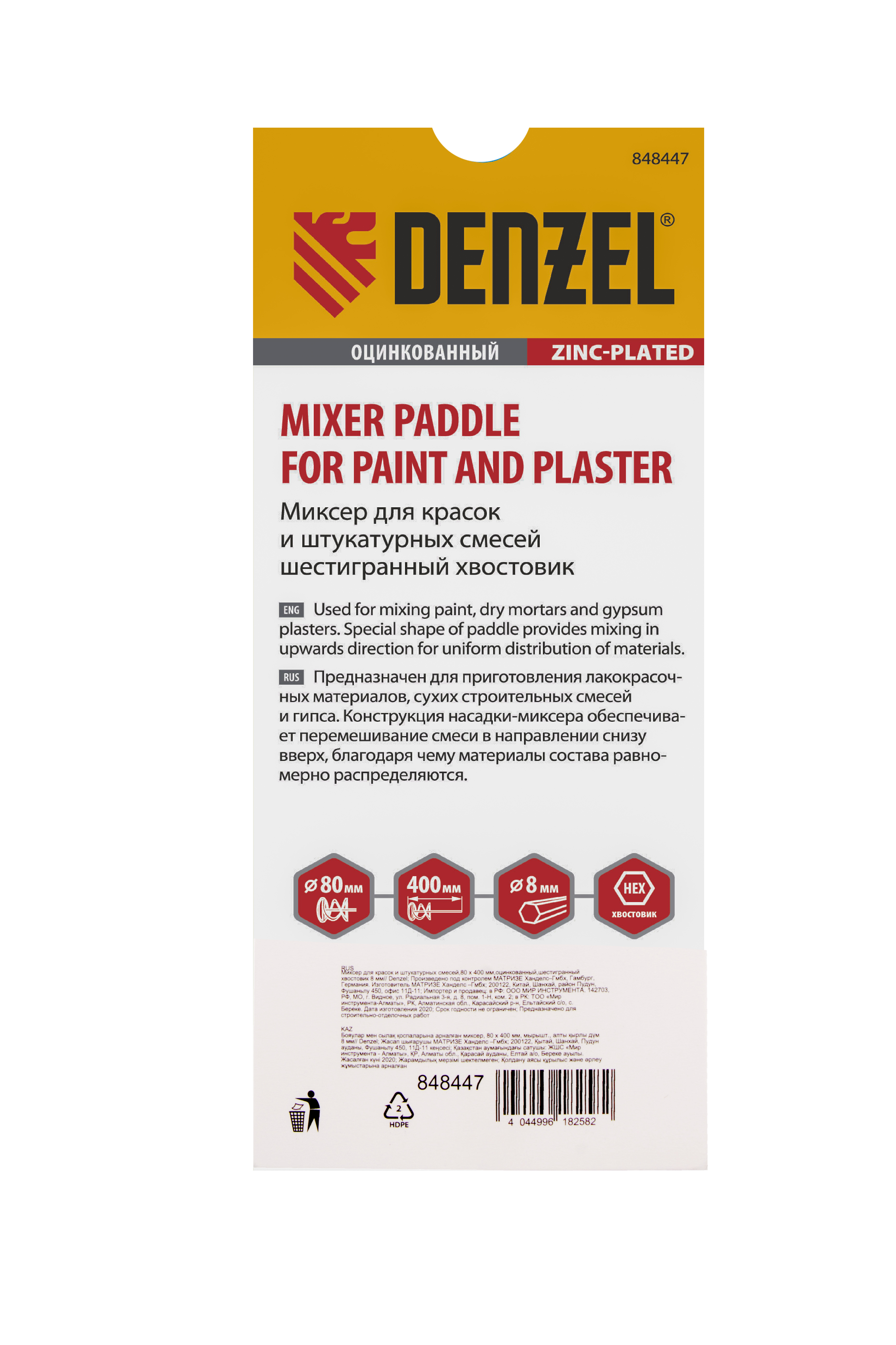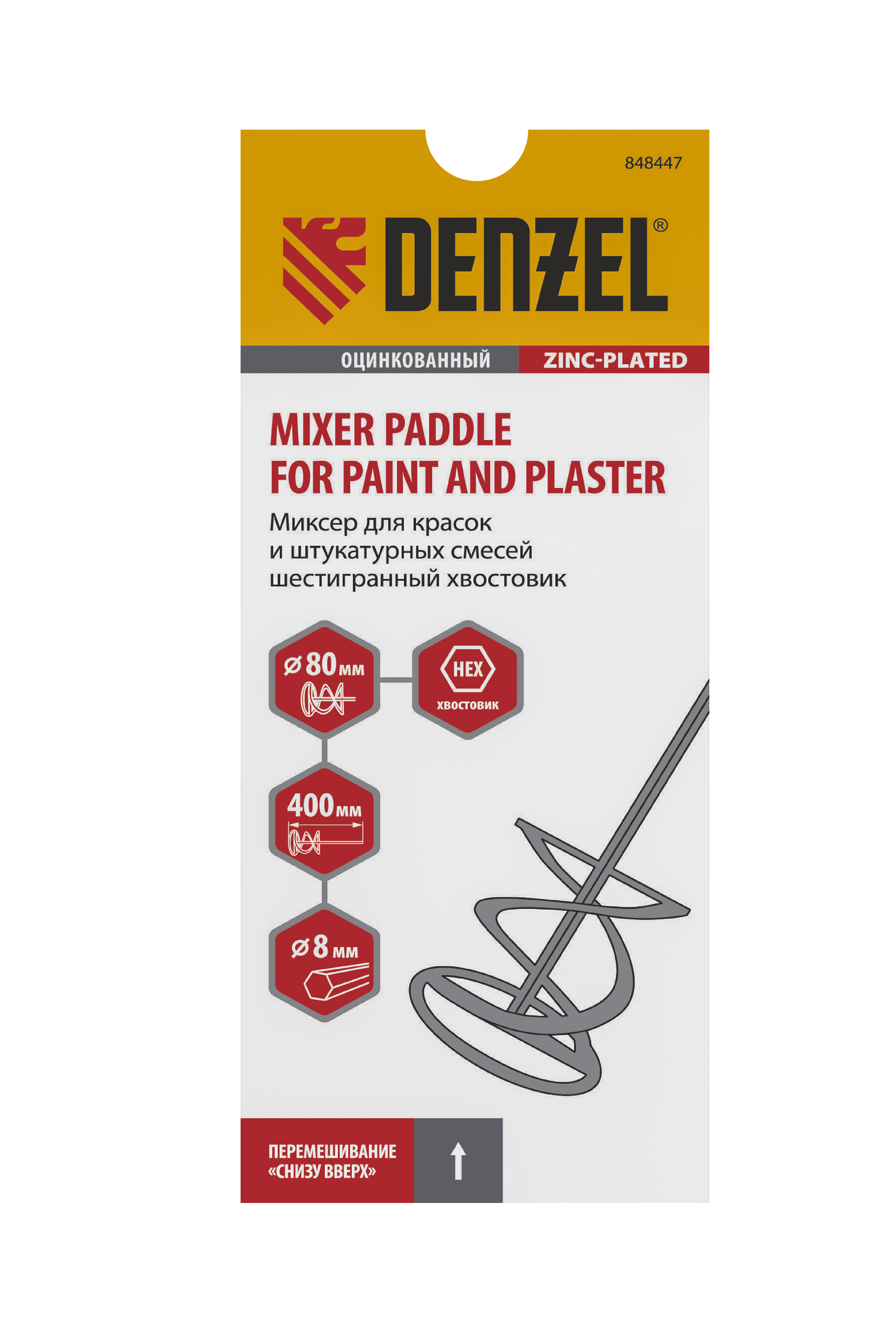Оцинкованный миксер для красок и штукатурных смесей Denzel 848447 длиной 400 мм, с шестигранным хвостовиком 8 мм, имеет венчик диаметром 80 мм и используется для приготовления строительных растворов. Насадка перемешивает состав снизу вверх, что позволяет добиться полной однородности готовой смеси. Защитное кольцо предотвращает повреждение емкости, в которой готовится раствор. Миксер пригодится во время строительства и ремонта.
