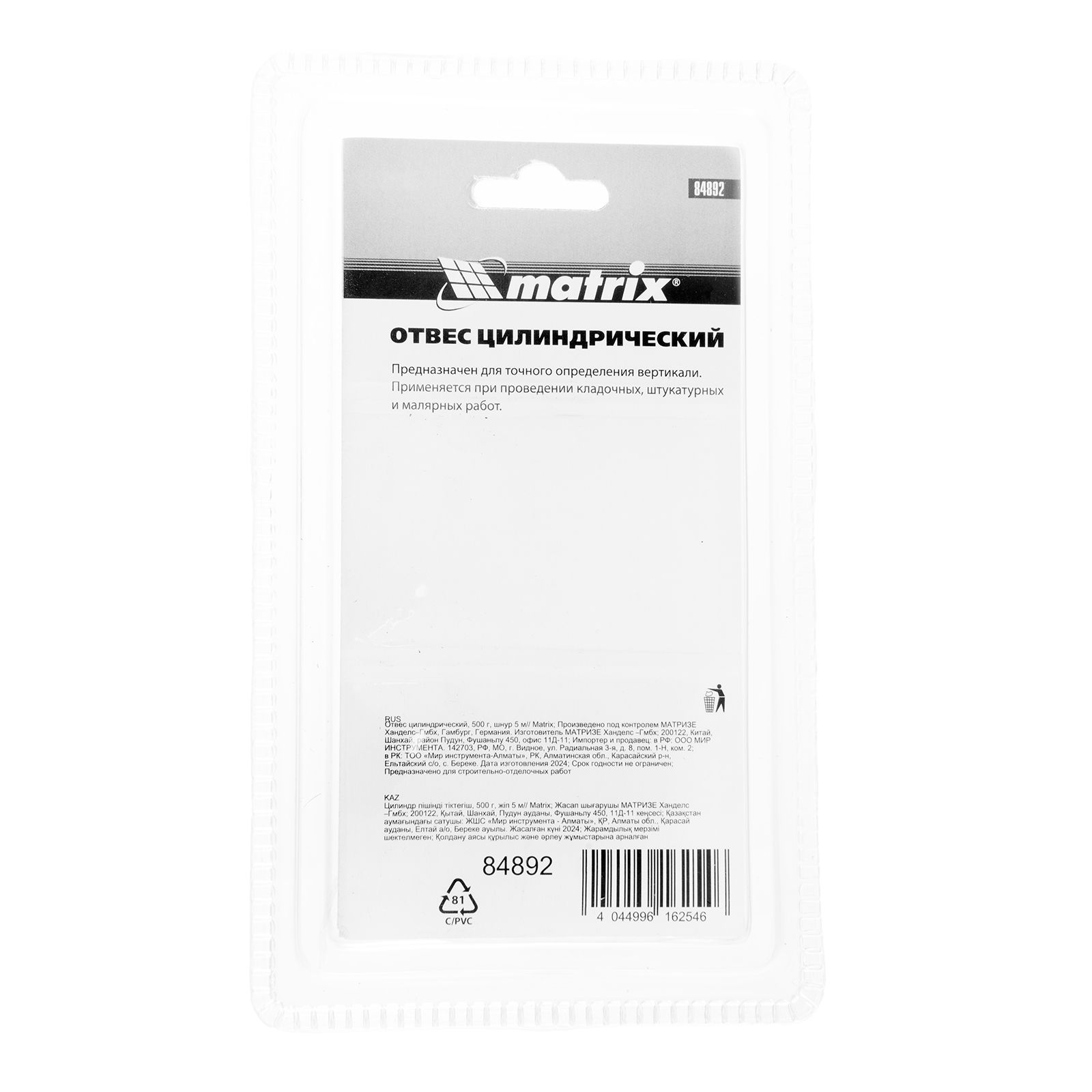 Цилиндрический отвес Matrix 84892 весом 500 г, в комплекте со шнуром 5 м, позволяет осуществить контроль вертикали. Он пригодится мастерам при проведении работ внутри и снаружи помещений. Отвес в форме цилиндра обеспечивает отличную центровку. За счет увеличенного веса 300 г оптимален для наружных работ.