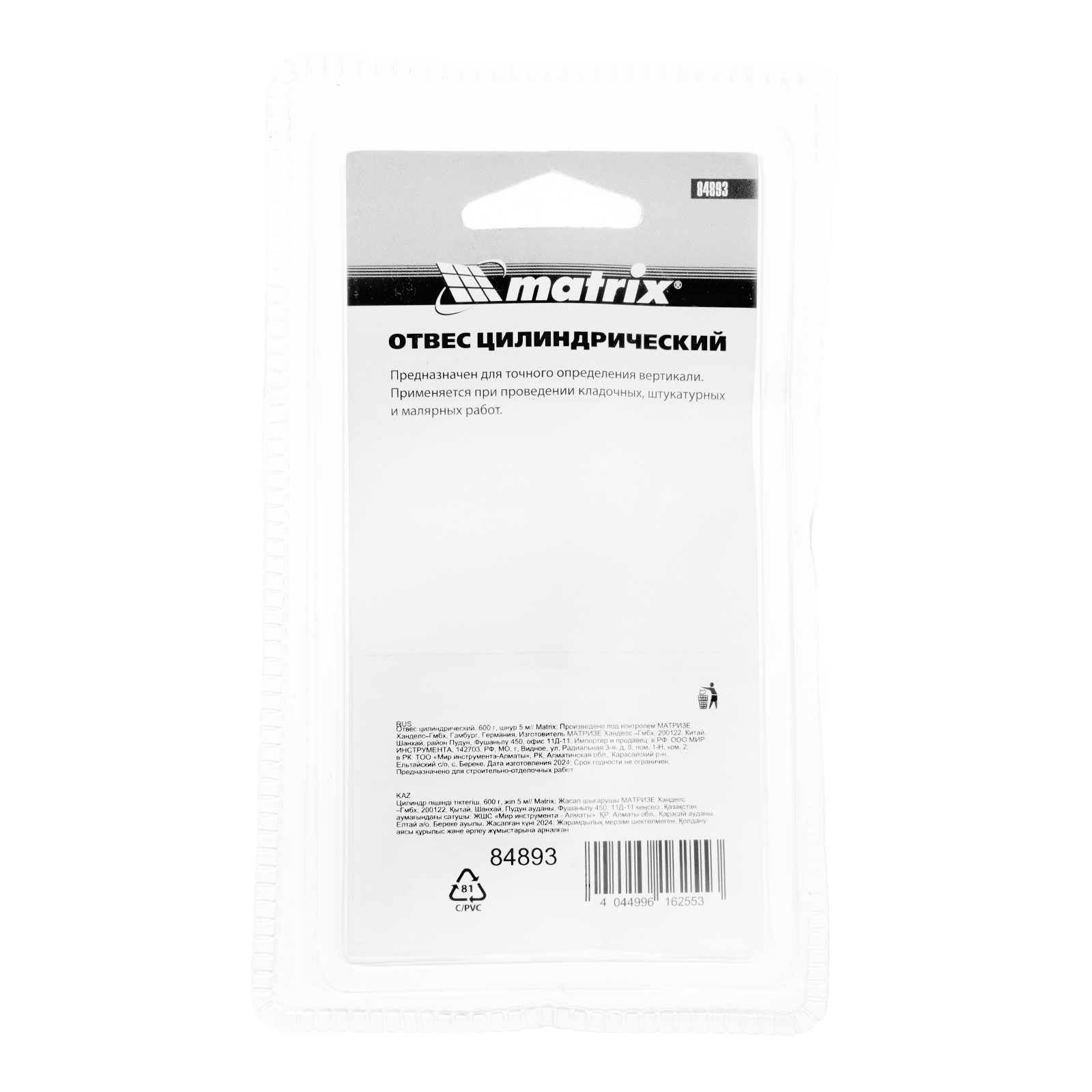 Цилиндрический отвес Matrix 84893 весом 600 г, в комплекте со шнуром 5 м, позволяет осуществить контроль вертикали. Он пригодится мастерам при проведении работ внутри и снаружи помещений. Отвес в форме цилиндра обеспечивает отличную центровку. За счет увеличенного веса 600 г оптимален для наружных работ.