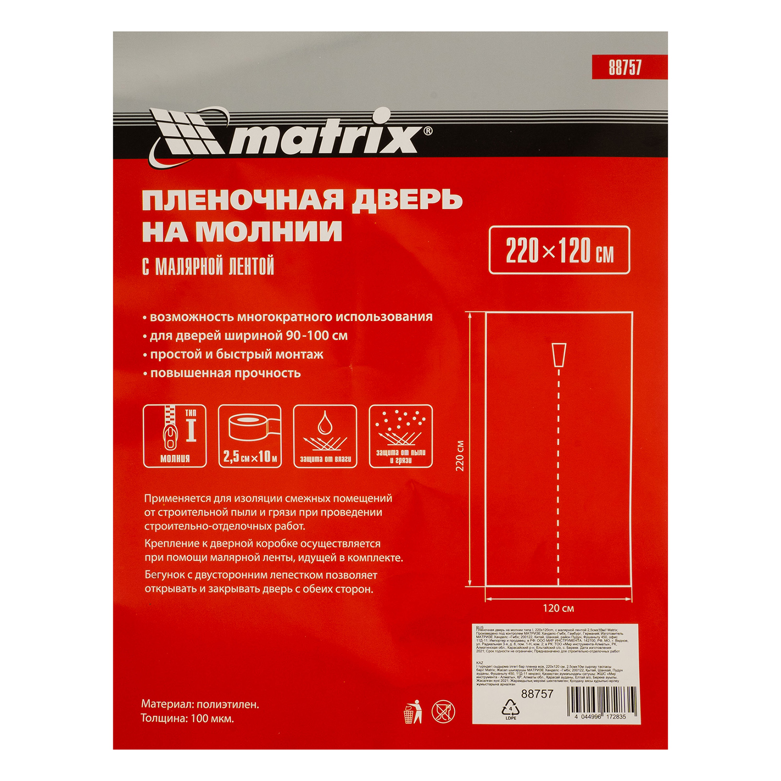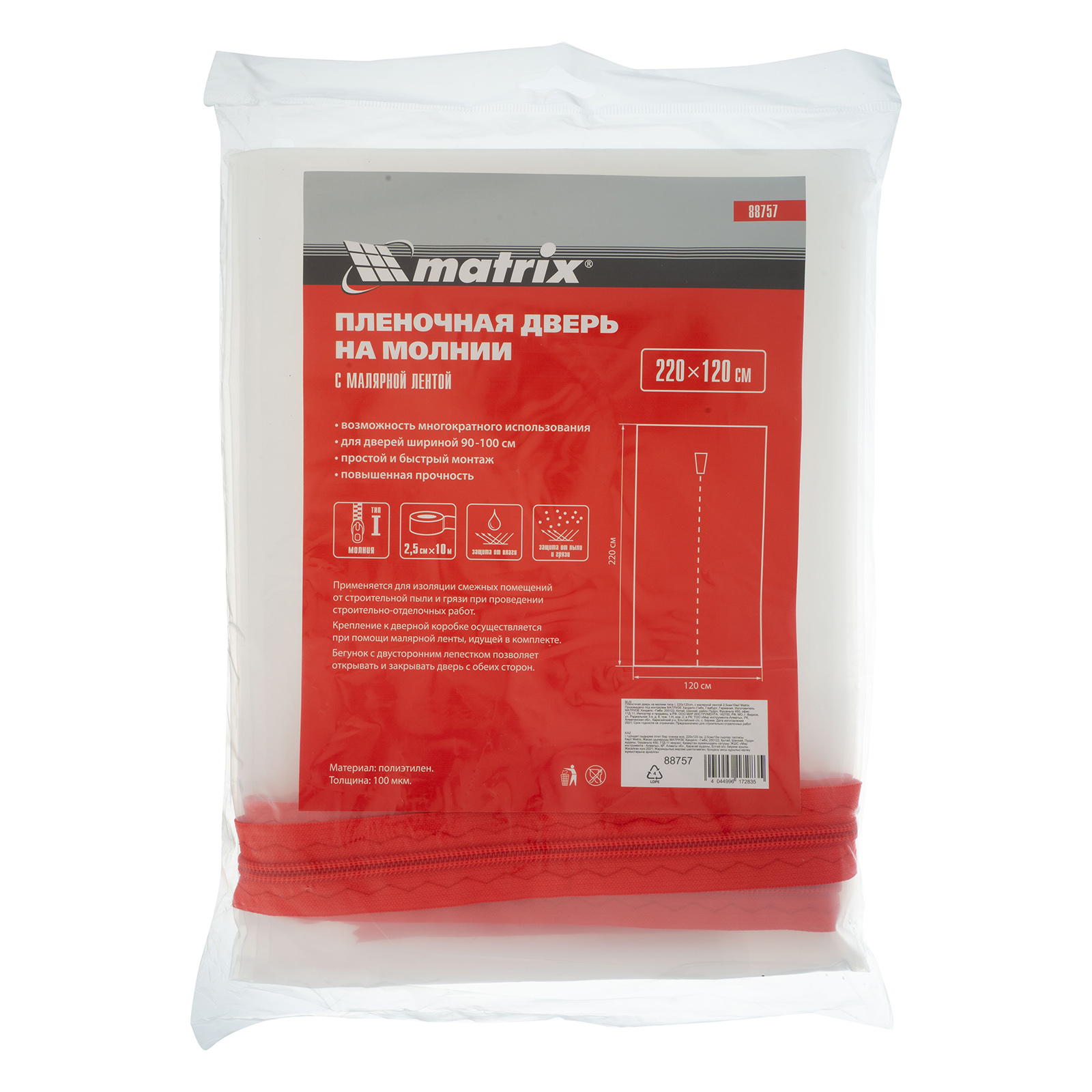 Пленочная дверь на молнии типа I Matrix 88757 размером 220 х 120 см, с малярной лентой 2,5 см х 10 м, используется во время отделки помещений. Позволяет уберечь дверь от загрязнений, попадания стружки, химических веществ при проведении ремонтных, покрасочных, облицовочных работ. Подходит для защиты дверных проемов шириной 90-100 см.