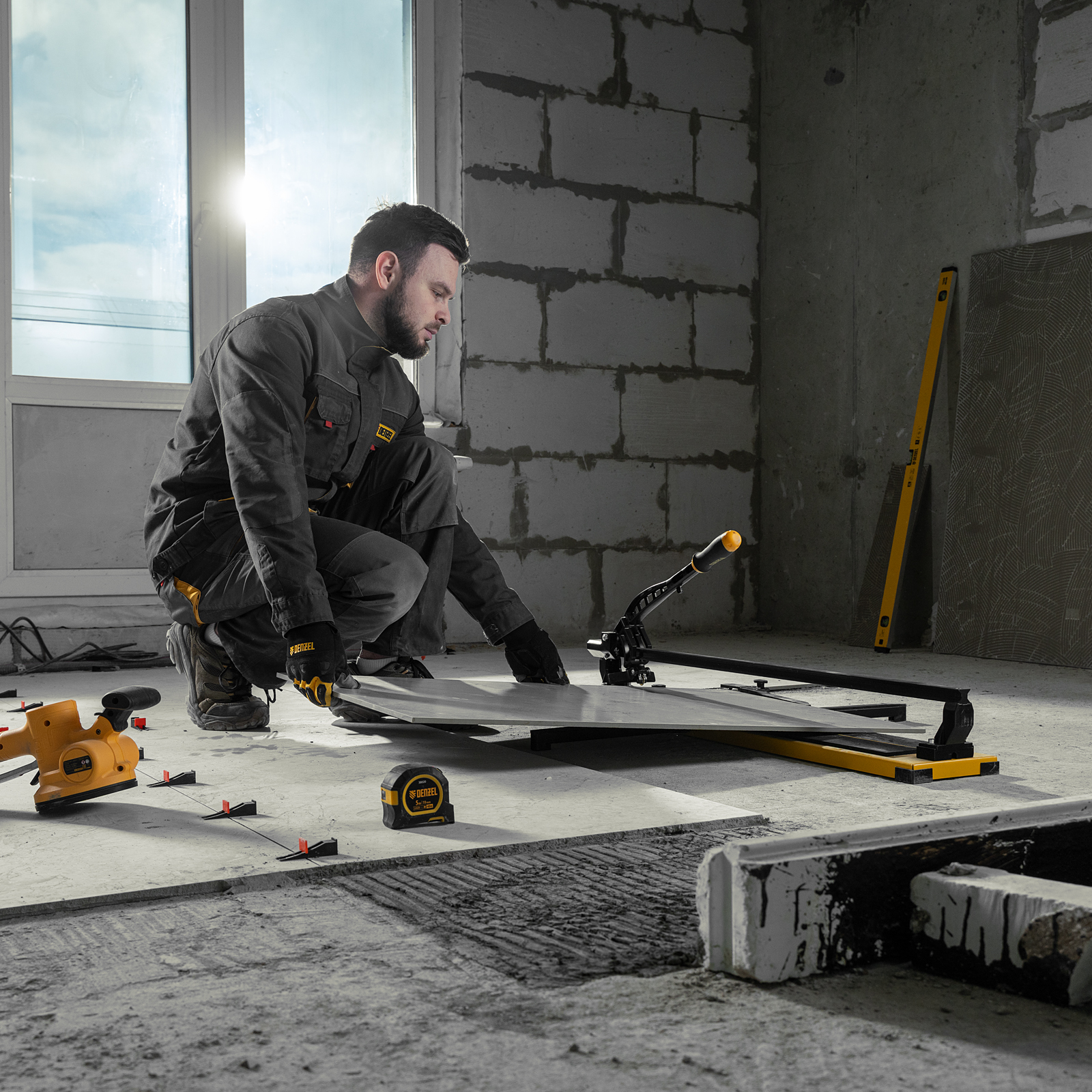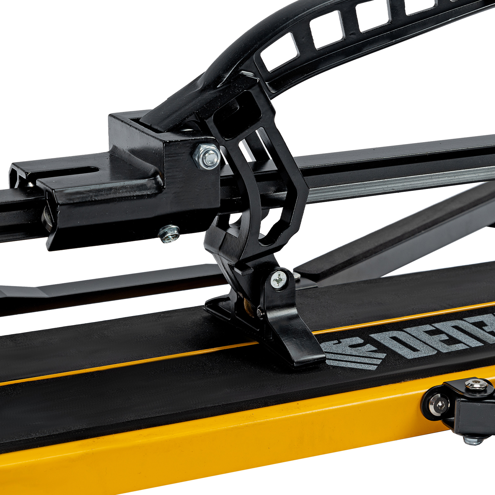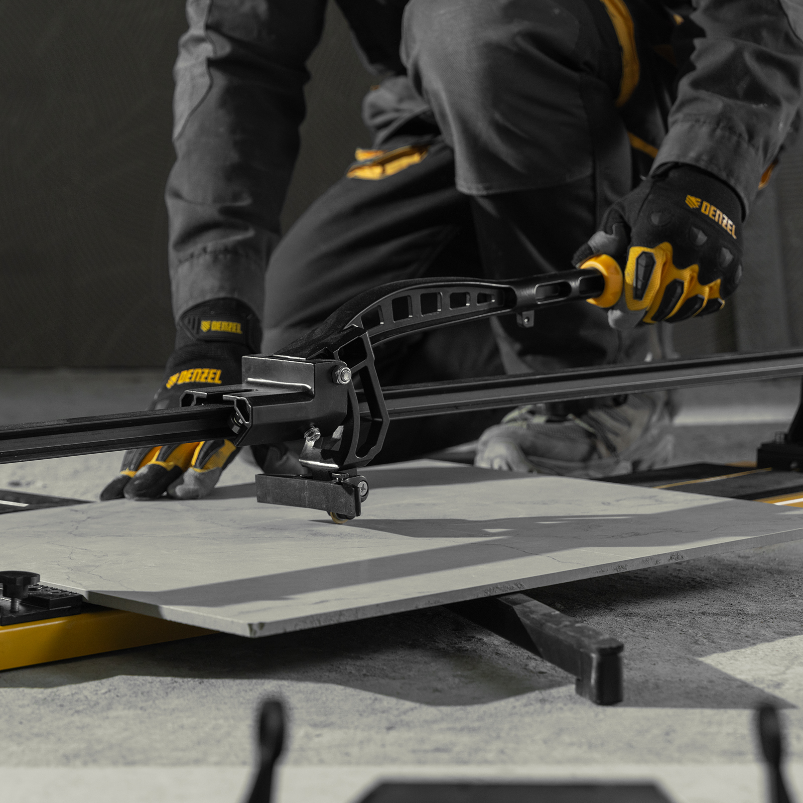 - Удобная работа — благодаря противоскользящим накладкам плиткорез не смещается даже на гладких поверхностях.