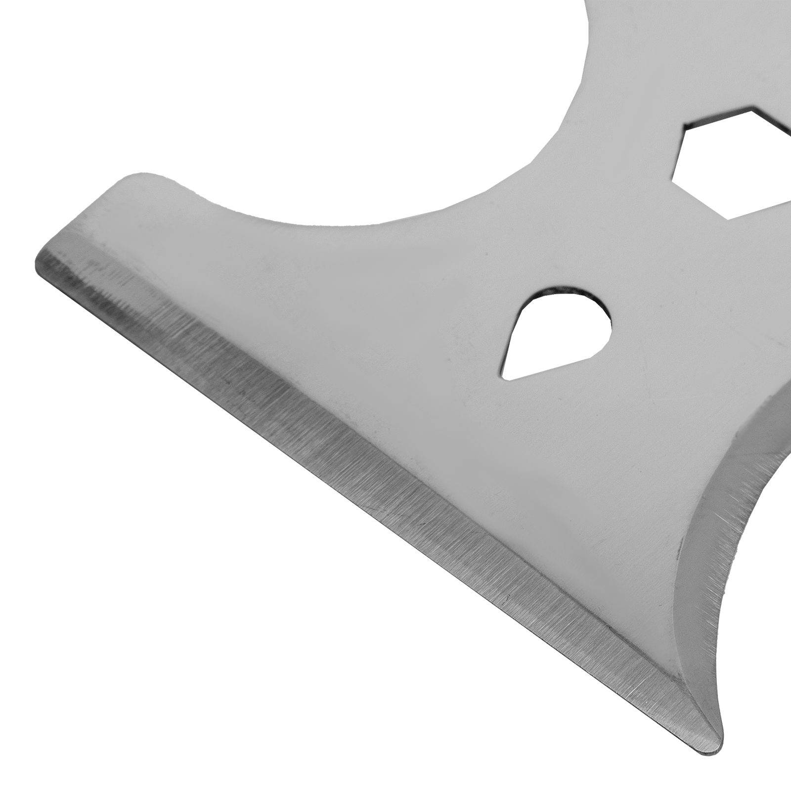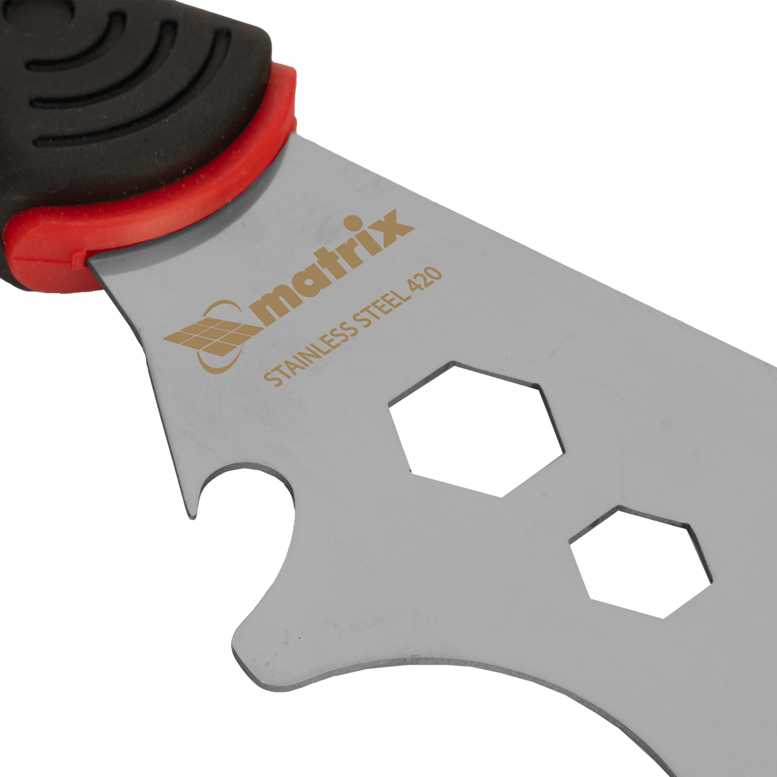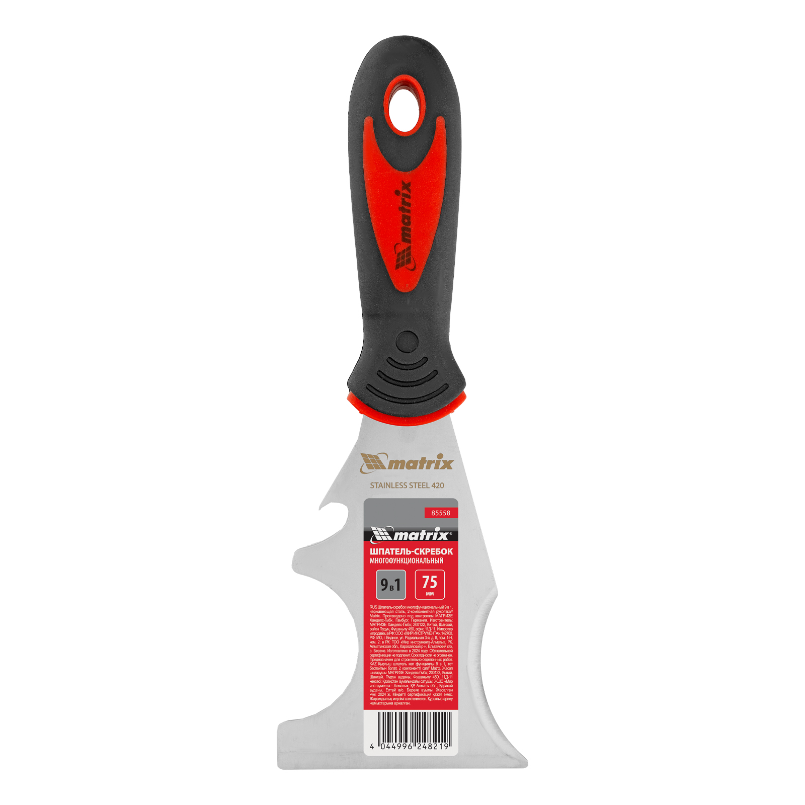 Многофункциональный шпатель-скребок Matrix 85558 9 в 1 с двухкомпонентной рукояткой имеет лезвие сложной конфигурации из нержавеющей стали. Используется для очищения поверхностей от шпатлевки, остатков цемента, зачистки труб и т. д. На жестком полированном полотне с лезвием шириной 75 мм предусмотрены выемки различной формы, благодаря которым инструмент можно использовать в качестве ключа на 11 и 15 мм, а также применять для очистки валиков, извлечения гвоздей, поддевания предметов, открывания банок с краской, равномерного нанесения смесей и выполнения прочих работ.