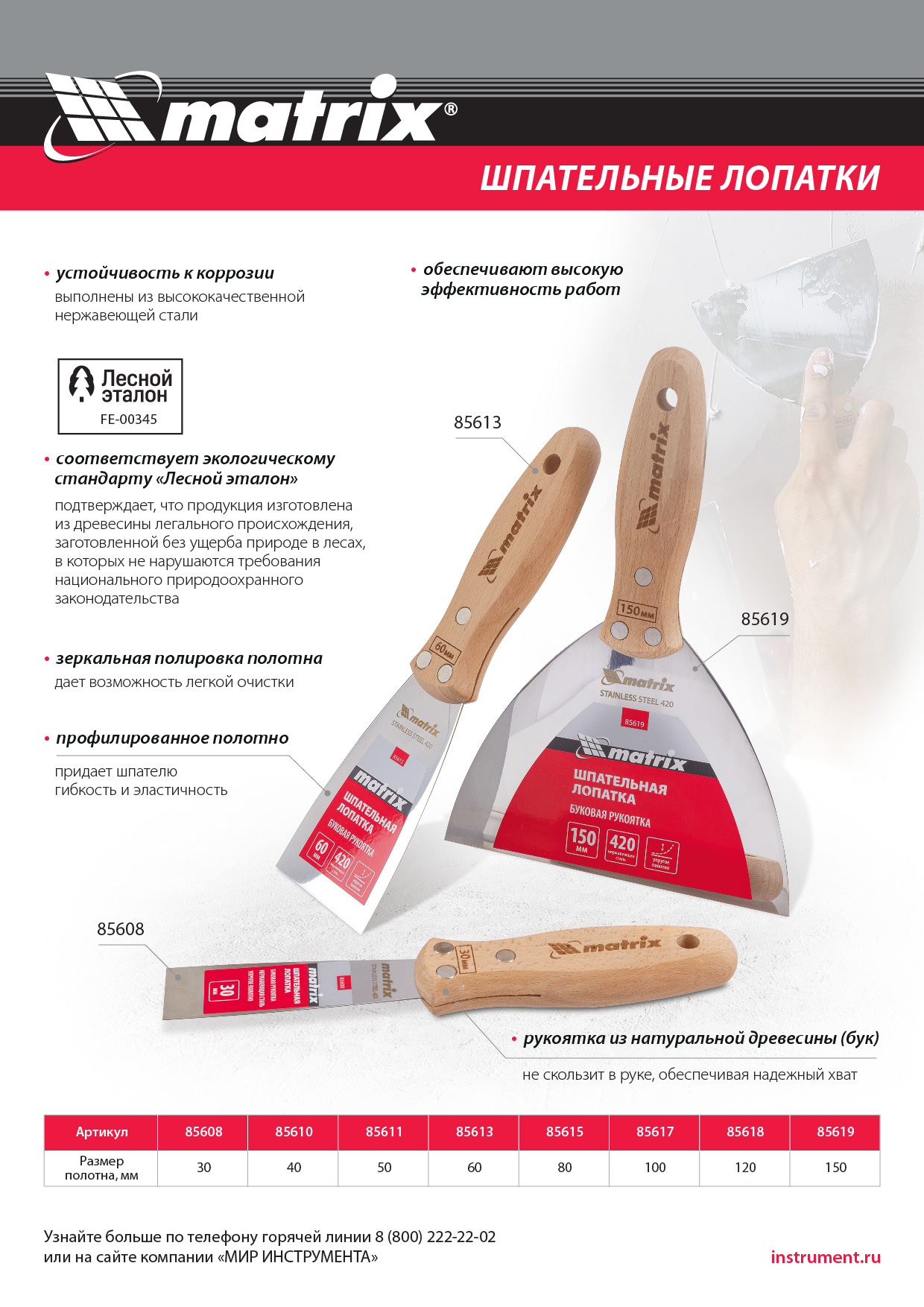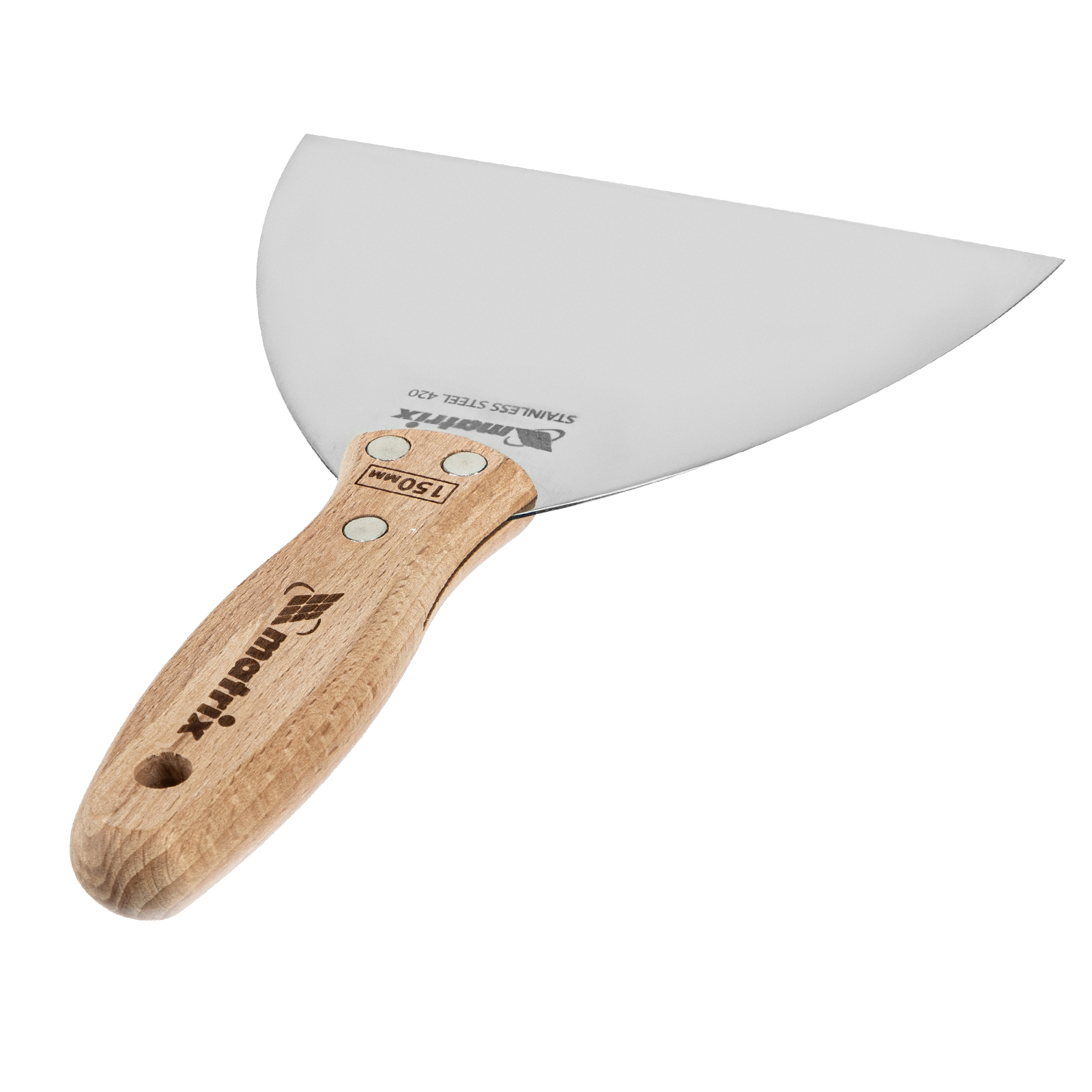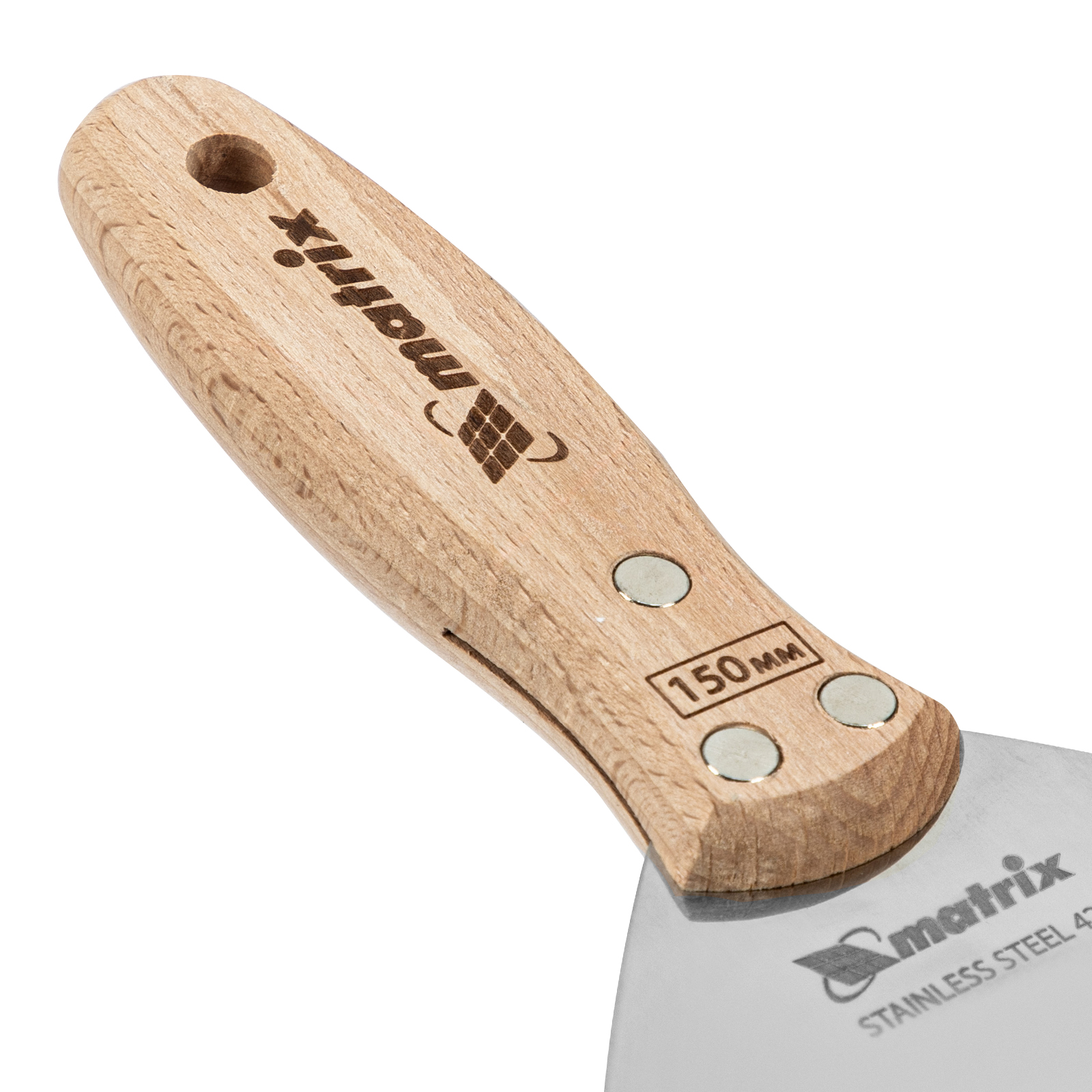 Шпательная лопатка Matrix 85619 с полотном из нержавеющей стали шириной 150 мм и буковой рукояткой предназначена для работы со строительными растворами. Применяется для нанесения различных смесей на поверхности, шпатлевания трещин и неровностей.