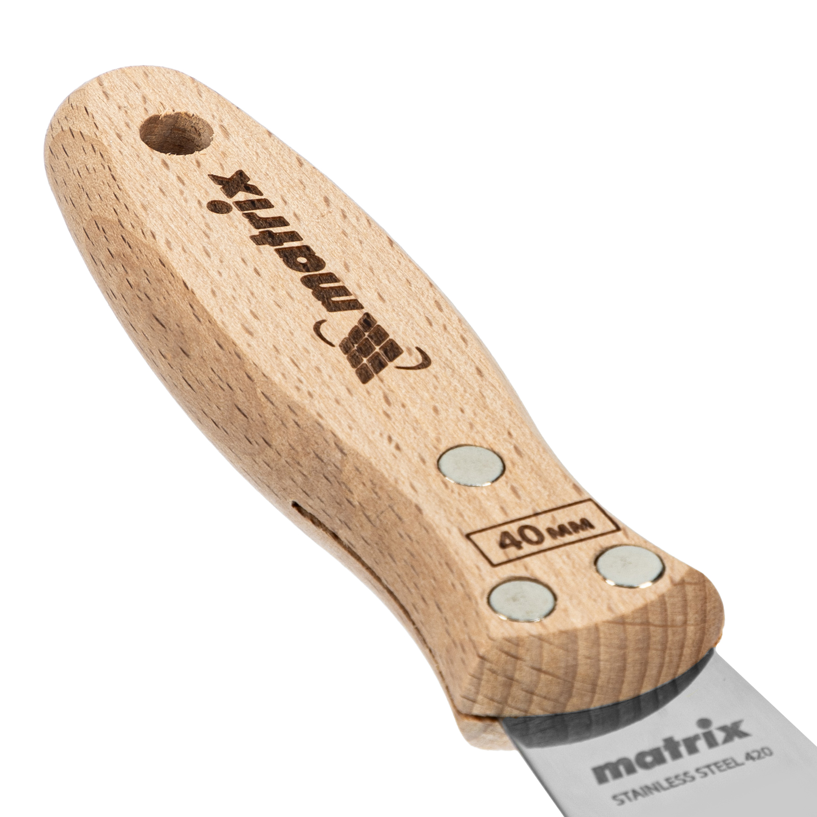 Шпательная лопатка Matrix 85610 с полотном из нержавеющей стали шириной 40 мм и буковой рукояткой предназначена для работы со строительными растворами. Применяется для нанесения различных смесей на поверхности, шпатлевания трещин и неровностей.