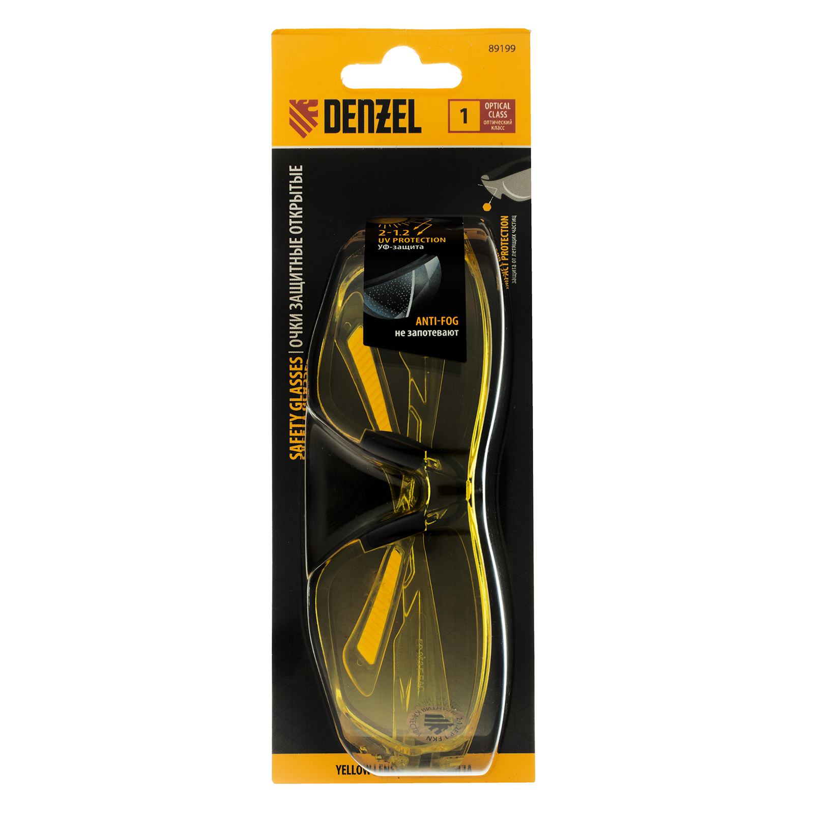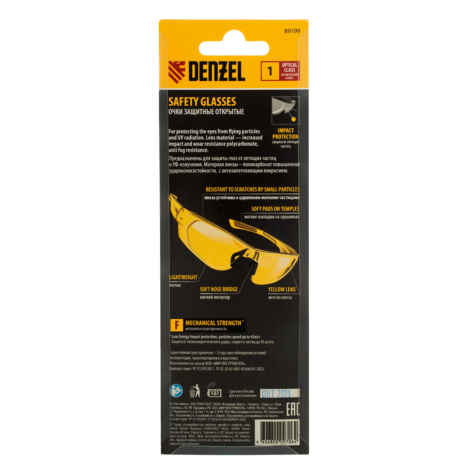 Очки защитные открытые Denzel 89199 с поликарбонатными желтыми линзами предназначены для защиты глаз от механических повреждений и УФ-излучения. Очкам присвоен класс механической прочности F, они обеспечивают защиту от высокоскоростных частиц с низкоэнергетическим ударом (скорость частиц до 45 м/с). Легкие универсальные очки используются во время работы с электро- и бензоинструментом, на производстве и в быту.