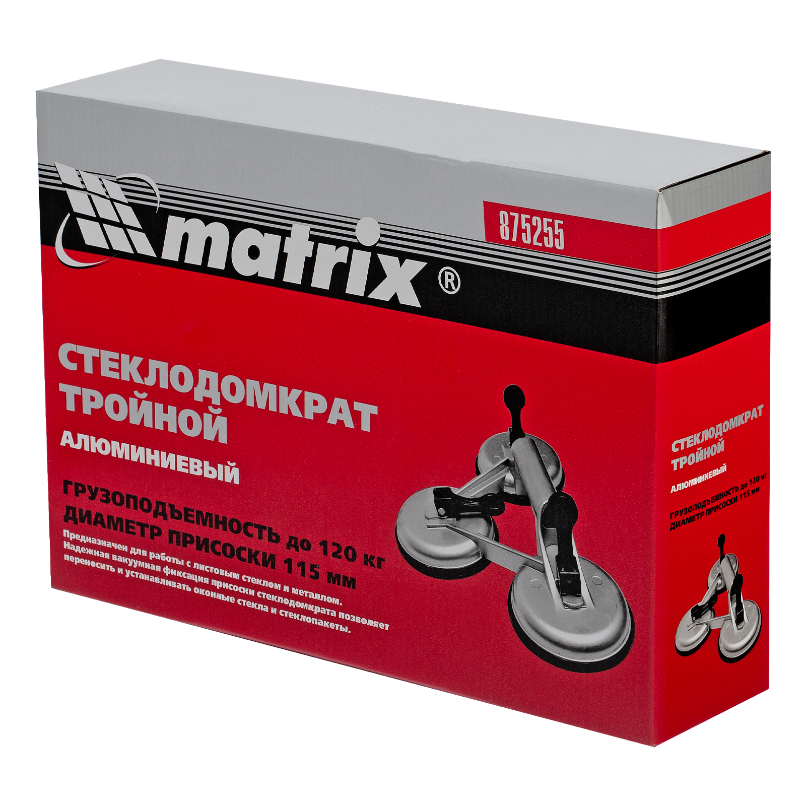 Алюминиевый тройной стеклодомкрат Matrix 875255 позволяет поднимать, переносить и устанавливать стекла, зеркала, плитку, листовой металл и другие гладкие материалы. Имеет три вакуумные присоски, которые бережно и надежно фиксируются на поверхности при помощи зажимов. Стеклодомкрат позволяет длительное время удерживать груз весом до 120 кг. Будет полезен во время строительства, ремонта, а также пригодится в быту.