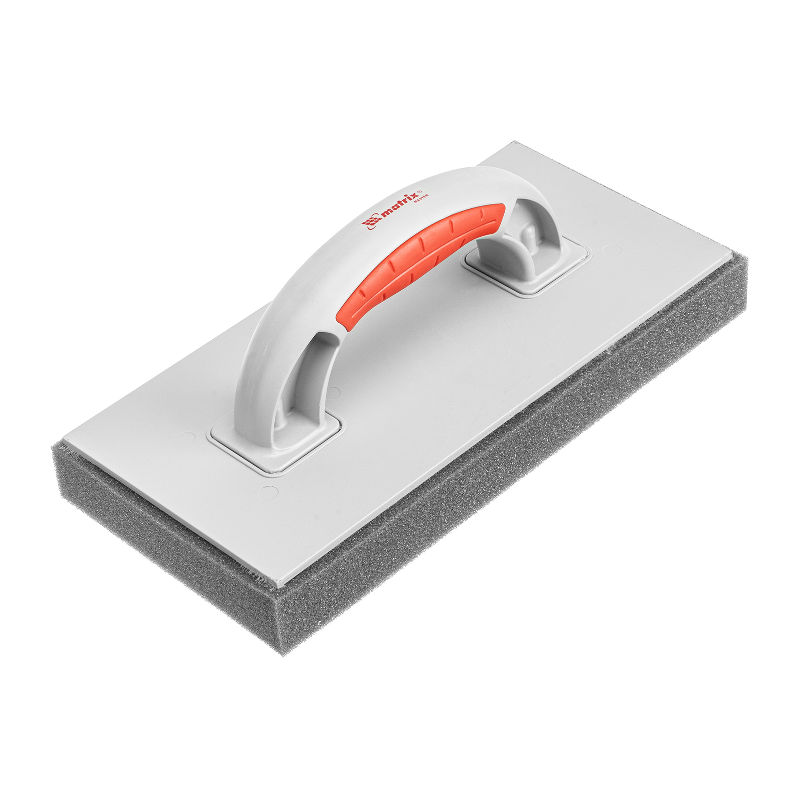 Пластмассовая терка Matrix 86805 размером 270 х 130 мм, с губчатым покрытием высотой 30 мм и двухкомпонентной рукояткой, используется на финишных этапах отделочных работ. Подходит для очищения плитки после нанесения затирки. Инструмент не царапает обрабатываемую поверхность, обеспечивая высокое качество отделки.