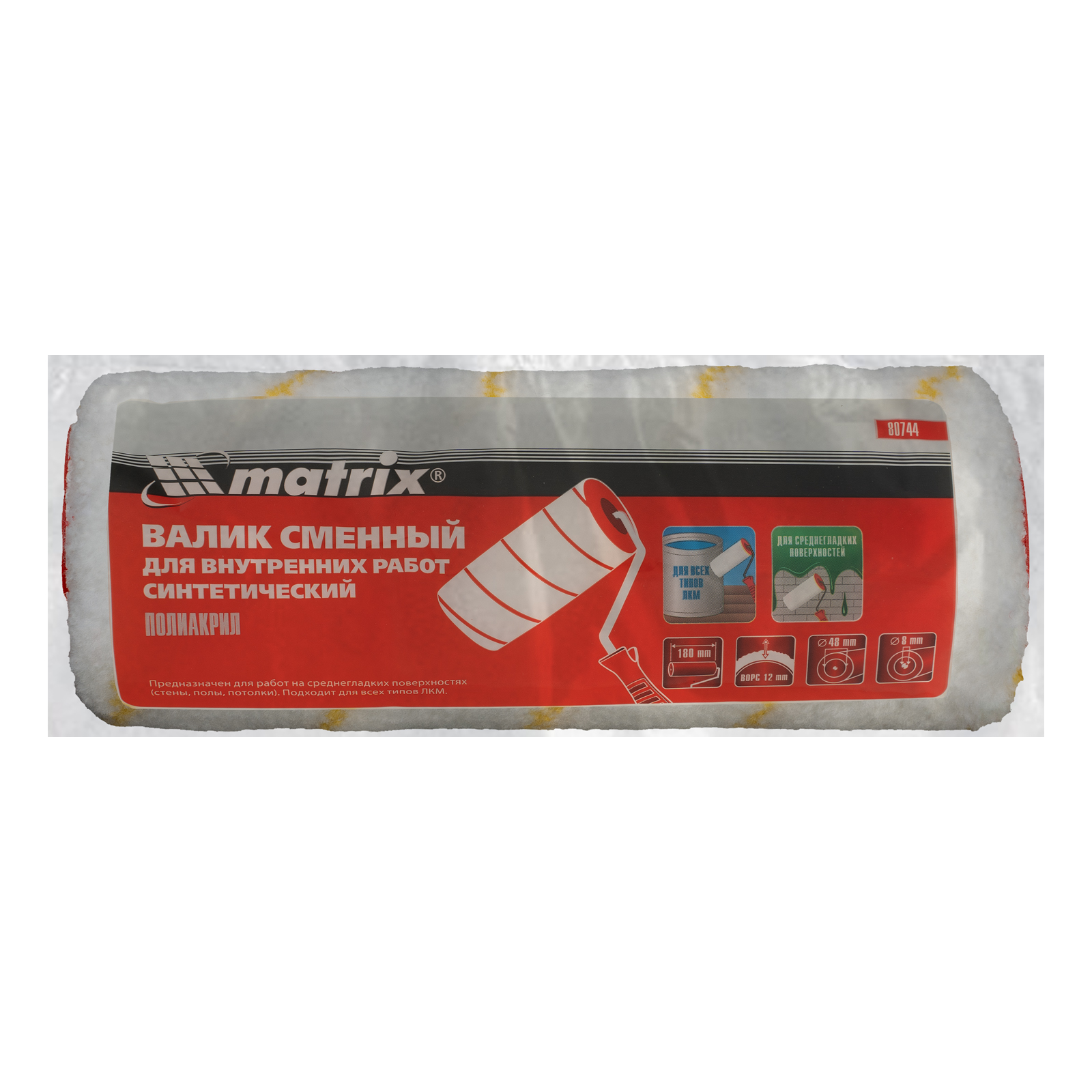 Сменный синтетический валик Matrix 80744 шириной 180 мм и диаметром 48 мм, под бюгель диаметром 8 мм, с ворсом 12 мм из полиакрила, оптимален для проведения малярных работ внутри помещений. Шубка с ворсом длиной 12 мм подходит для окрашивания средне-гладких поверхностей: полов, стен и потолков. Полиакрил в составе обеспечивает высокое качество работ с любыми типами ЛКМ, делает шубку износоустойчивой и формостойкой.