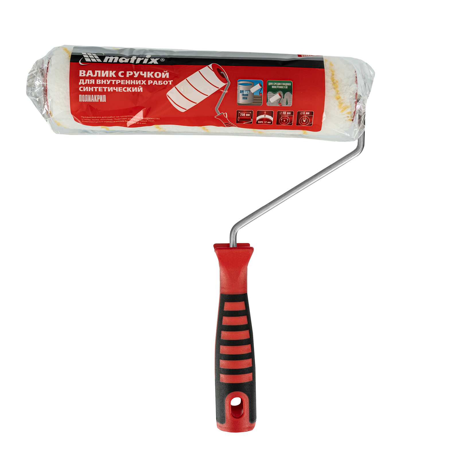 Синтетический валик для внутренних работ Matrix 80661 с двухкомпонентной ручкой 6 мм, ворсом 12 мм из полиакрила, шириной ролика 250 мм и диаметром 48 мм, используется для окрашивания потолков, стен и деревянных поверхностей. Подходит для работы с лакокрасочными материалами любого типа. Шубка из полиакрила устойчива к воздействию агрессивных веществ и хорошо держит форму, что обеспечивает высокое качество работы.
