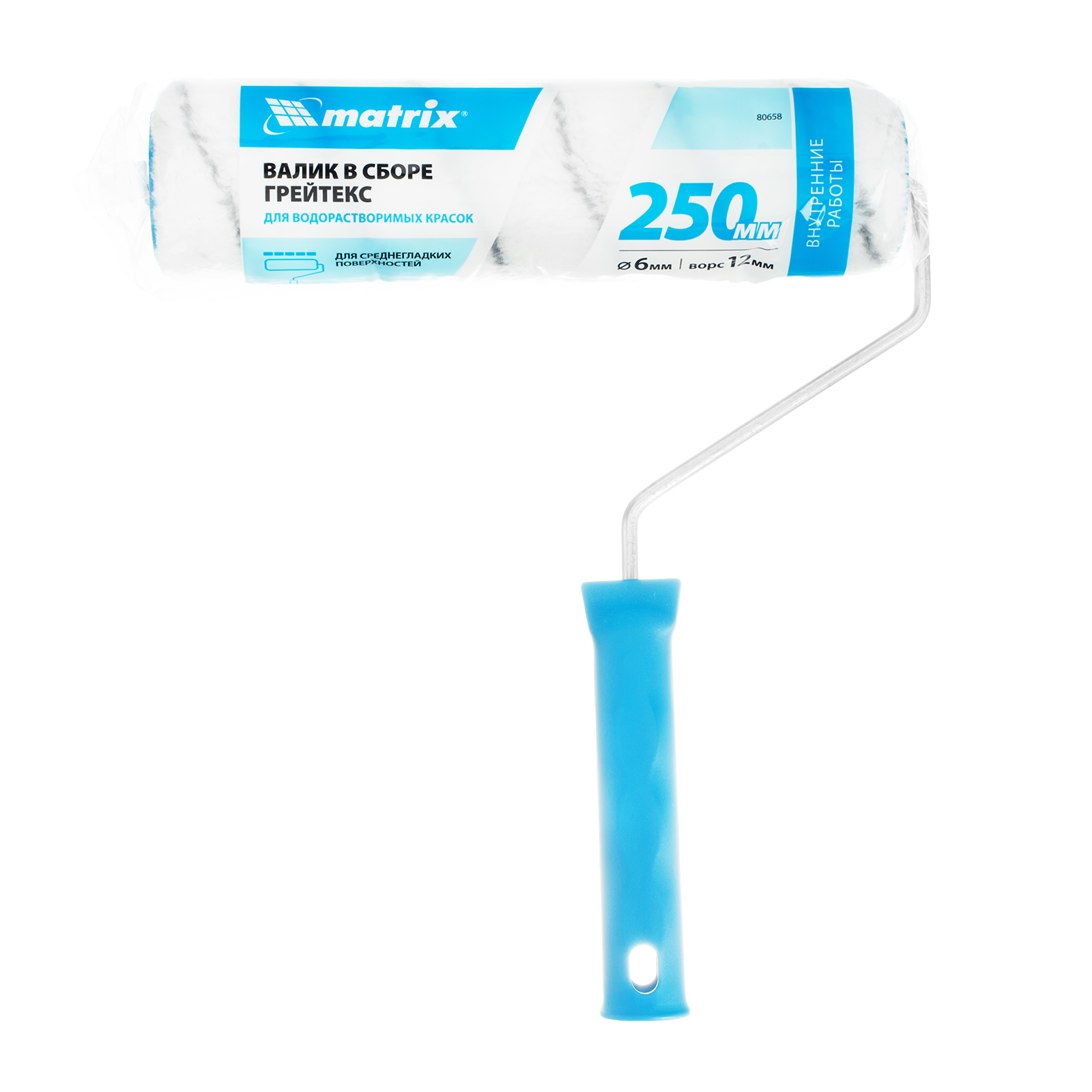 Валик Matrix «ГРЕЙТЕКС» 80658 с ворсом 12 мм из полиакрила, шириной ролика 250 мм и диаметром 48 мм, с ручкой 6 мм, используется для подготовки под покраску поверхностей с гладкой и шероховатой фактурой, а также для окрашивания полов, потолков и стен. Шубка увеличенной плотности из полиакрила устойчива к воздействию растворителей, поэтому подходит для красок любого типа.