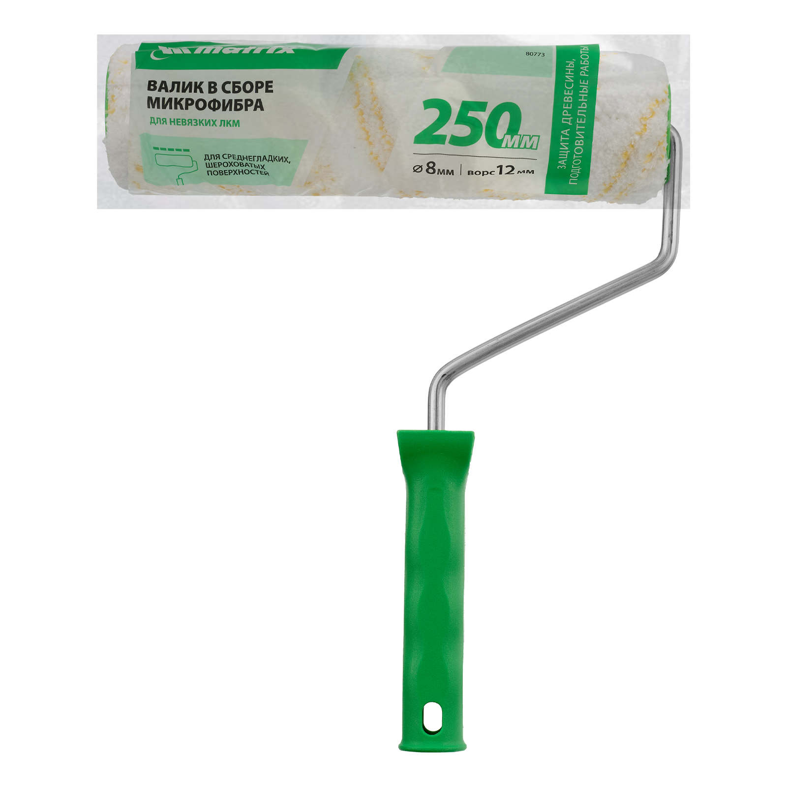 Валик Matrix «МИКРОФИБРА» 80773, 250 х 48 мм, с ворсом 12 мм из полиэстера и бюгелем 8 мм, используется для проведения подготовительных и малярных работ по дереву, стенам, потолкам. Он подходит для нанесения невязких материалов: пропиток, грунтовок, лазури, дисперсионных красок, антисептиков и др. Шубка с ворсом длиной 12 мм оптимальна для большинства поверхностей, в том числе шероховатых.