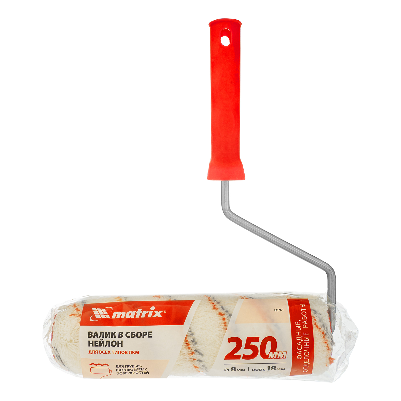 Валик Matrix 80761 «Нейлон Люкс» 250 мм с полиамидным ворсом длиной 18 мм, ручкой диаметром 8 мм, диаметром ролика 48 мм, предназначен для нанесения любых типов лакокрасочных материалов на грубые неровные поверхности. Ширина 250 мм позволяет эффективно и быстро окрашивать большие площади: стены, потолки, фасады и т.д. За счет длины 18 мм ворс прокрашивает самые труднодоступные места, обеспечивая высокое качество окраса.