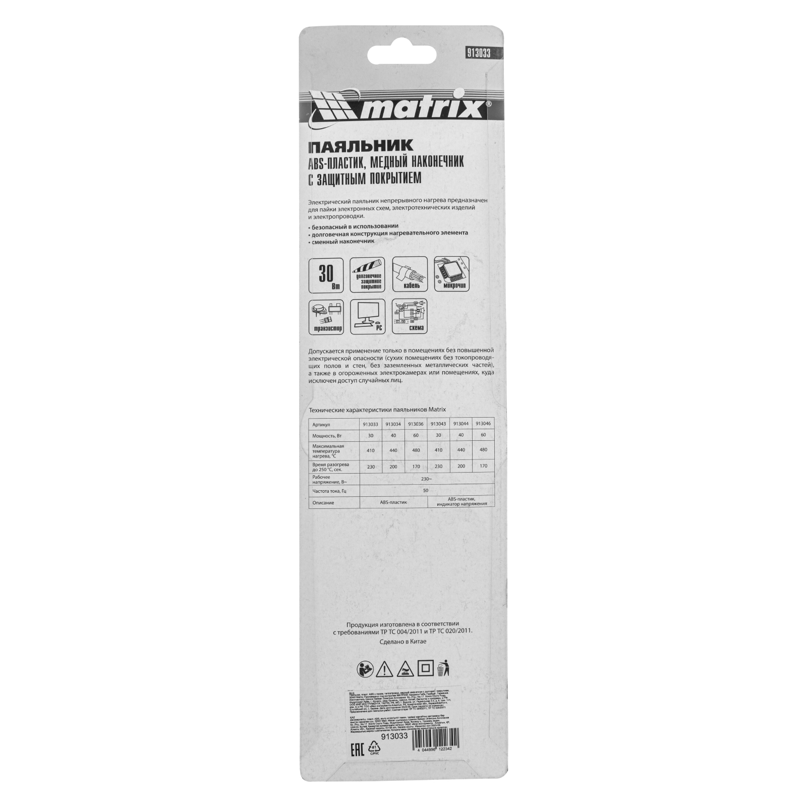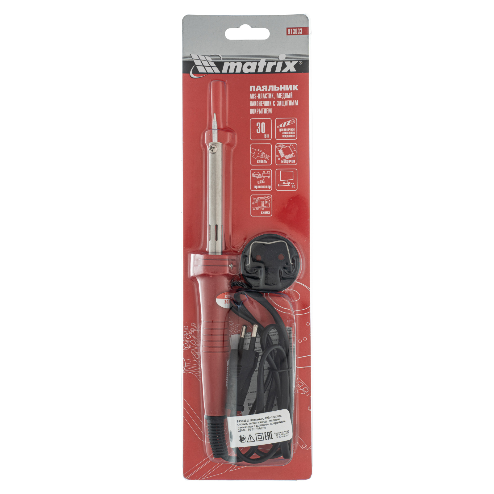 Паяльник Matrix 913033 мощностью 30 Вт используется для пайки транзисторов, микрочипов, электросхем и проводов. В качестве нагревательного элемента использована нихромовая спираль, что снижает риск поломки в случае падения или удара. Конусовидное жало оптимально для проведения точной пайки. Гальваническое покрытие защищает наконечник от внешних воздействий, что продлевает срок службы инструмента. Паяльник пригодится радиолюбителям и домашним мастерам.
