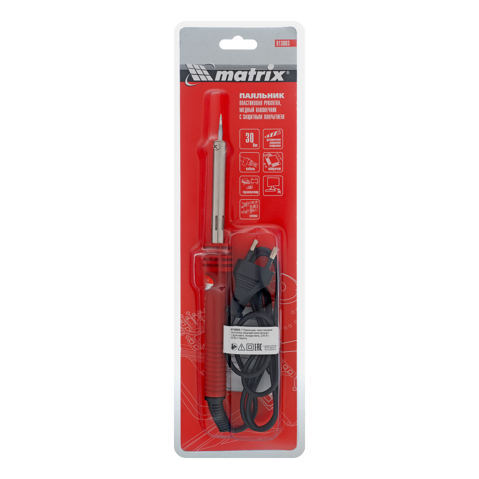 Паяльник Matrix 913003 мощностью 30 W, с пластиковой рукояткой, работающий от сети 220 В, имеет медный наконечник с долговечным гальваническим защитным покрытием, надежно защищающим его от внешних воздействий. Конусовидное жало удобно для выполнения точных работ. Благодаря нагревательному элементу в виде нихромовой спирали паяльник устойчив к повреждениям. Инструмент используется для пайки проводов, микрочипов, электрических схем и транзисторов. Будет полезен для ремонта автомобилей, электроники и бытовой техники.