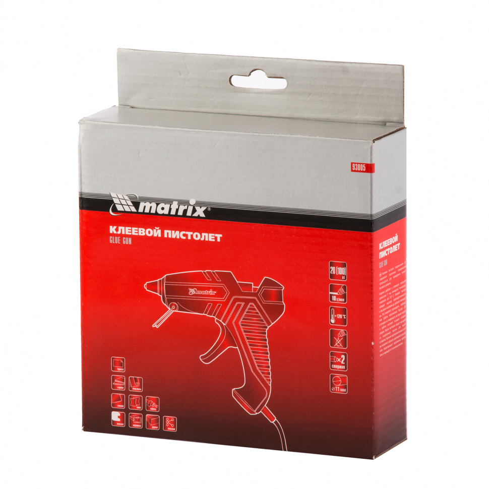 Клеевой пистолет Matrix 93005 мощностью 20 (100) Вт, производительностью 10 г/мин, работает со стержнями диаметром 11 мм. Используется для бытовых и полупрофессиональных нужд: мелкого ремонта, упаковки товаров, фиксации деталей, изготовления игрушек и объемных украшений, декорирования и т.д. Инструмент пригодится моделистам, мастерам отделки и хенд-мейда.