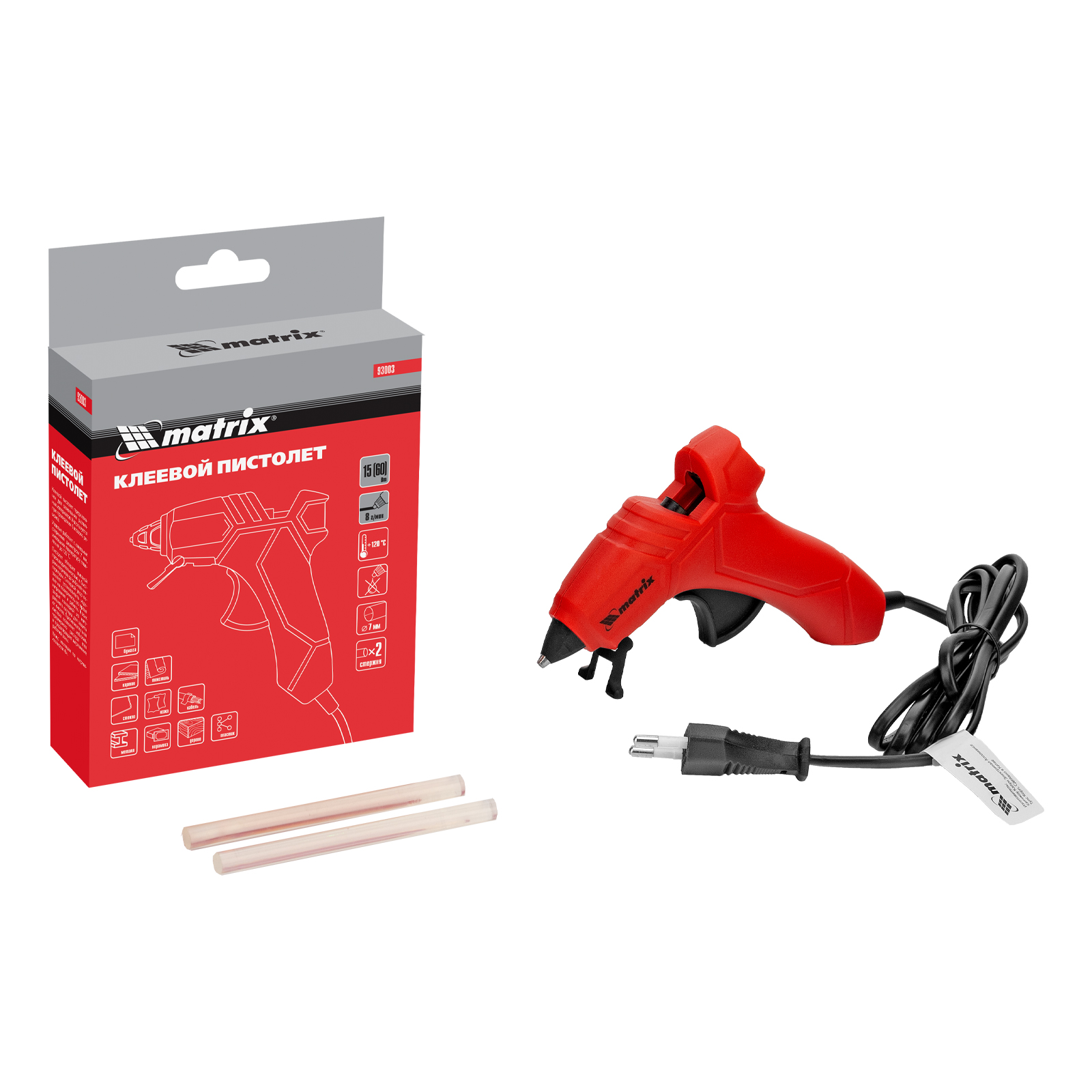 Клеевой пистолет Matrix 93003 потребляет мощность до 60 Вт, расходует 8 г клея в минуту и совместим со стержнями диаметром 7 мм. Позволяет склеивать бумагу, картон, текстиль, кожу, пластик и другие материалы. Время нагрева до рабочей температуры 120 °C — не более 4 минут, что позволяет быстрее приступить к работе. Инструмент используется для бытовых и полупрофессиональных нужд: выполнения мелкого ремонта, упаковки товаров, фиксации деталей, изготовления игрушек и объемных украшений, декорирования и т.д. Инструмент пригодится отделочникам, моделистам и тем, кто занимается хенд-мейдом.