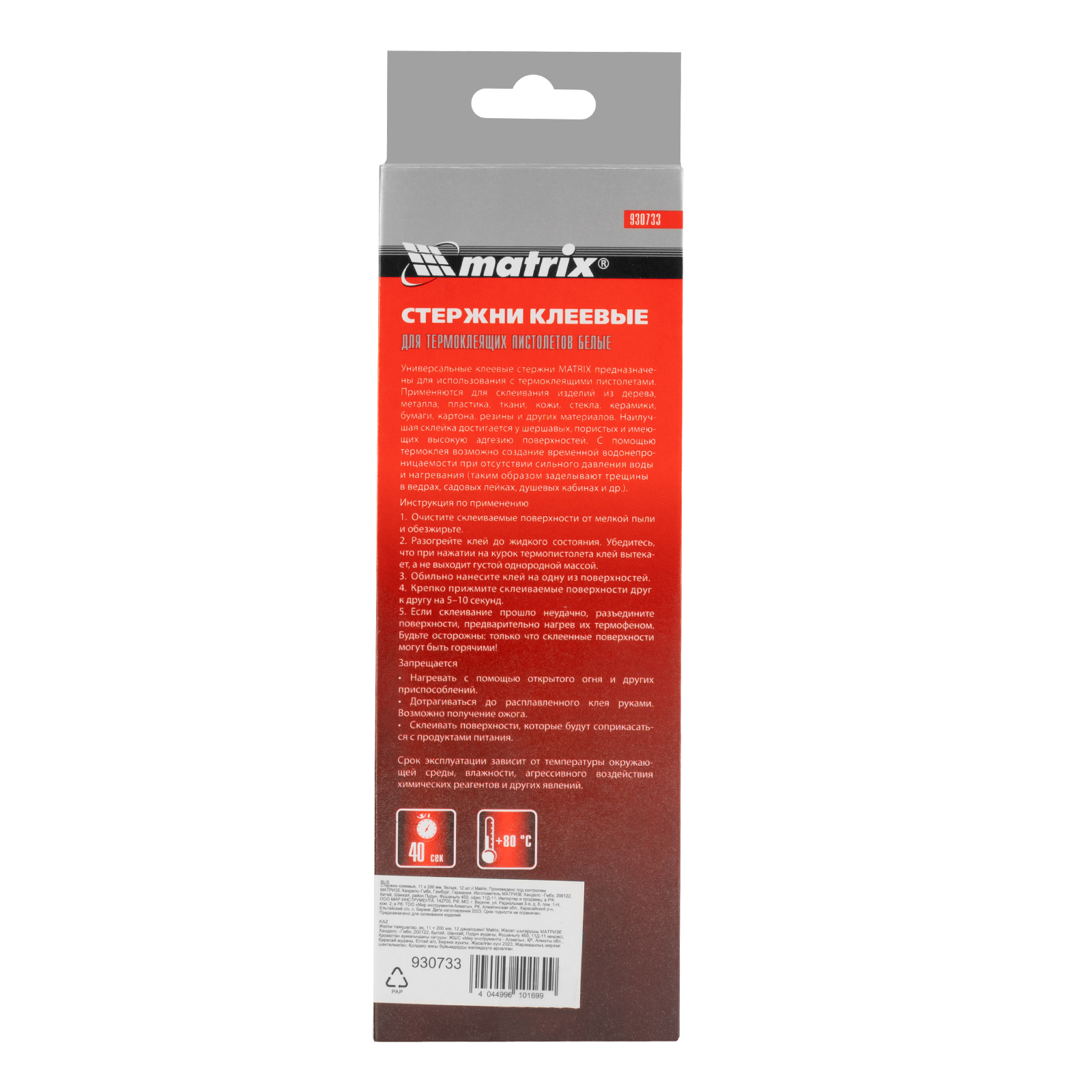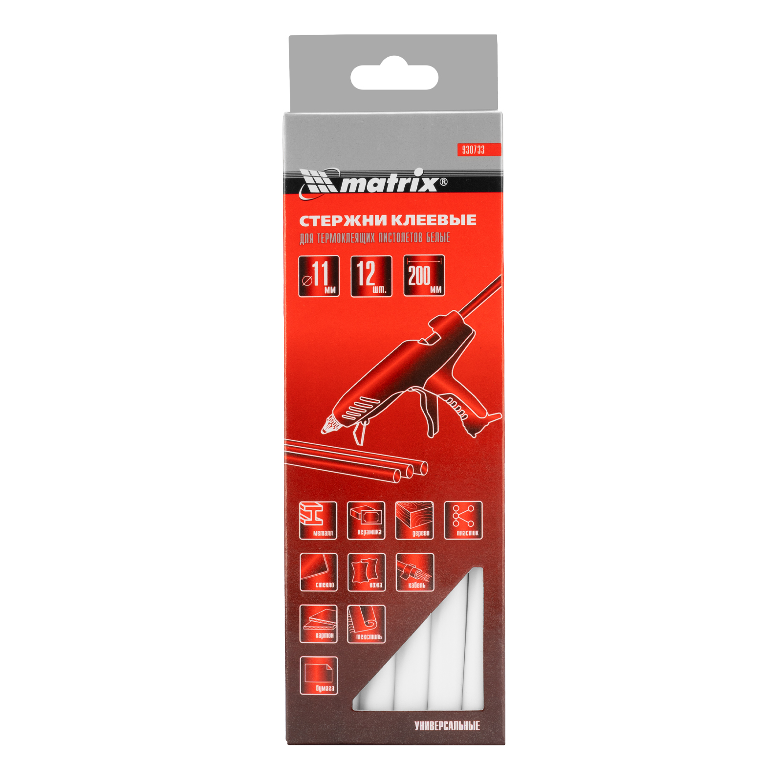Белые клеевые стержни Matrix 930733 длиной 200 мм, 12 шт. в упаковке, — расходные материалы для клеевых пистолетов калибра 11 мм. Обеспечивают надежное сцепление различных материалов: бумаги, пластика, древесины, керамики, электрических плат и т.д. Подходят также для герметизации швов и трещин.