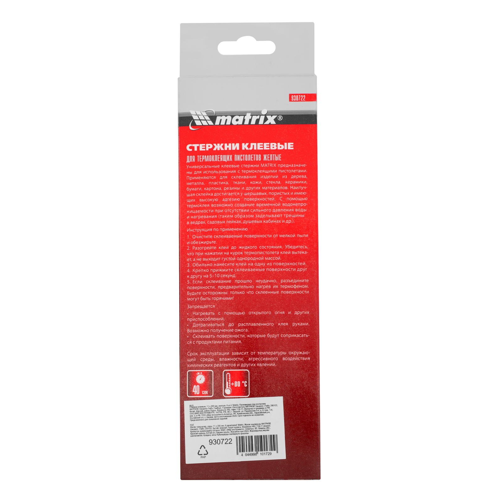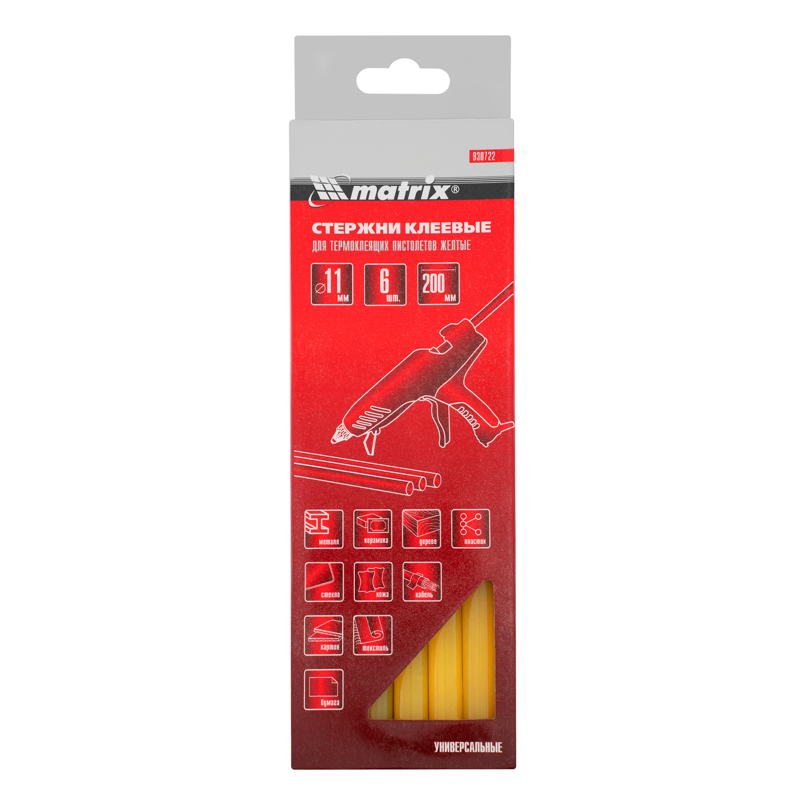 Желтые клеевые стержни Matrix 930722 длиной 200 мм, 6 шт. в упаковке, — расходные материалы для клеевых пистолетов калибра 11 мм. Обеспечивают надежное сцепление различных материалов: бумаги, пластика, древесины, керамики, электрических плат и т.д. Подходят также для герметизации швов и трещин.