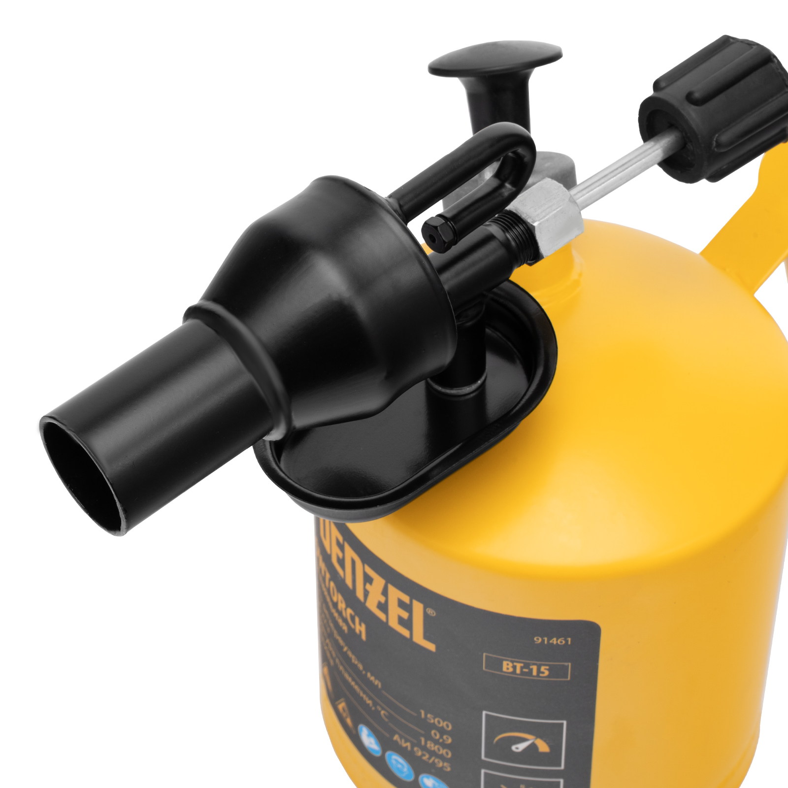 Паяльная лампа Denzel BT-15 91461 с баком объемом 1,5 л предназначена для нагрева поверхностей при помощи открытого направленного пламени. Полной заправки (1,1 л топлива) хватает больше чем на час работы при расходе 0,9 л/ч. Воздушный насос и форсунка высокого давления обеспечивают эффективную подачу топлива к эжектору. Лампа стабильно работает даже в ветреную погоду. Используется при выполнении ремонтных и демонтажных работ: пайки, сварки, ослаблении заклинивших резьбовых соединений, опаливании древесины, снятии лакокрасочных покрытий и других термических работ. Пригодится для обогрева двигателя. Также будет полезна в сельском хозяйстве и в быту.
