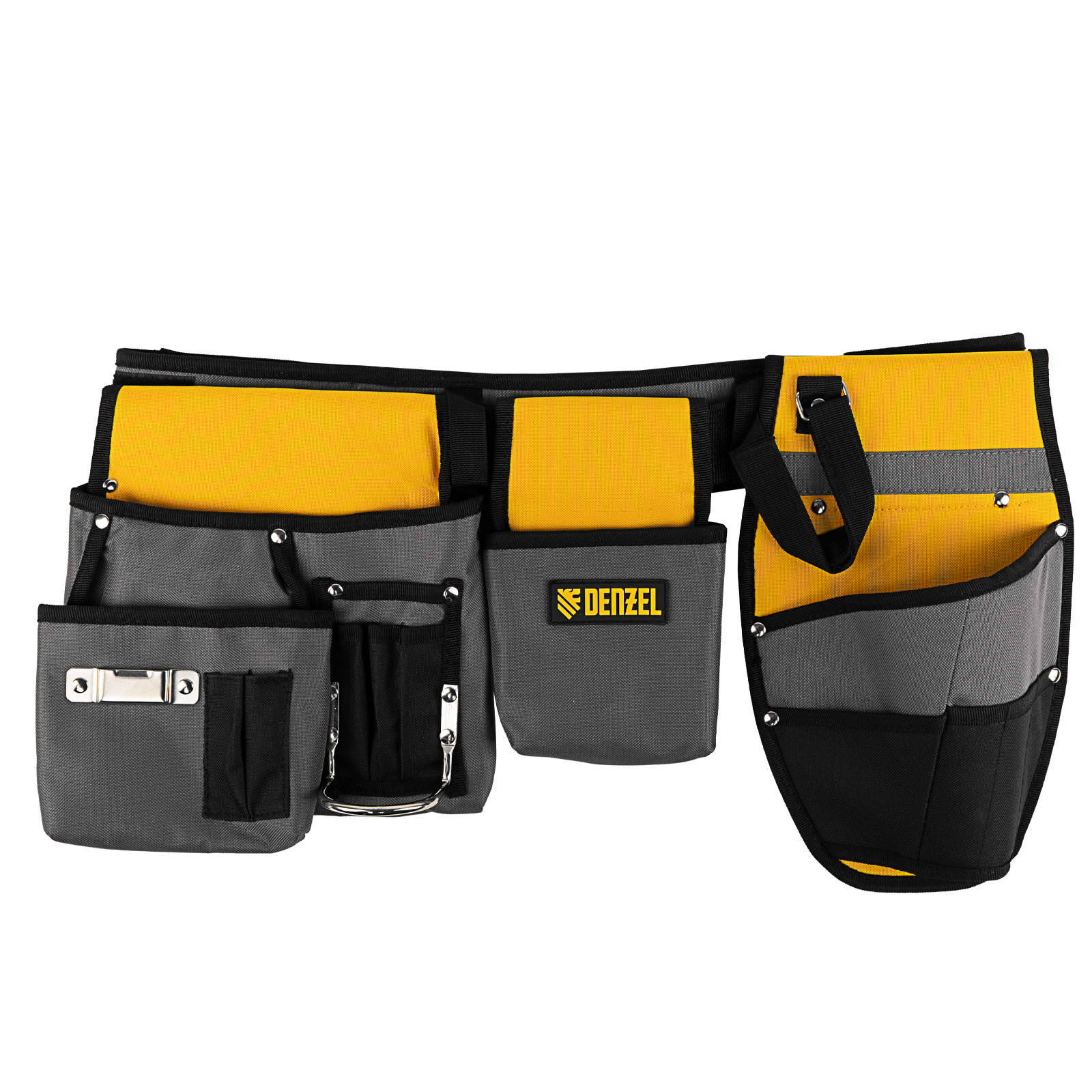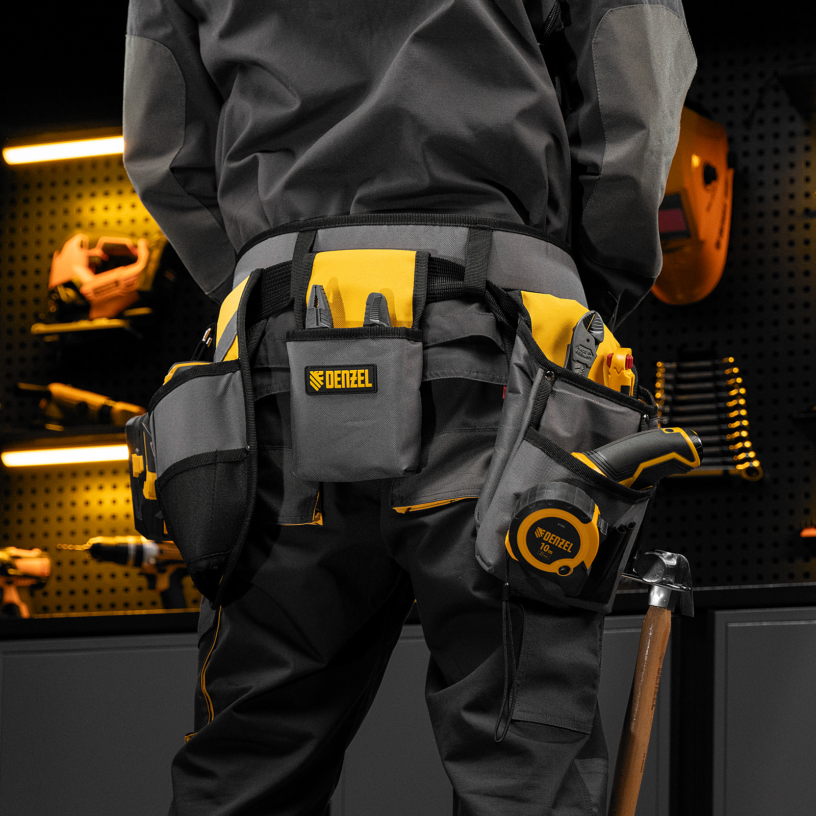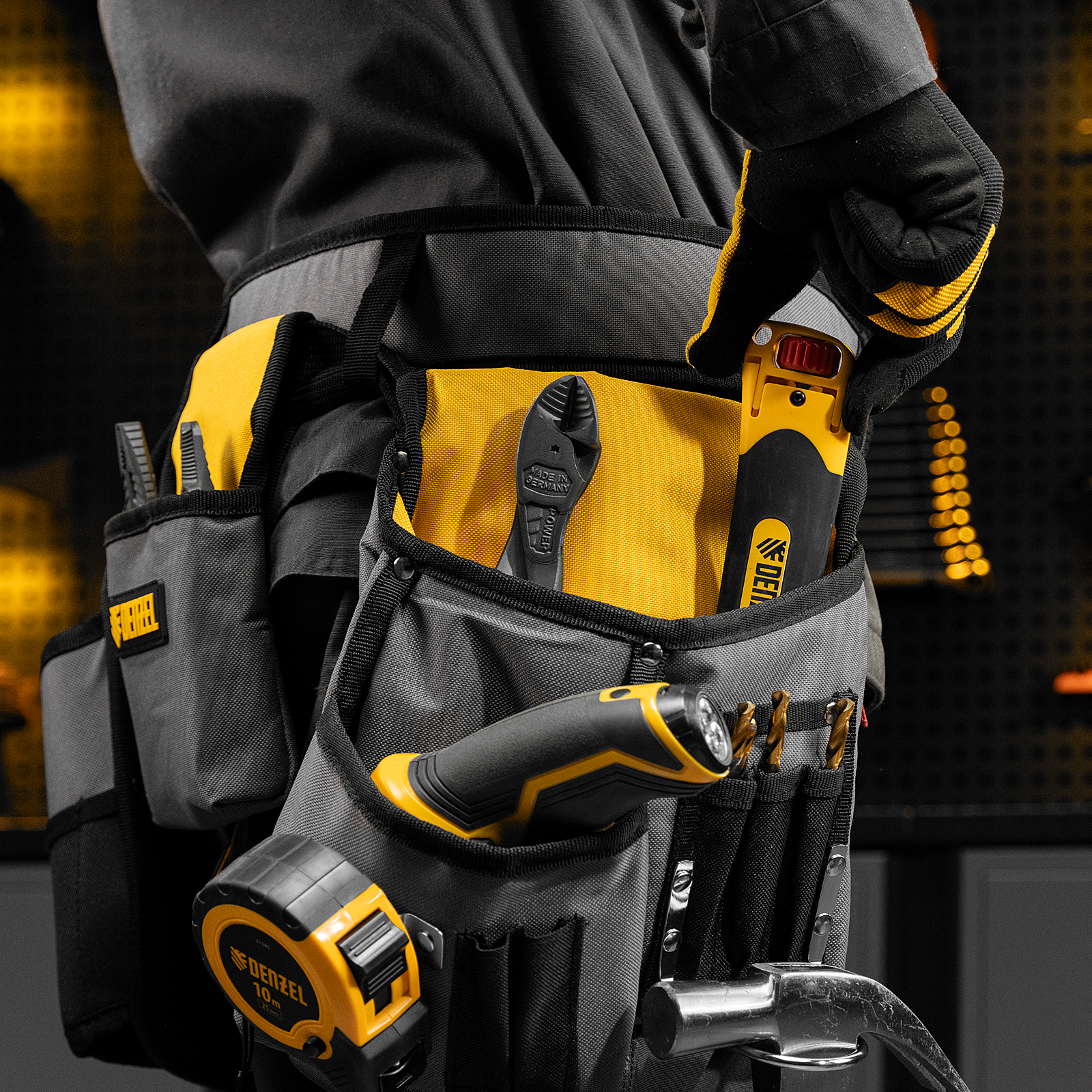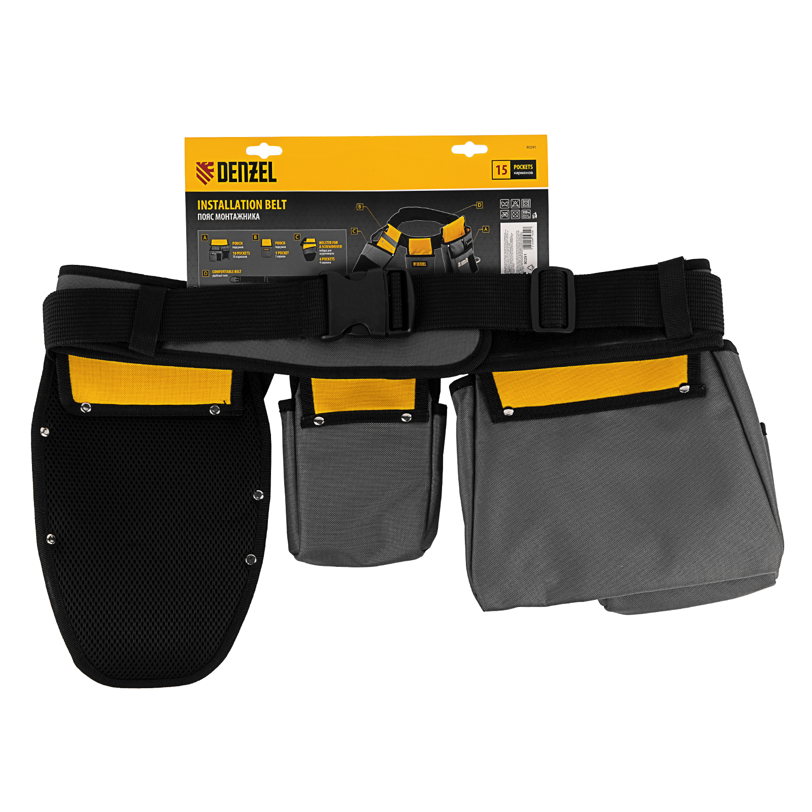 Пояс монтажника Denzel 90291 с поясными сумками и кобурой для шуруповерта позволяет иметь все необходимые инструменты под рукой во время высотных монтажных работ или решения других задач. В 14 карманах и дополнительном подсумке можно разместить инструменты, крепеж и расходники. Для шуруповерта предусмотрена специальная кобура со страховочной петлей.