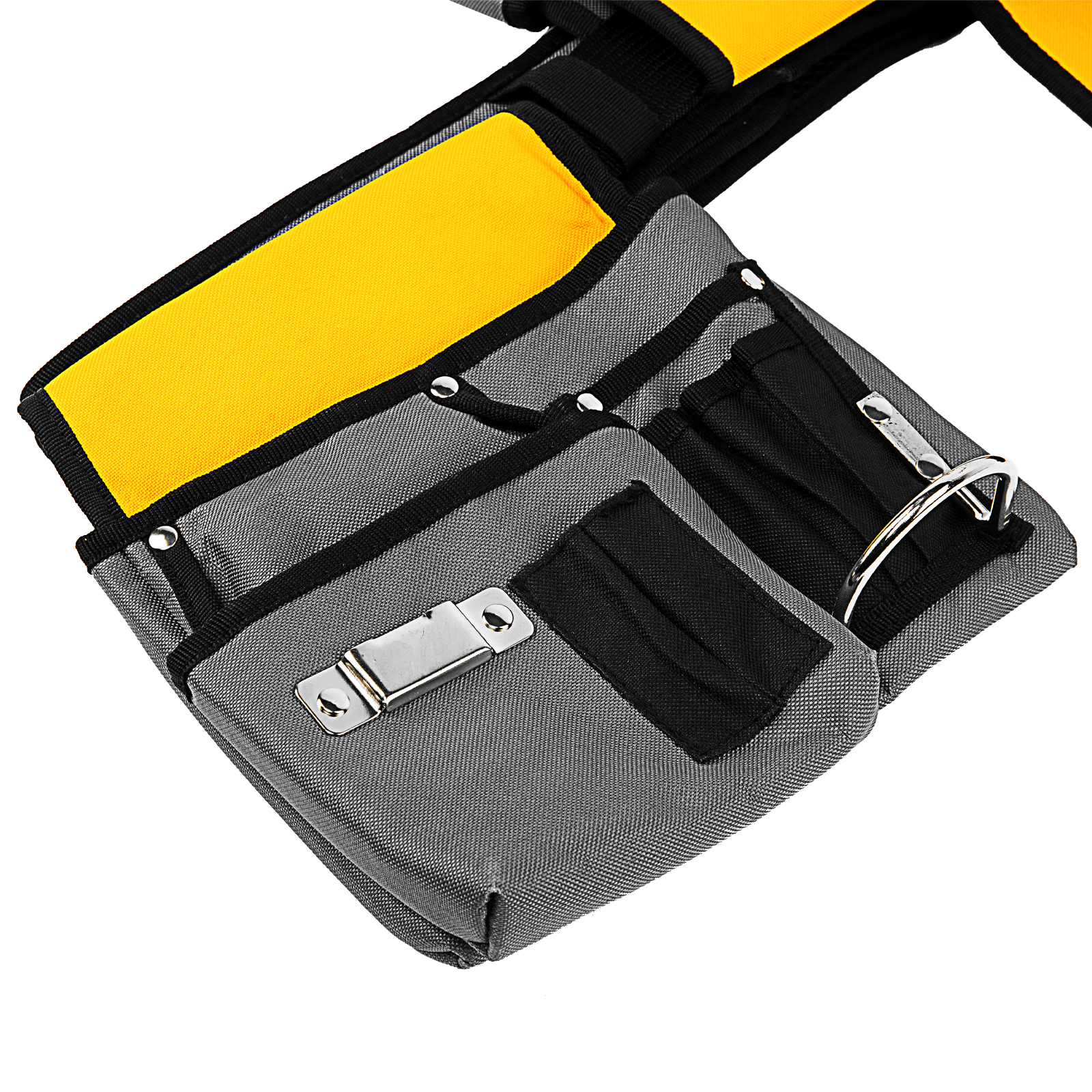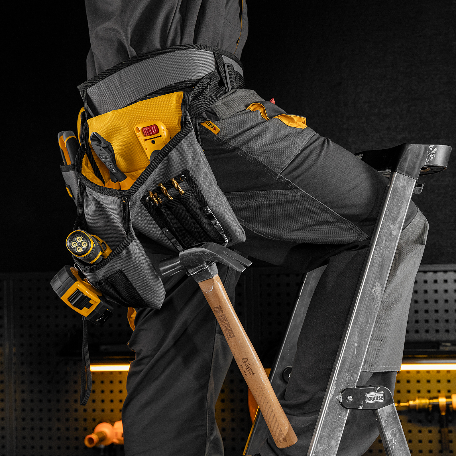 - Дополнительные возможности — на поясе предусмотрен держатель для молотка на стальных заклепках и крепление для рулетки.
