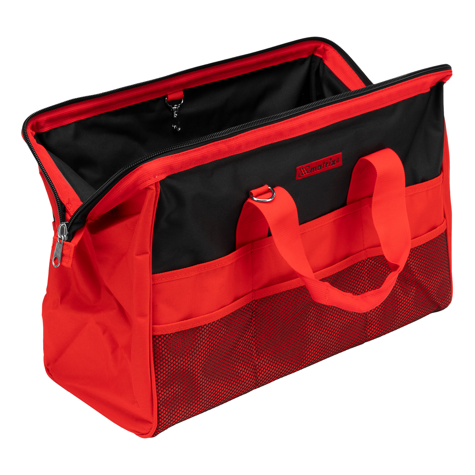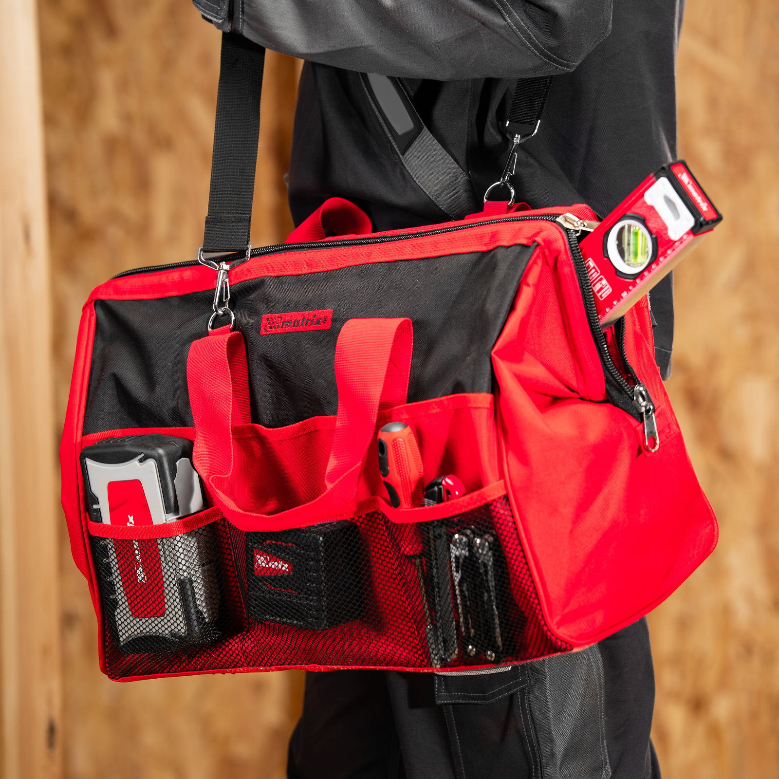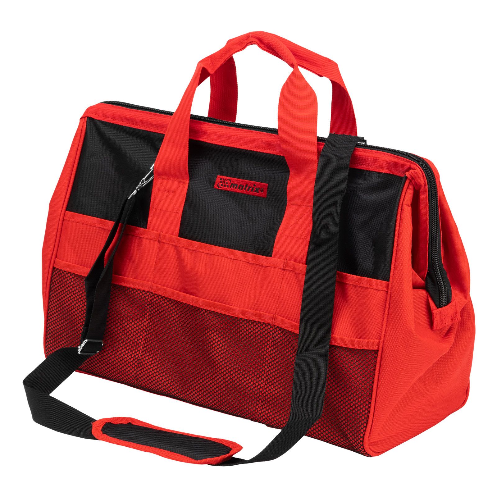 Сумка Matrix 90252 с 18 карманами, размером 510 х 210 х 360 мм, предназначена для транспортировки и хранения слесарных или столярных инструментов. Может использоваться для перевозки автопринадлежностей. В 18 карманах и вместительном основном отделении можно разместить инструменты разного размера. Сумка пригодится монтажнику, слесарю, строителю, будет полезна дома и в поездке.