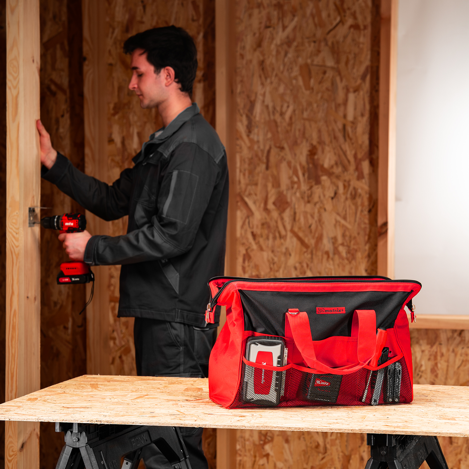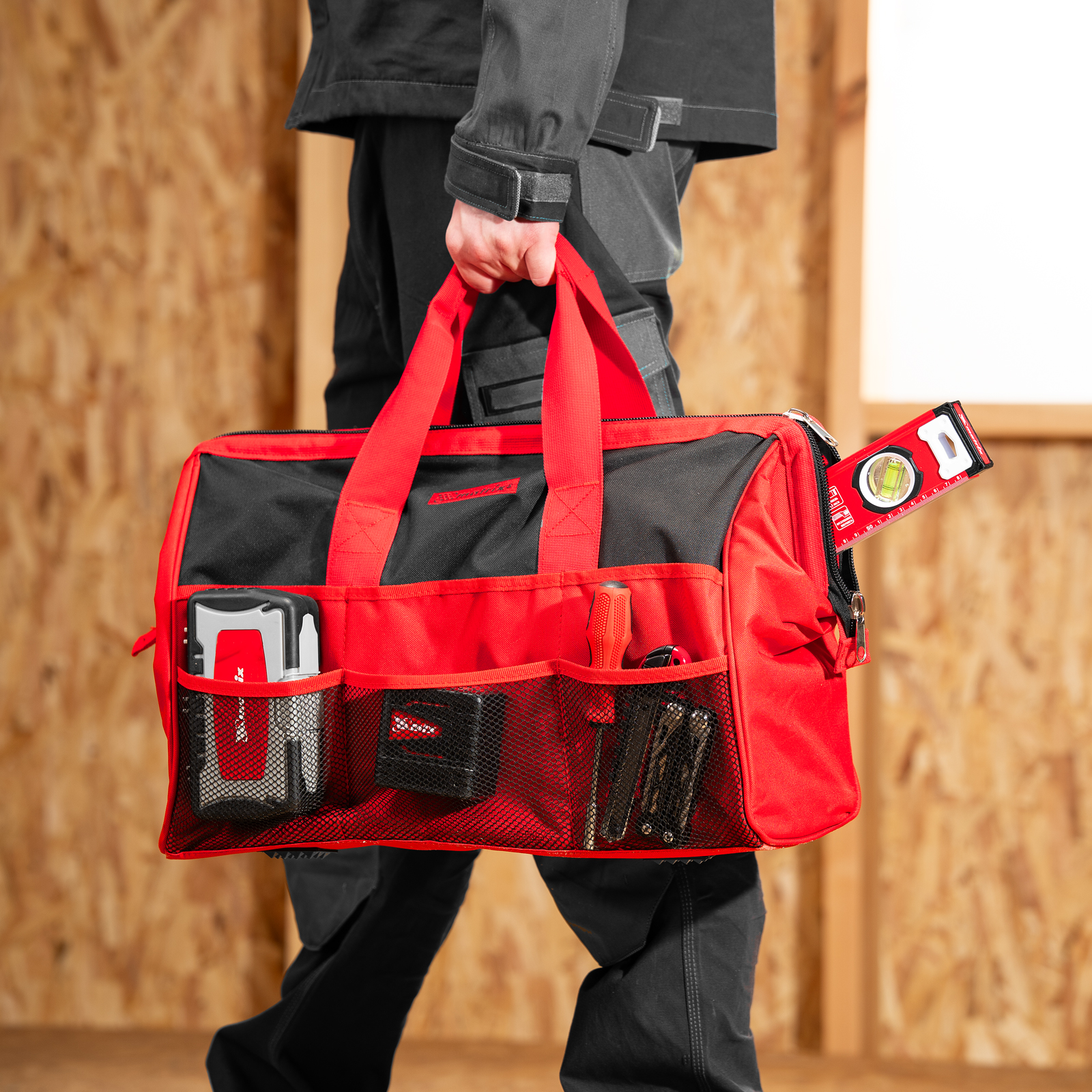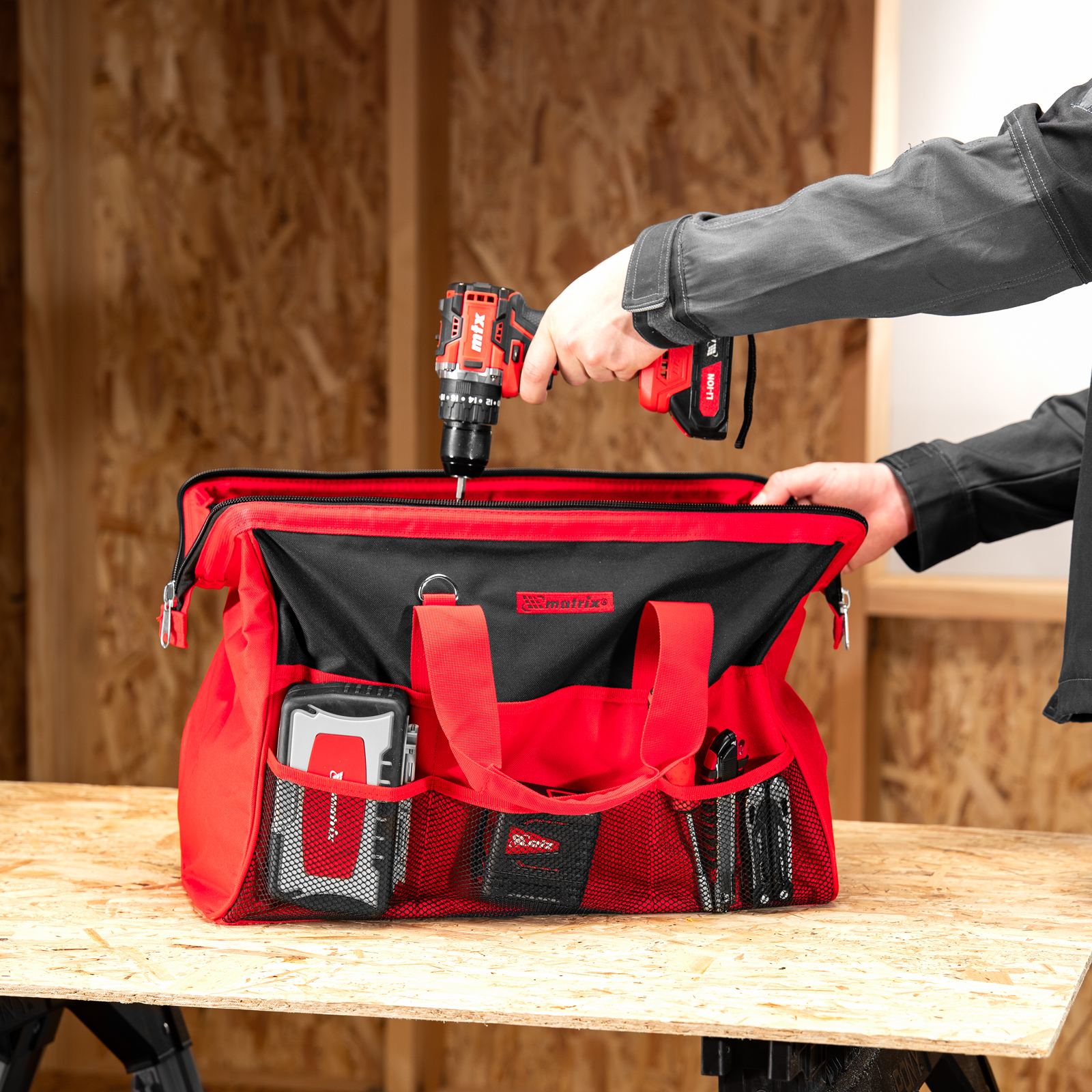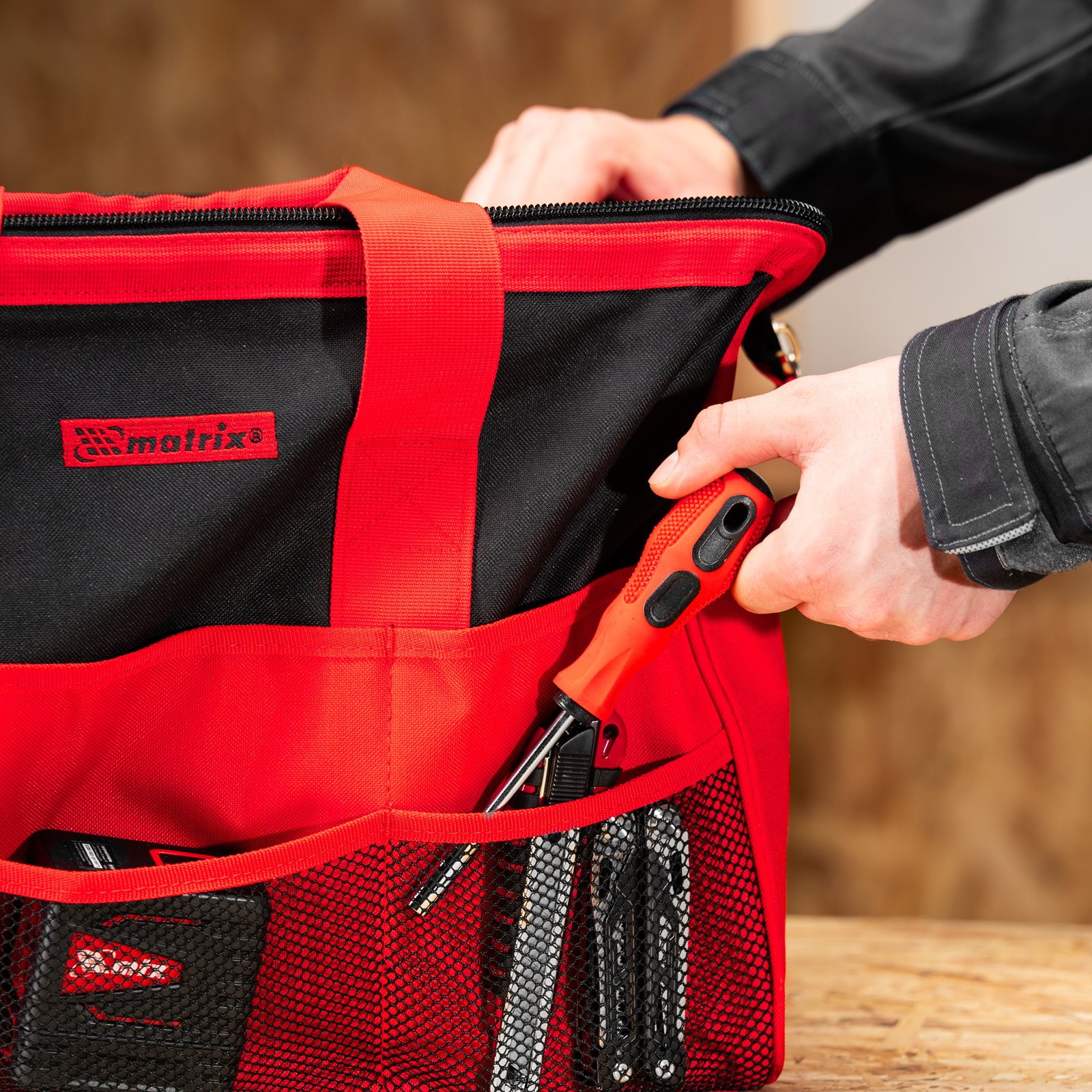 Сумка Matrix 90252 с 18 карманами, размером 510 х 210 х 360 мм, предназначена для транспортировки и хранения слесарных или столярных инструментов. Может использоваться для перевозки автопринадлежностей. В 18 карманах и вместительном основном отделении можно разместить инструменты разного размера. Сумка пригодится монтажнику, слесарю, строителю, будет полезна дома и в поездке.