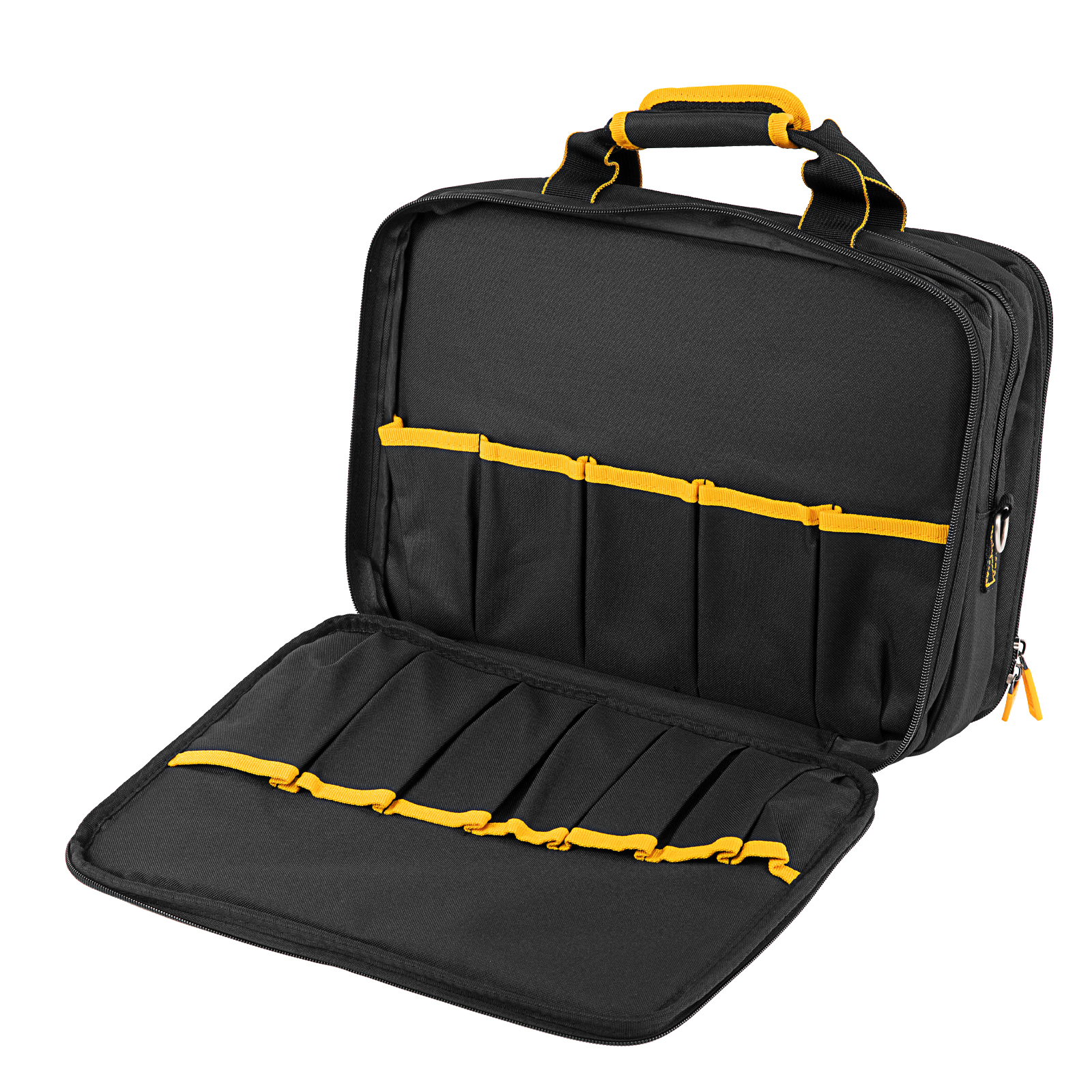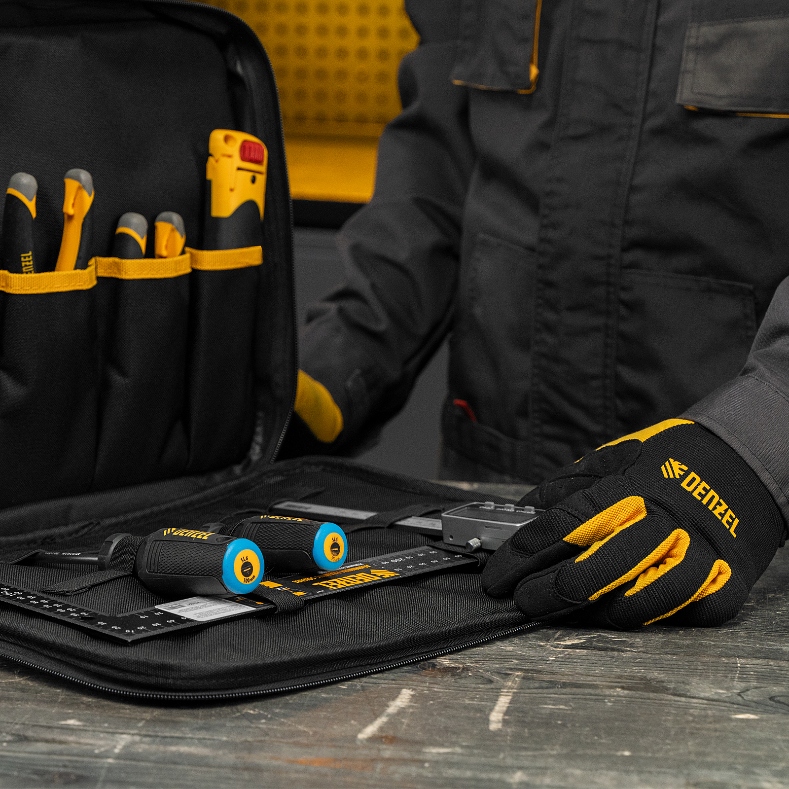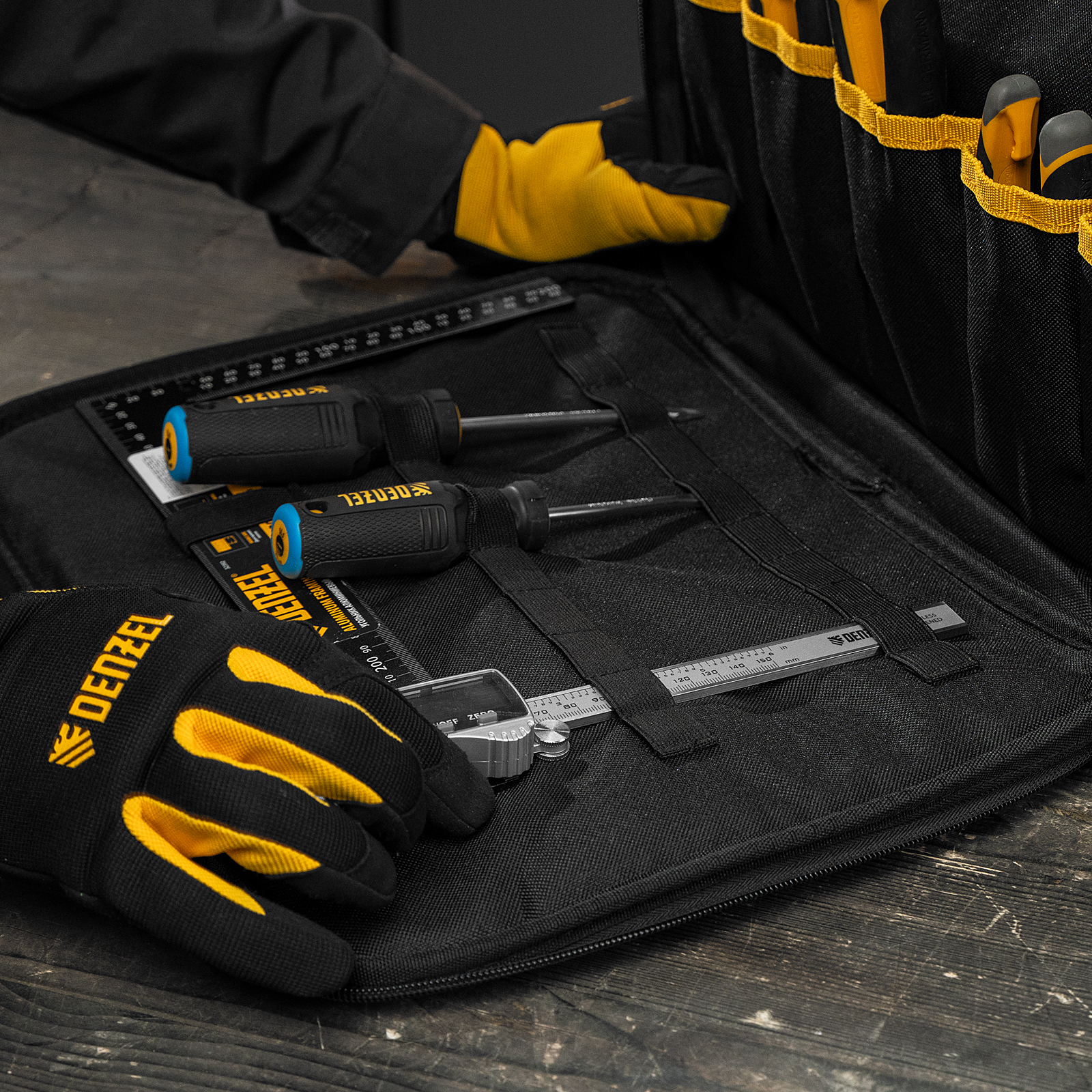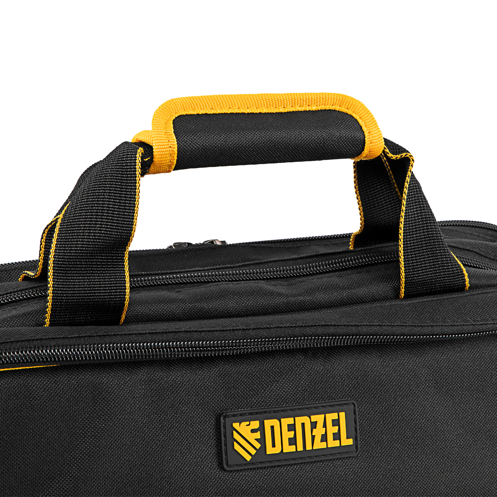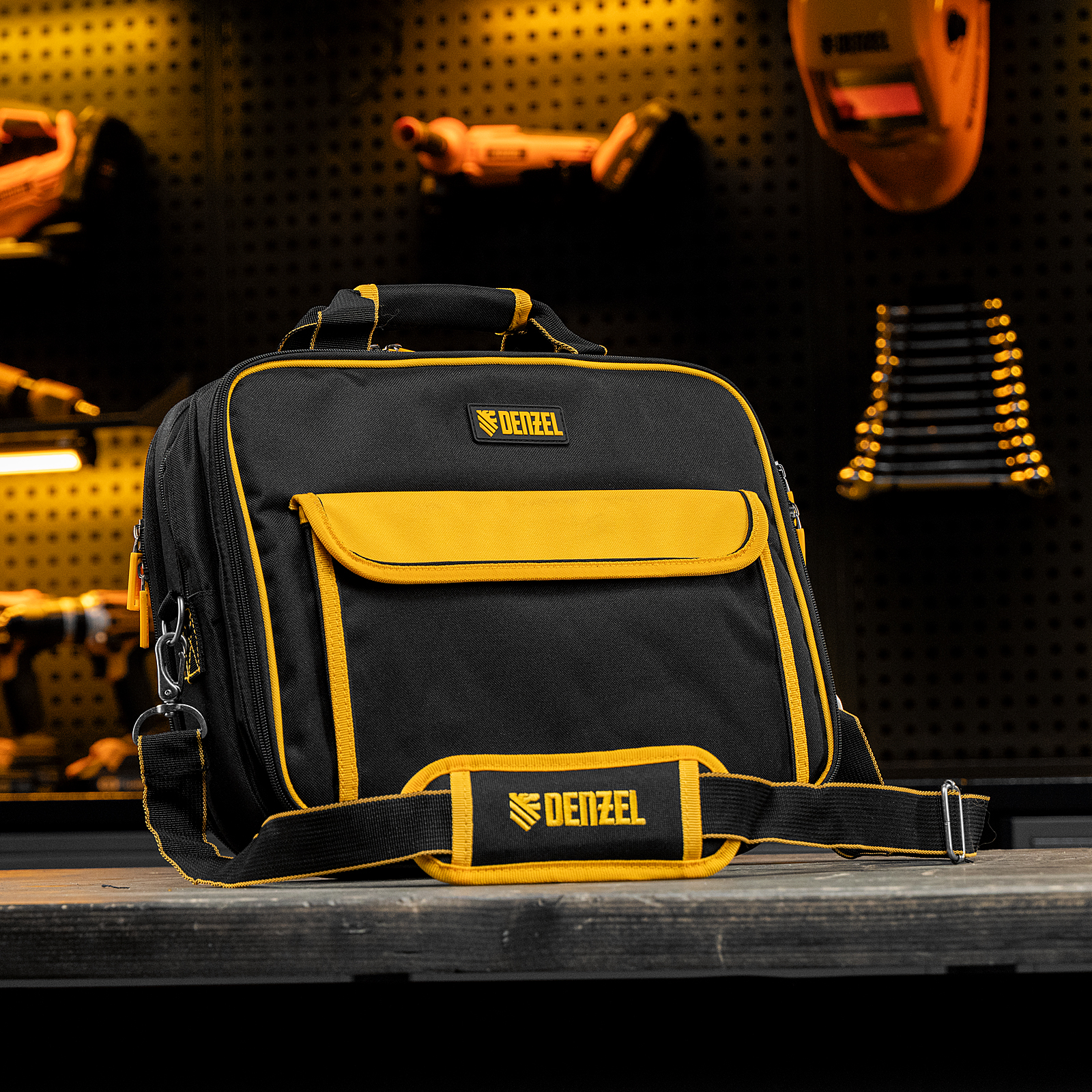 Сумка Denzel 90295 габаритами 400 х 170 х 300 мм, с наплечным ремнем, имеет 3 отделения и 28 карманов, в которых можно разместить необходимые инструменты, оснастку и расходники. Пригодится дома, в гараже и в поездке.