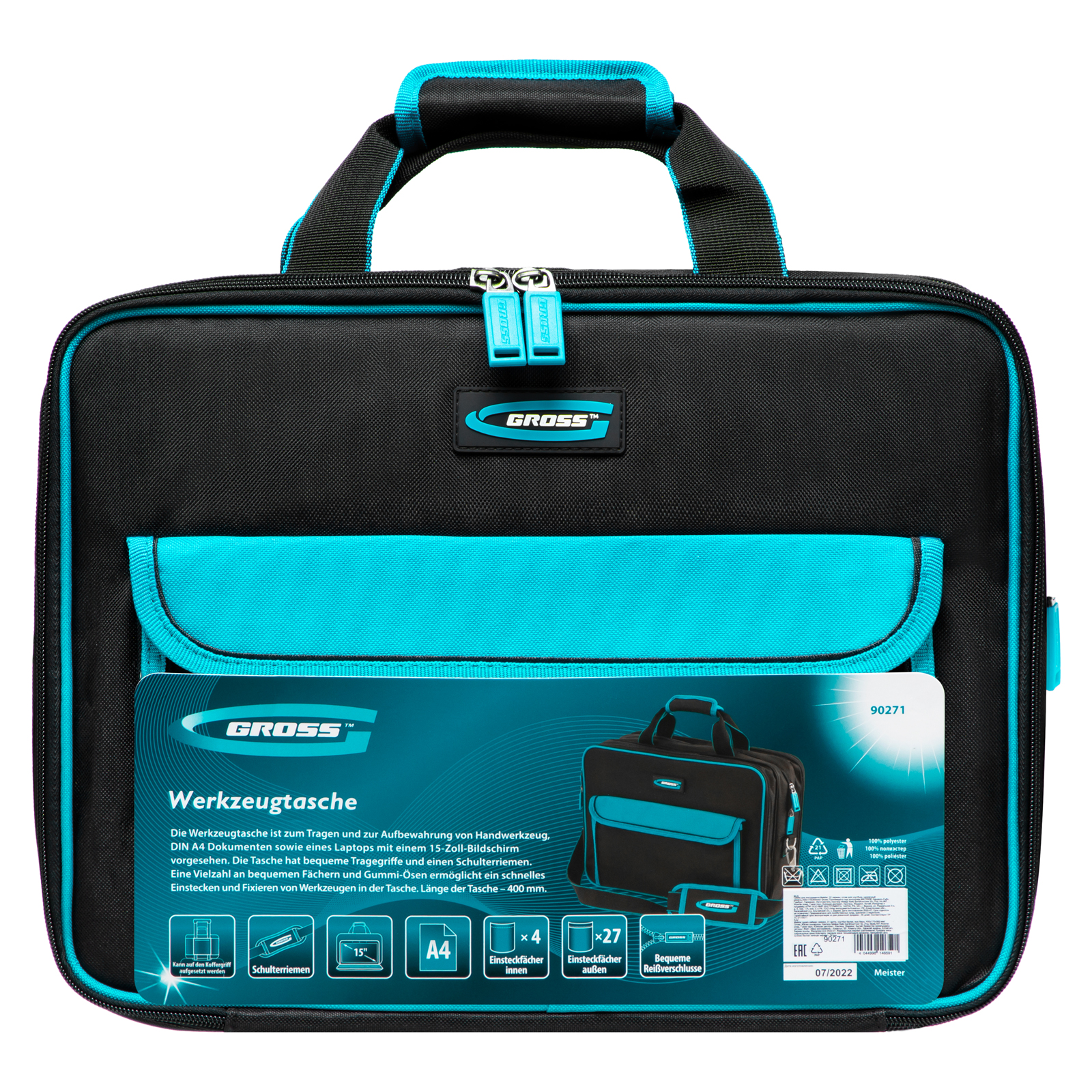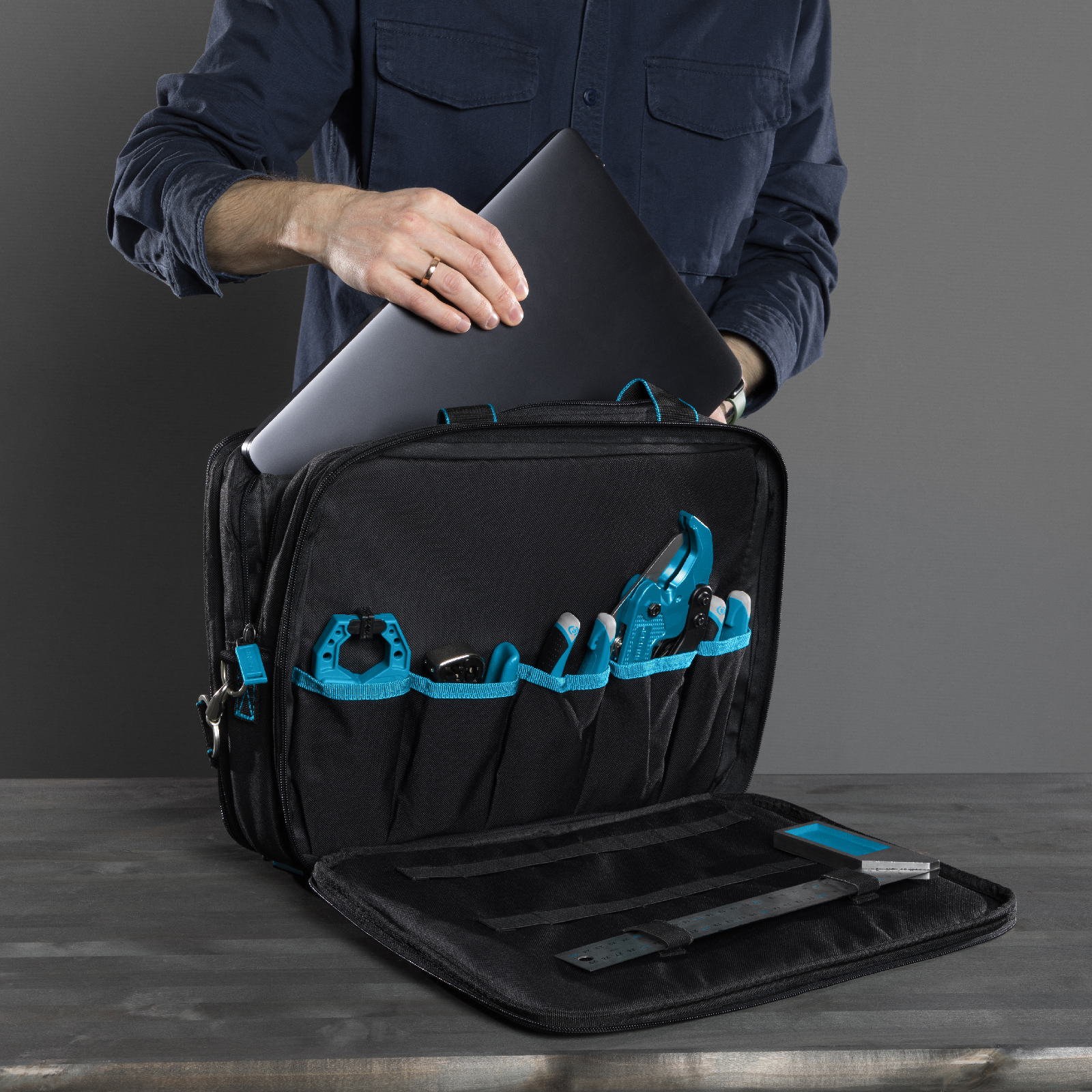 Сумка Gross Meister 90271, 400 х 170 х 300 мм, 31 карман, с отсеком для ноутбука и наплечным ремнем, удобна для переноски и хранения ручных инструментов. Подойдет мастерам по ремонту техники, слесарям, электрикам. Сумку можно брать в офис — в ней помещается ноутбук диагональю до 15 дюймов и бумаги формата А4. В сумке 31 карман и удобные фиксирующие резинки, поэтому каждый инструмент в ней всегда на своем месте.