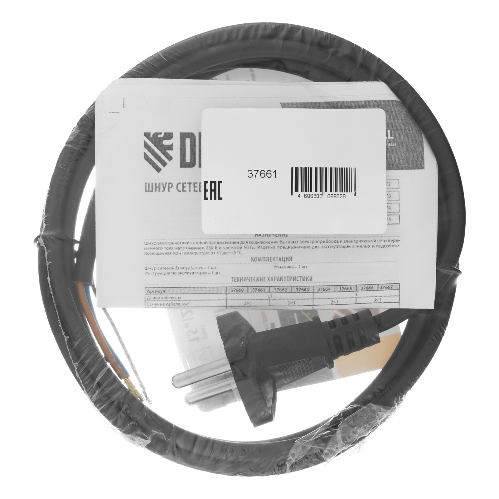 Черный сетевой шнур Denzel Energy Series 37661 с кабелем ПВС сечением 2 x 1 мм и длиной 1,5 м, с неразборной вилкой, предназначен для подключения к сети электроприборов мощностью до 3500 Вт. Для смотанного кабеля максимальная мощность потребителя составляет 1750 Вт. Шнур можно использовать для самостоятельного подключения прибора или замены вышедшего из строя провода. Сделано в России.
