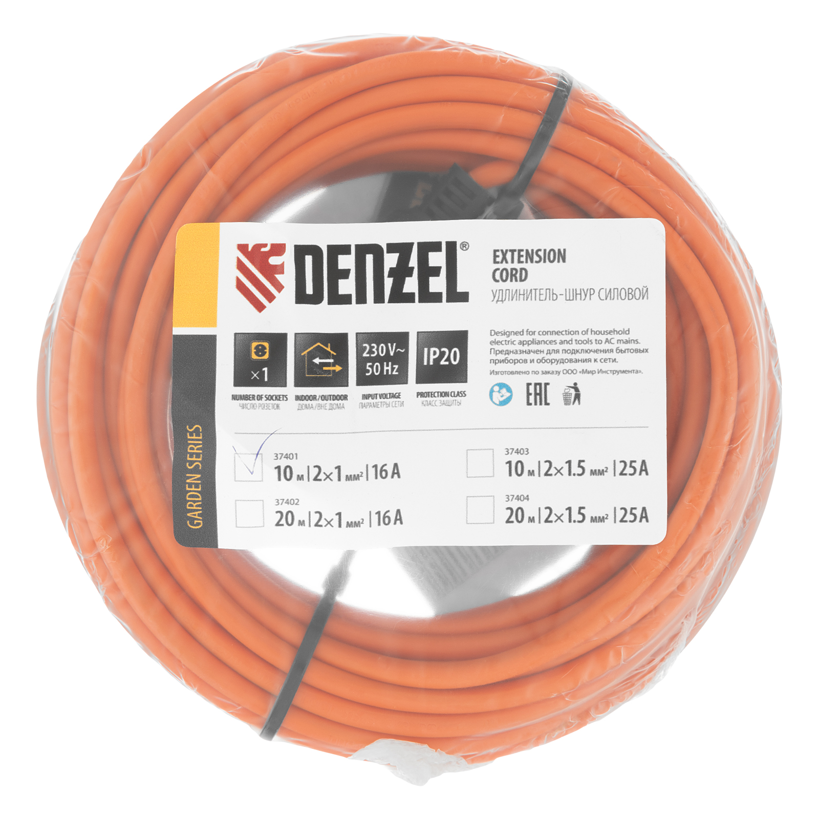 Силовой удлинитель-шнур Denzel Garden Series 37401 с кабелем ПВС сечением 2 x 1 мм, и 1 розеткой без заземления, позволяет подключать приборы к электросети на расстоянии до 10 м от стационарного источника питания. Максимальная мощность потребителя составляет 3500 Вт при полностью размотанном кабеле и 1750 Вт — при смотанном. Удлинитель может использоваться при температуре от +5 до +35 °C. Пригодится дома, на даче, в гараже.