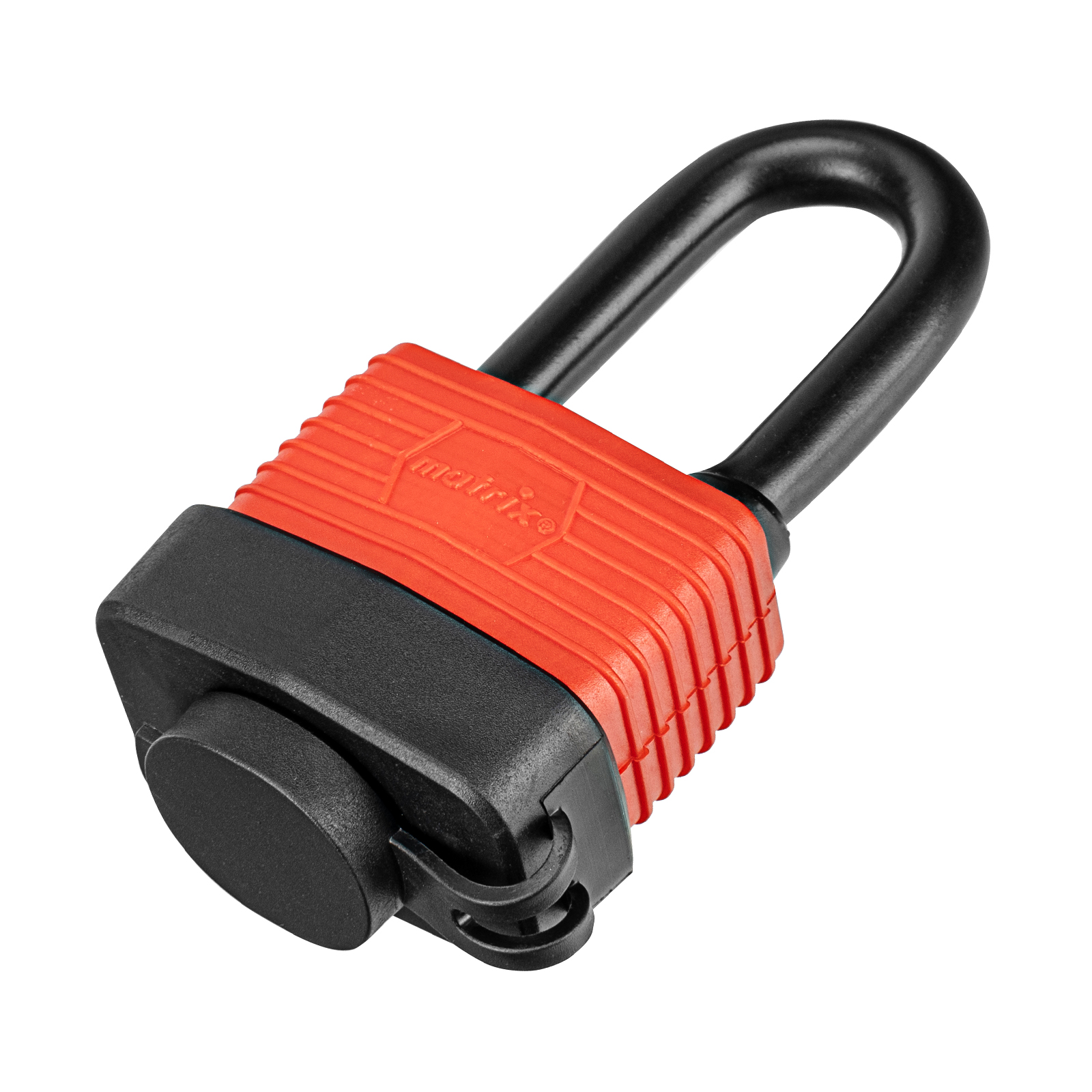 Навесной всепогодный замок Matrix 91822 шириной 40 мм, с удлиненной дужкой, вешается на дверь и обеспечивает сохранность имущества. Поможет защитить от несанкционированного проникновения сарай, гараж, подвал и другие помещения, подходит для высоких запорных петель.