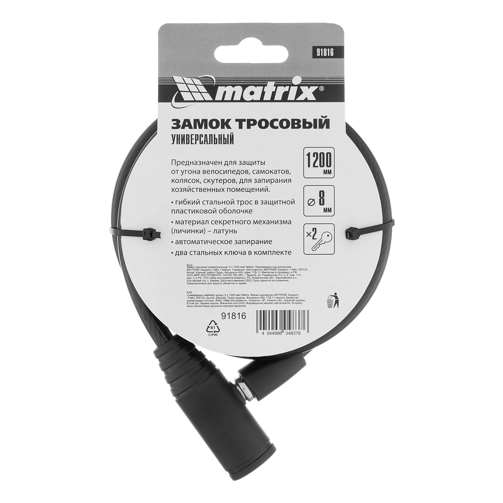 Универсальный тросовый замок Matrix 91816 размером 8 х 1200 мм используется для защиты личных вещей от кражи. С его помощью можно пристегнуть коляску, велосипед, санки, мопед и т.д. Трос легко сворачивается и помещается в сумку, поэтому замок удобно брать с собой.