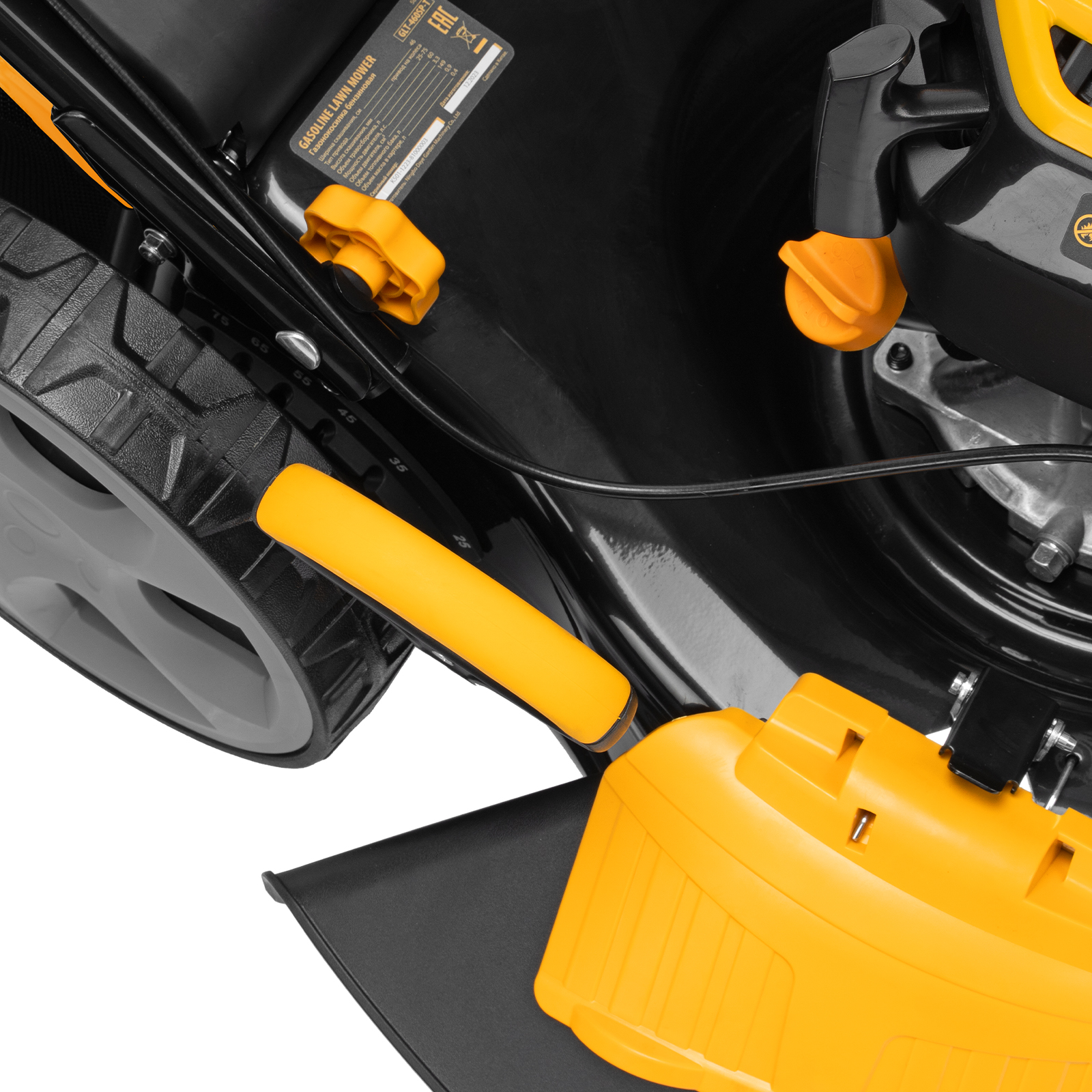 - Удобный сбор скошенной травы — комбинированный травосборник объемом 60 л быстро очищается и не нуждается в частом опустошении.