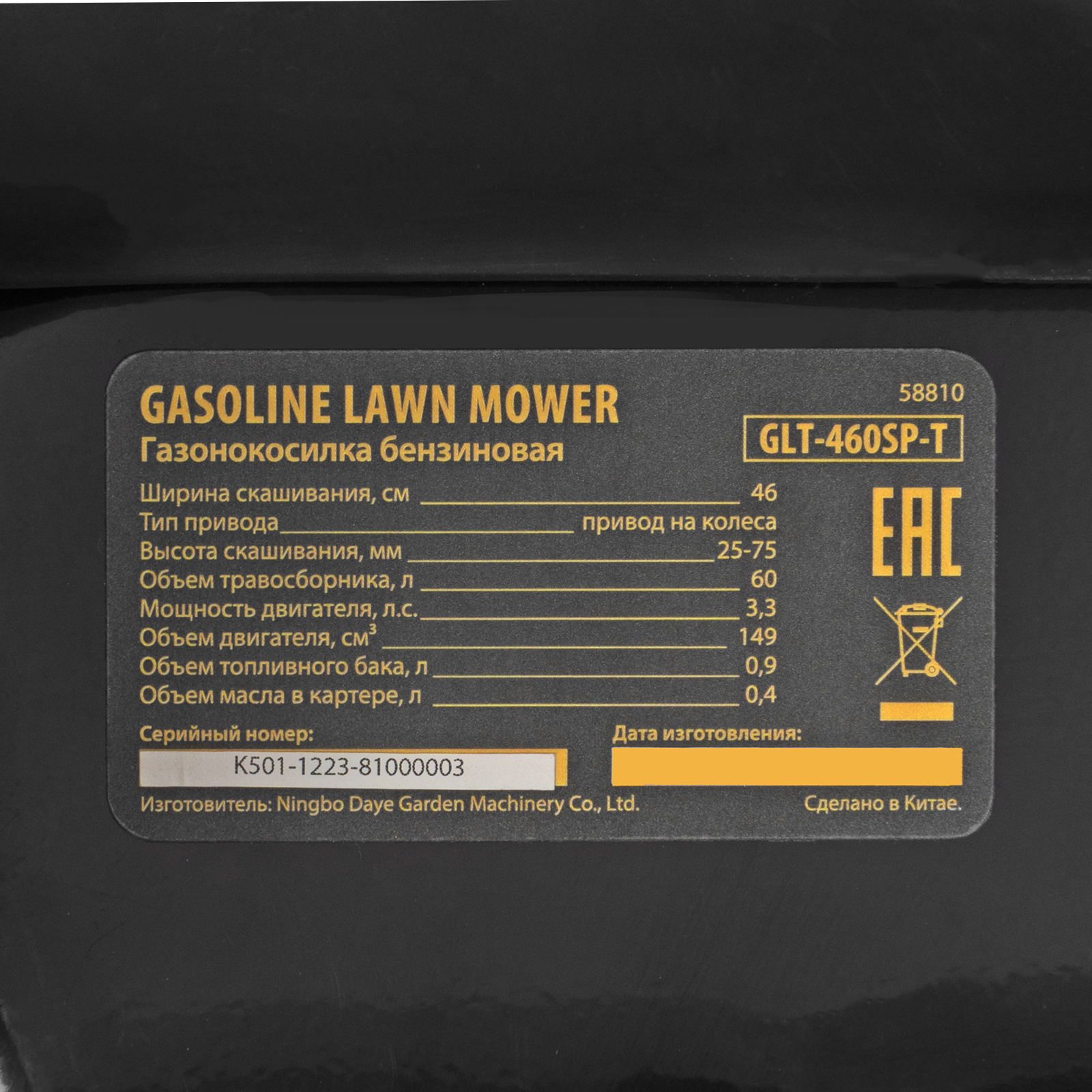 Трехколесная бензиновая газонокосилка Denzel GLT-460SP-T Trike 58810 с двигателем объемом 149 см3 и приводом на колеса, с травосборником на 60 л, обеспечивает ширину скашивания 46 см. Оптимальна для ухода за газоном на дачном участке. Позволяет установить необходимую высоту скашивания в соответствии с требованиями к травяному покрову, всего предусмотрено 6 уровней: от 25 до 75 мм. Благодаря поворотному переднему колесу модель GLT-460SP-T Trike отличается высокой маневренностью, что особенно удобно для скашивания травы между деревьями и кустами.
