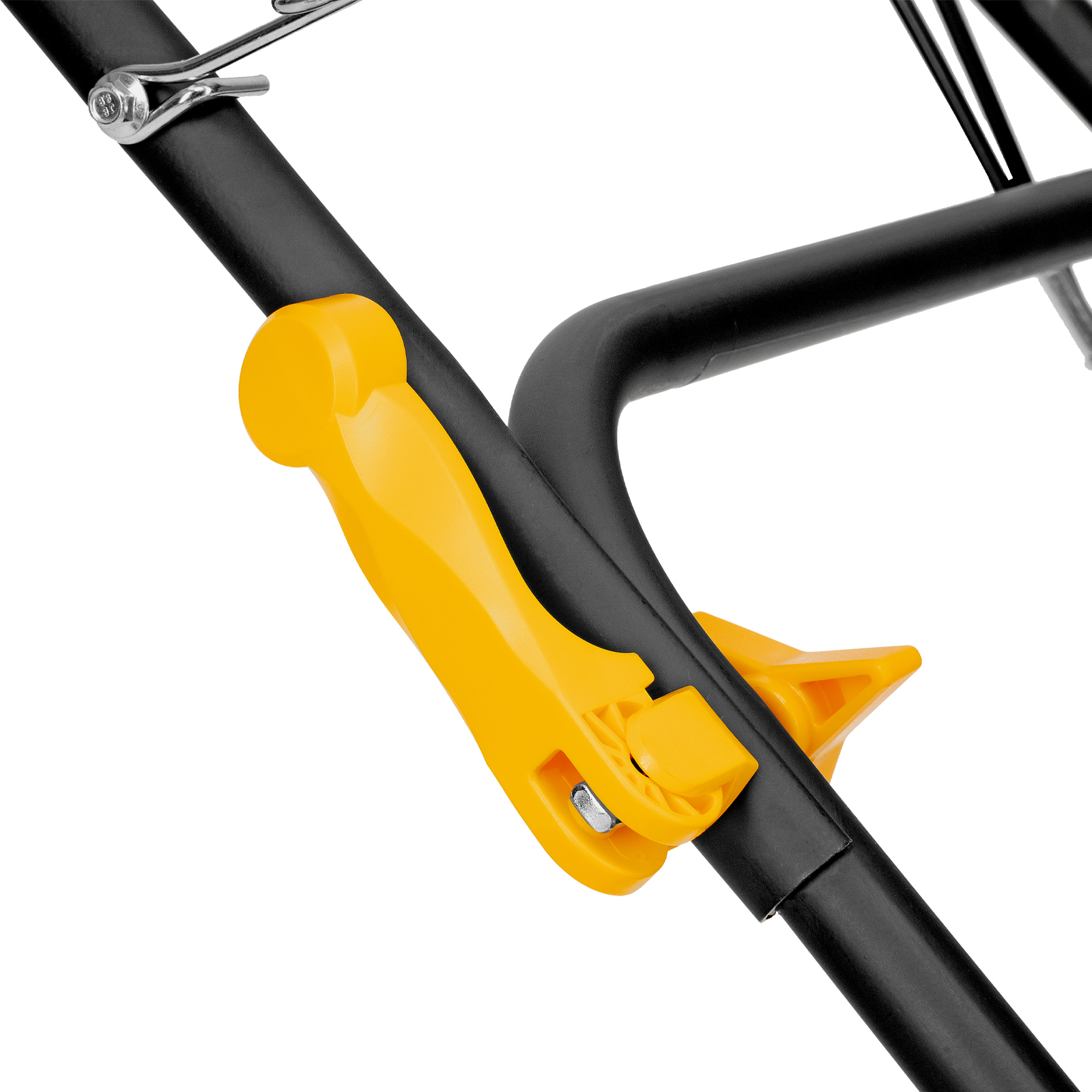 - Продуманная конструкция — рукоятка с эксцентриковыми фиксаторами легко складывается, газонокосилка не занимает много места в зоне хранения.