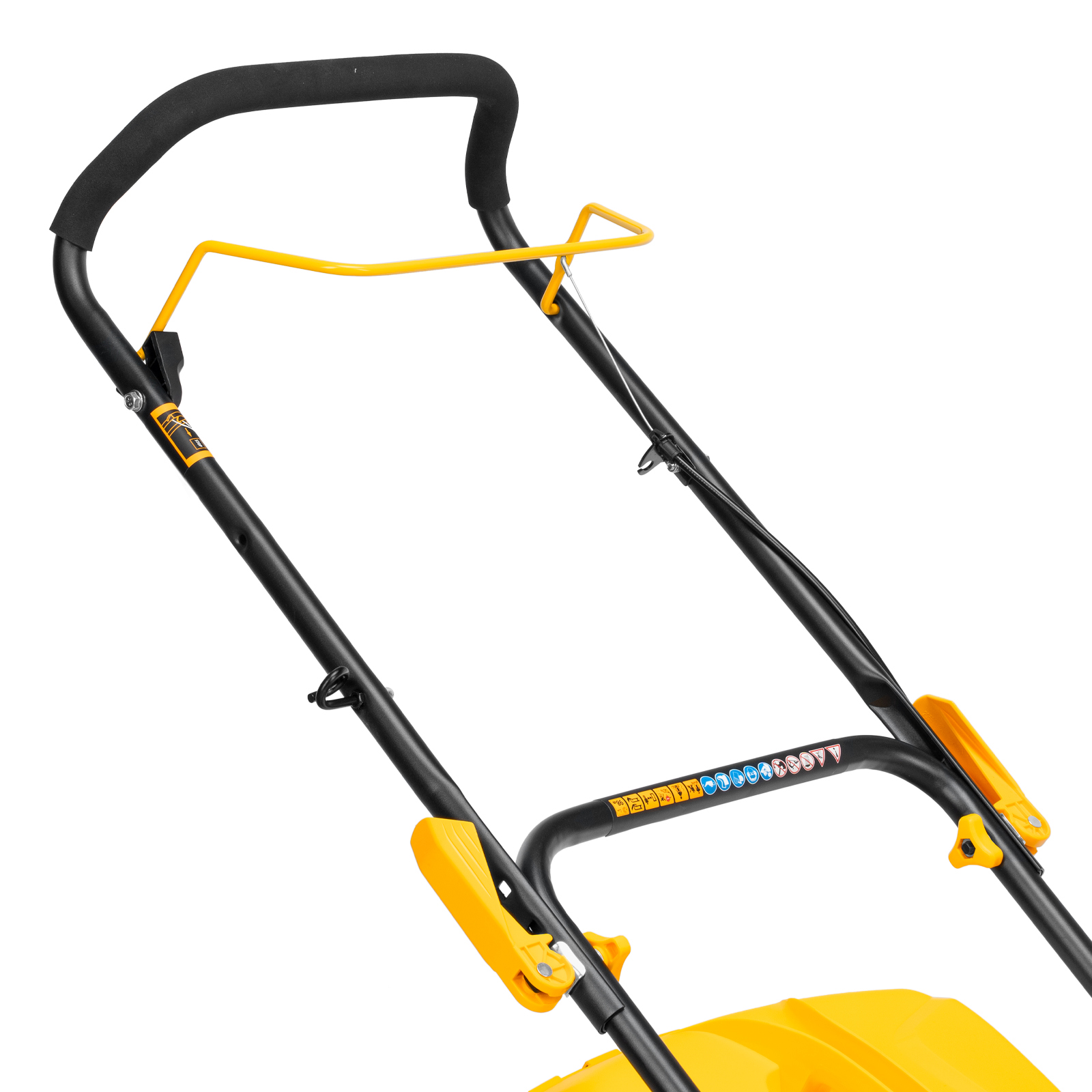 - Высокая эффективность — усиленный стальной корпус, закаленный до твердости 45 HRC нож и колеса увеличенного диаметра обеспечивают лучшее втягивание травы и свободную проходимость без повреждения газона.