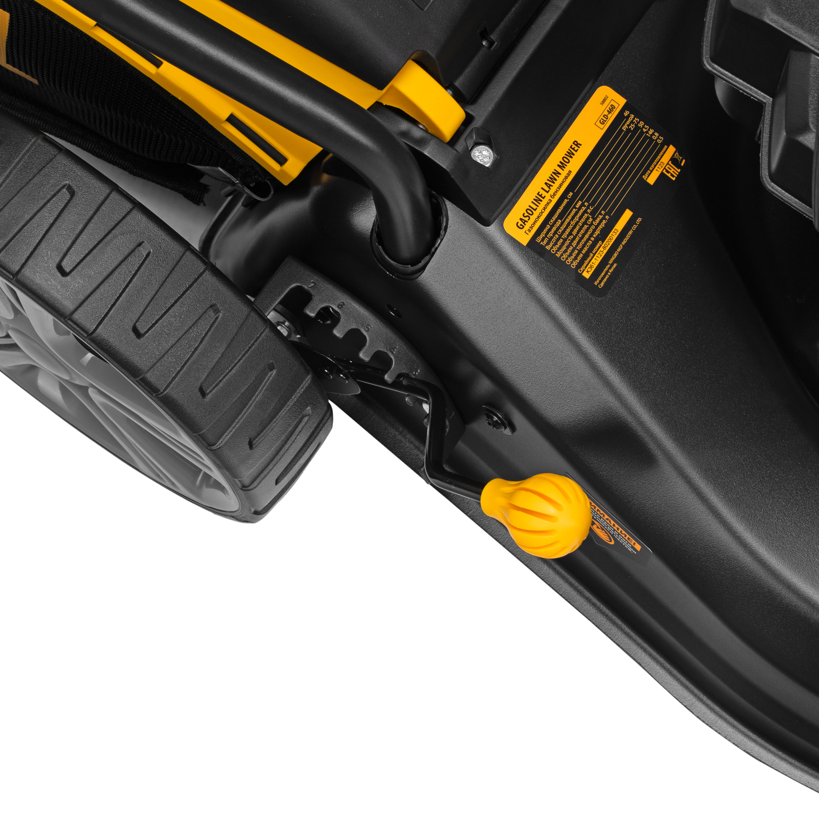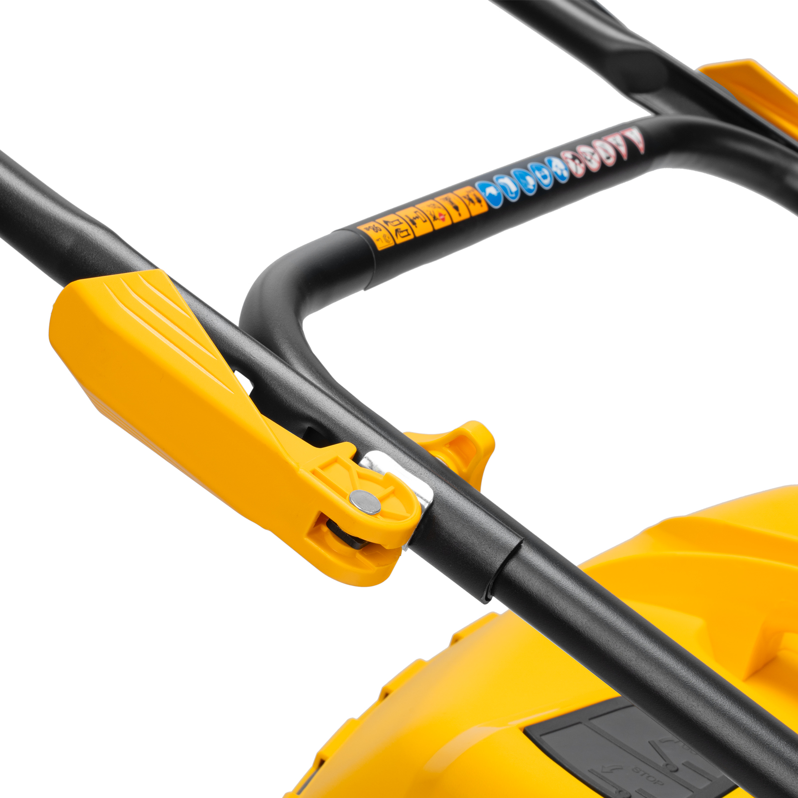 Настройка уровня скашивания доступна в диапазоне 25-75 мм. Так, для оформления мягкого ландшафта достаточно установить высоту 70-75 мм, для подрезания травы под эффектный партерный газон — 40 мм, а для создания спортивной площадки — 30 мм.