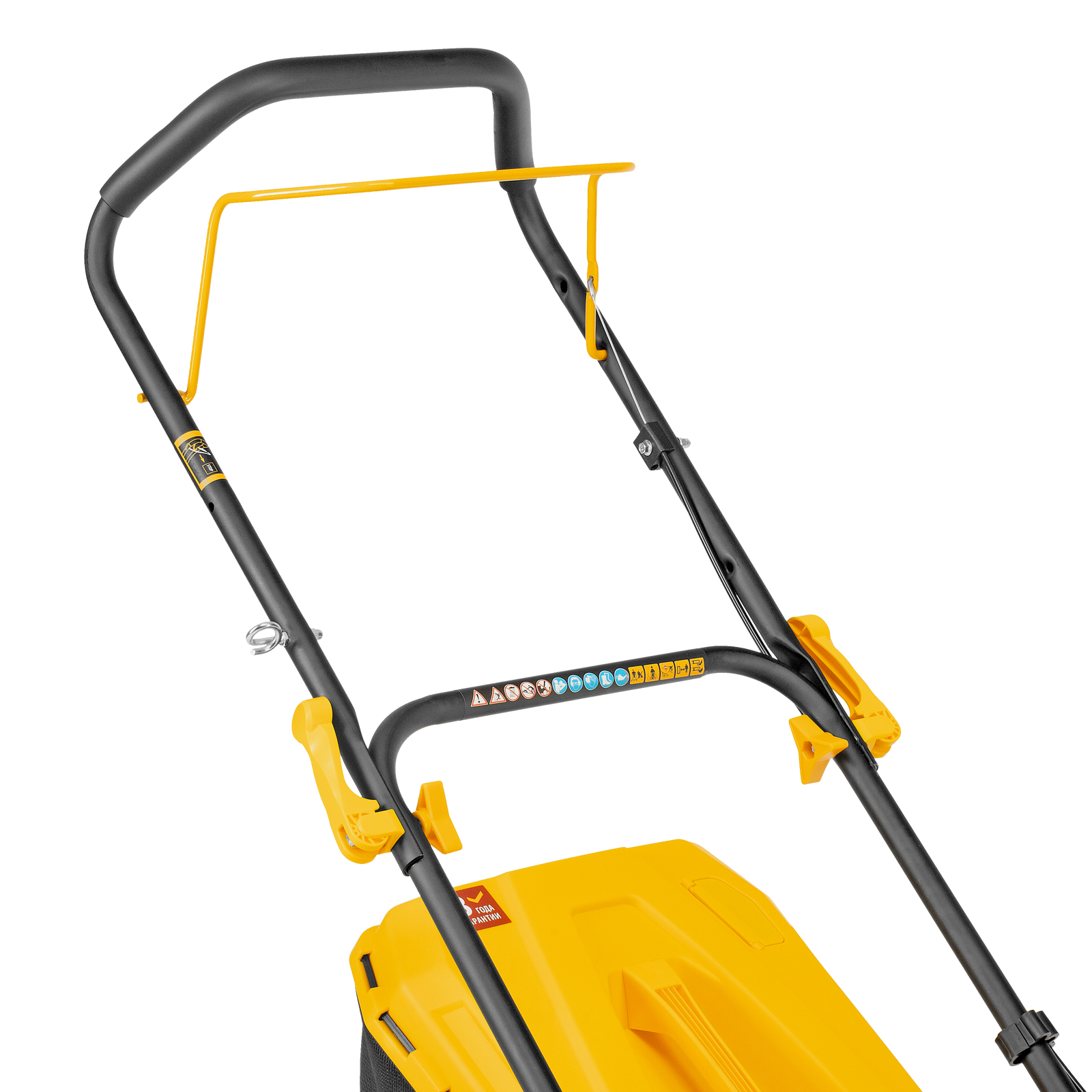 - Продуманная конструкция — рукоятка с эксцентриковыми фиксаторами легко складывается, газонокосилка не занимает много места в зоне хранения.