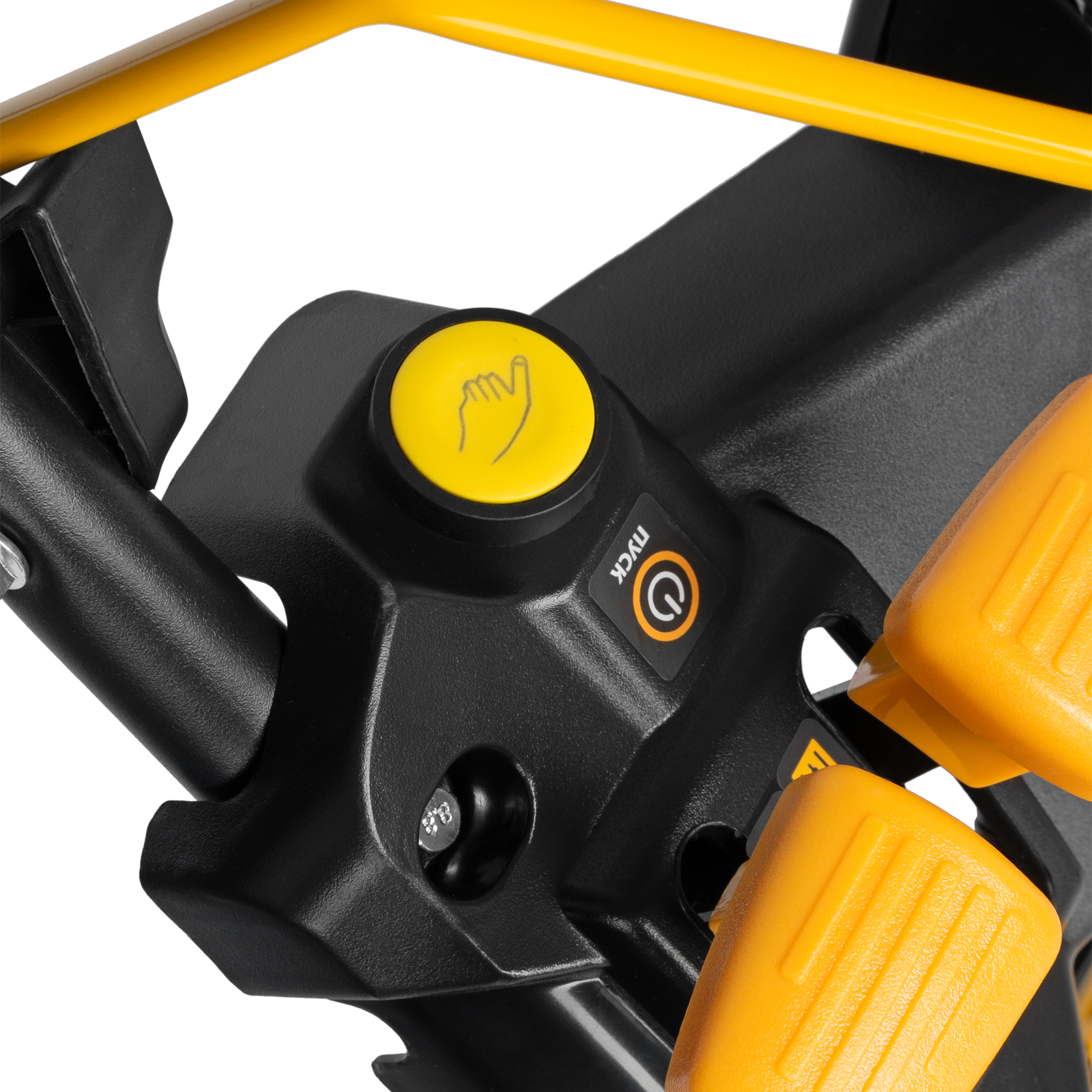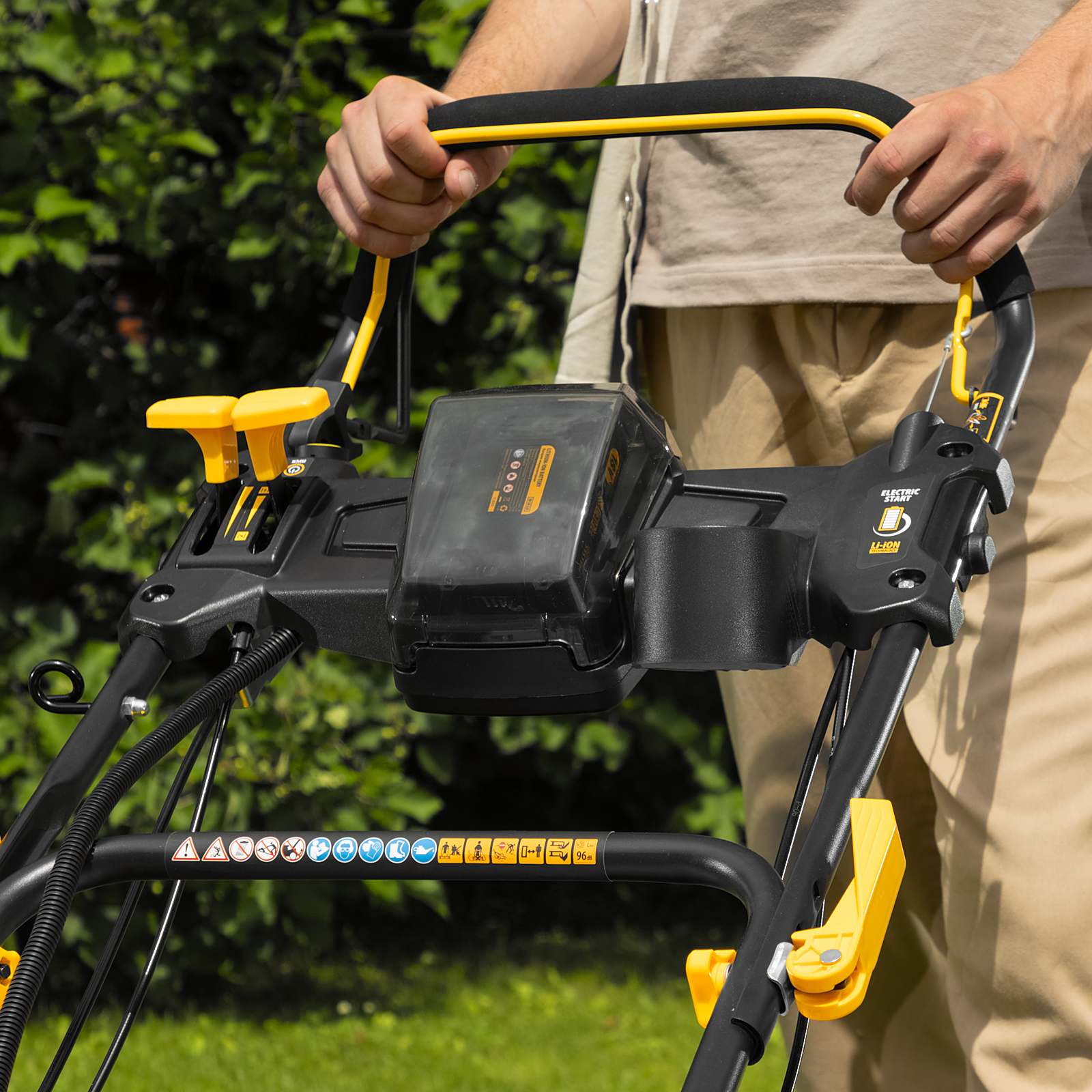 - Электрический старт — запуск двигателя значительно упрощен, достаточно нажать на кнопку (электростарт работает на единой аккумуляторной платформе Denzel Power System 20V, подойдет батарея емкостью 2 А·ч от любого аккумуляторного инструмента Denzel).