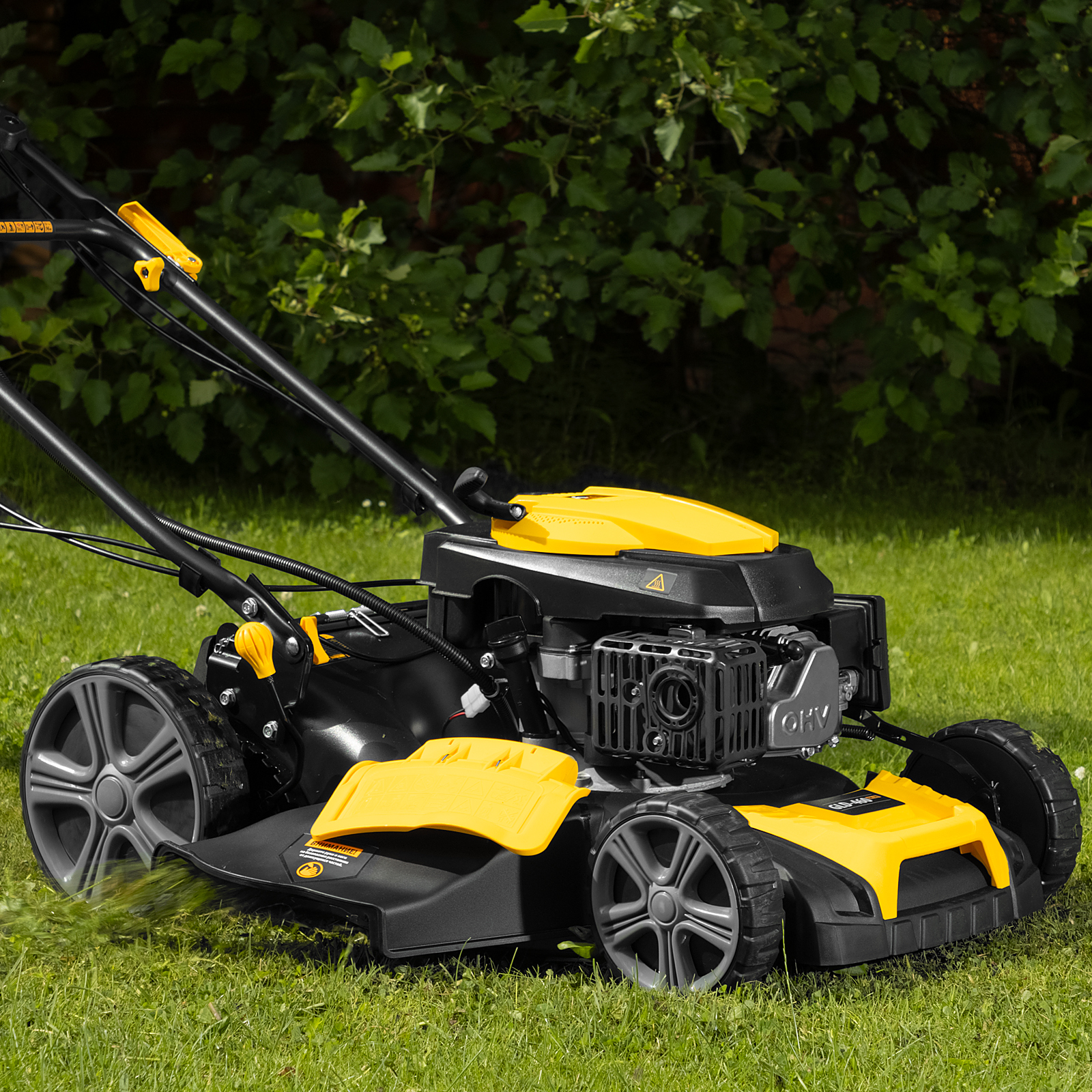 - Привод на задние колеса — достаточно только направлять косилку, ее не нужно постоянно толкать.