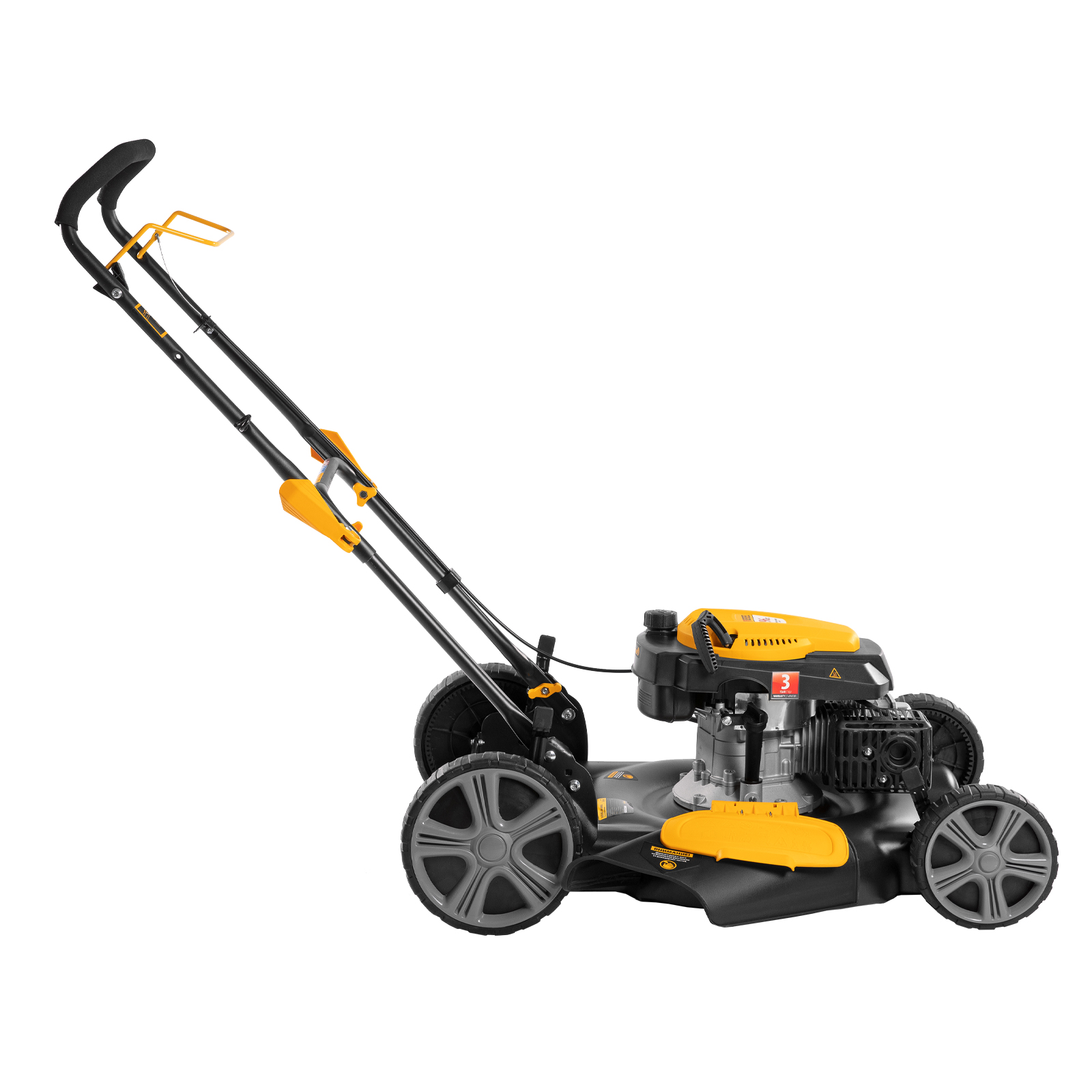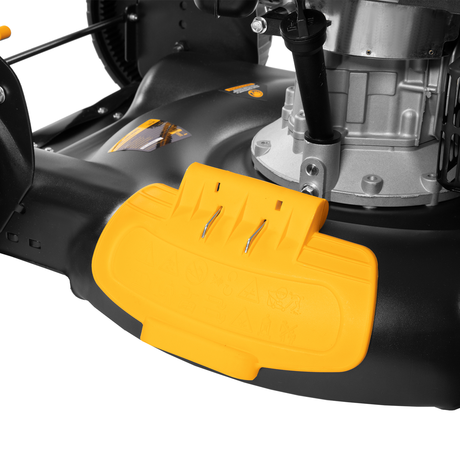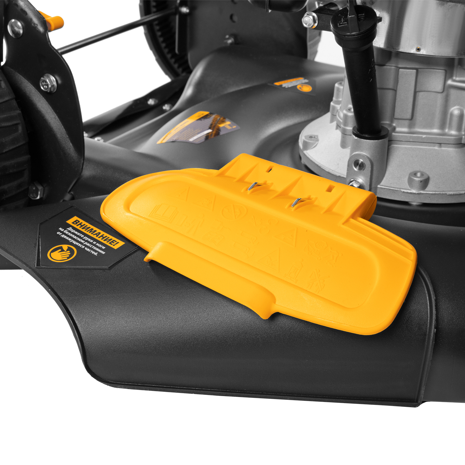 - Удобный выбор режима работы — за счет отсутствия травосборника переключаться между мульчированием и боковым выбросом проще, т.к. не нужно устанавливать заглушки.
