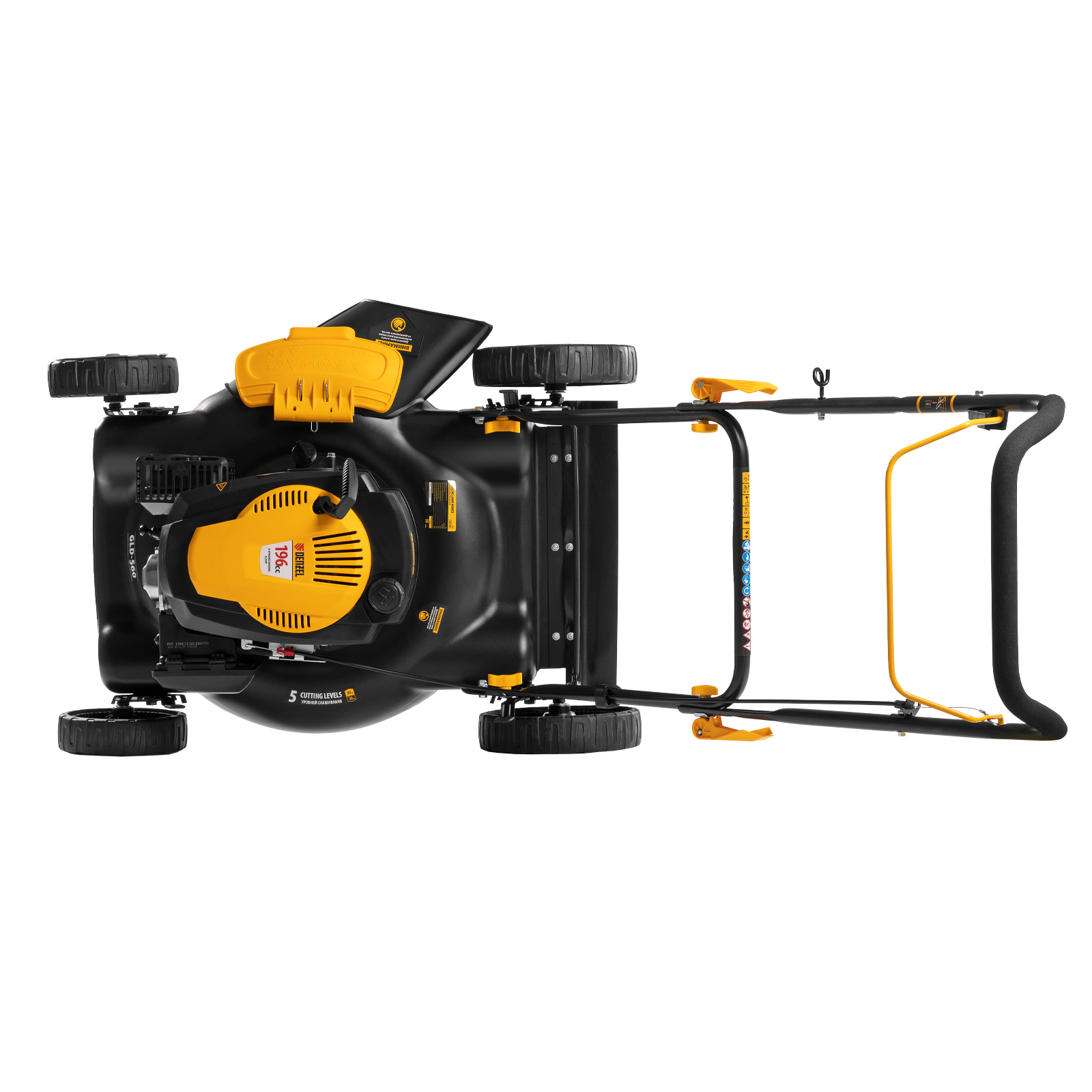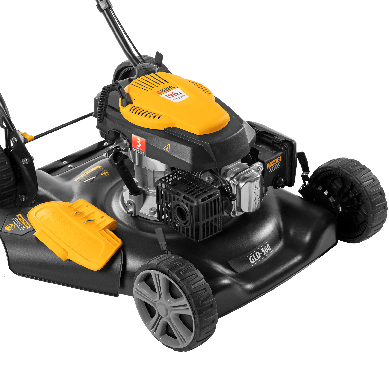 Газонокосилка бензиновая Denzel GLD-560 58808 с двигателем объемом 196 см3 обеспечивает повышенную ширину скашивания за один проход — целых 56 см. Благодаря этому за 1 час возможно обработать до 2000 кв.м. На одной заправке машина способна проработать до 60 минут.,Техника разработана специально для коммунальных служб — конструкция не предусматривает наличие травосборника, трава распределяется по газону: возможен боковой выброс и переработка травы в органическое удобрение (режим мульчирования).