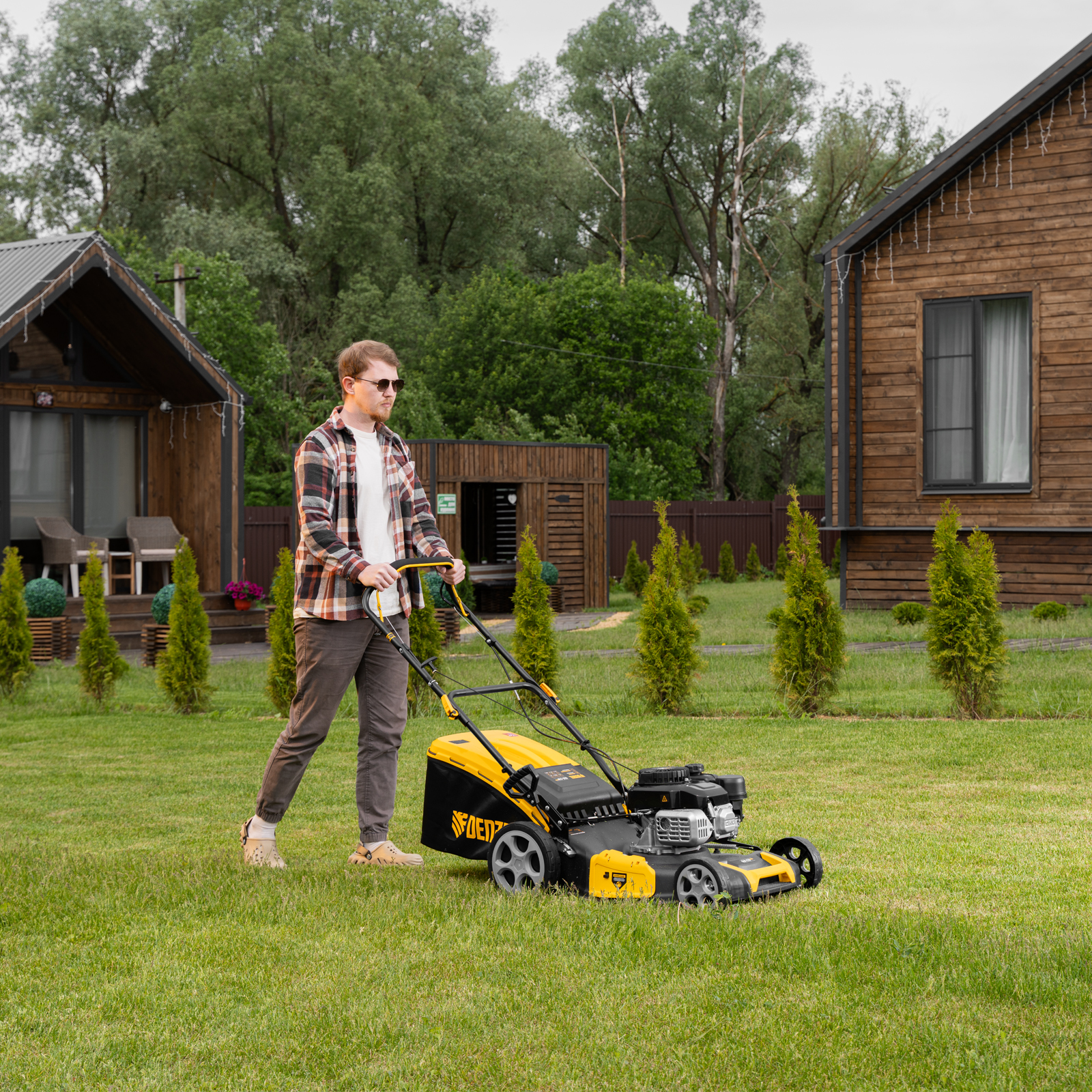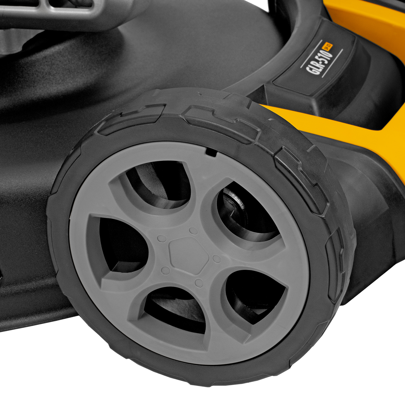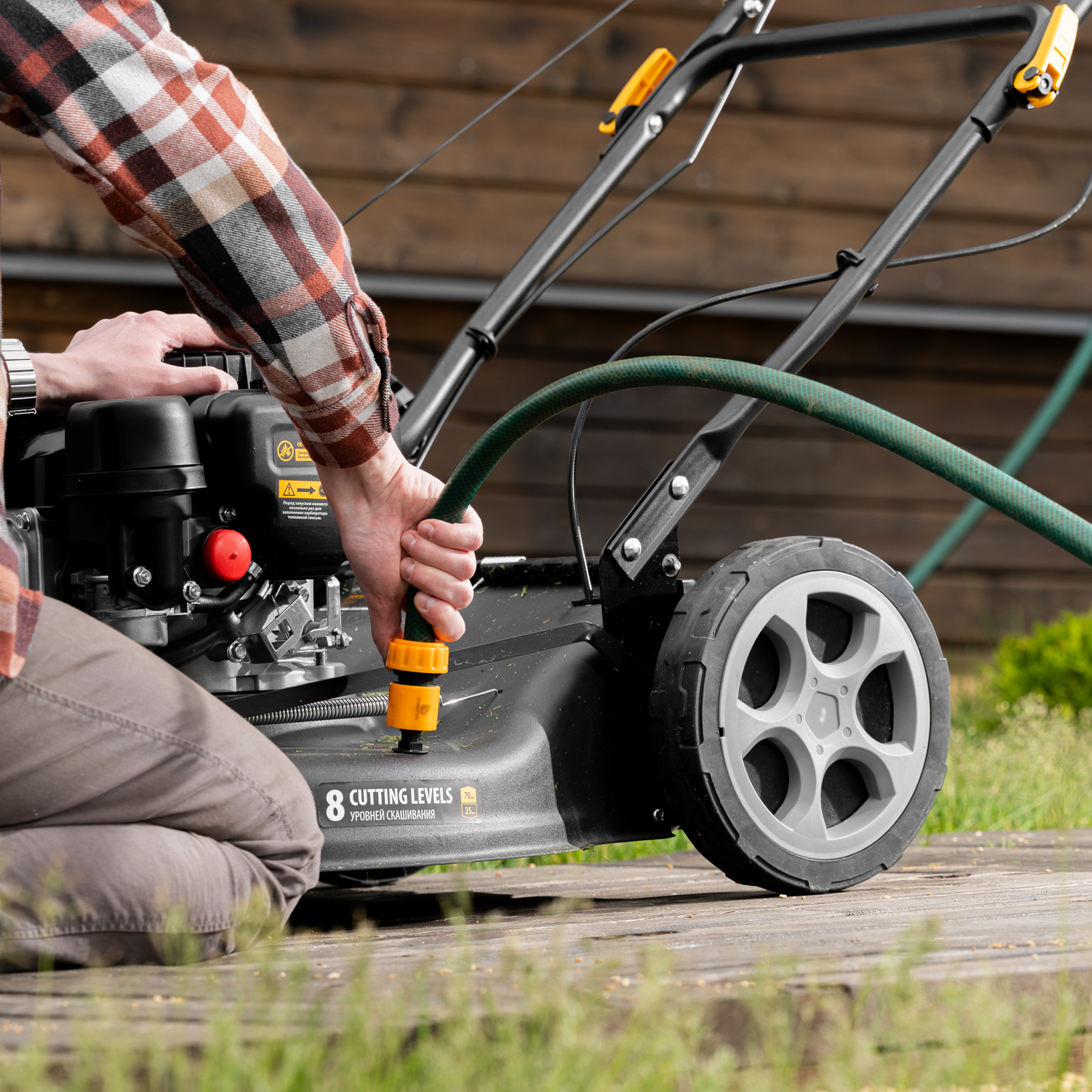 - Широкие колеса Eco-friendly — газонокосилка легко проходит по газону, не повреждая его.