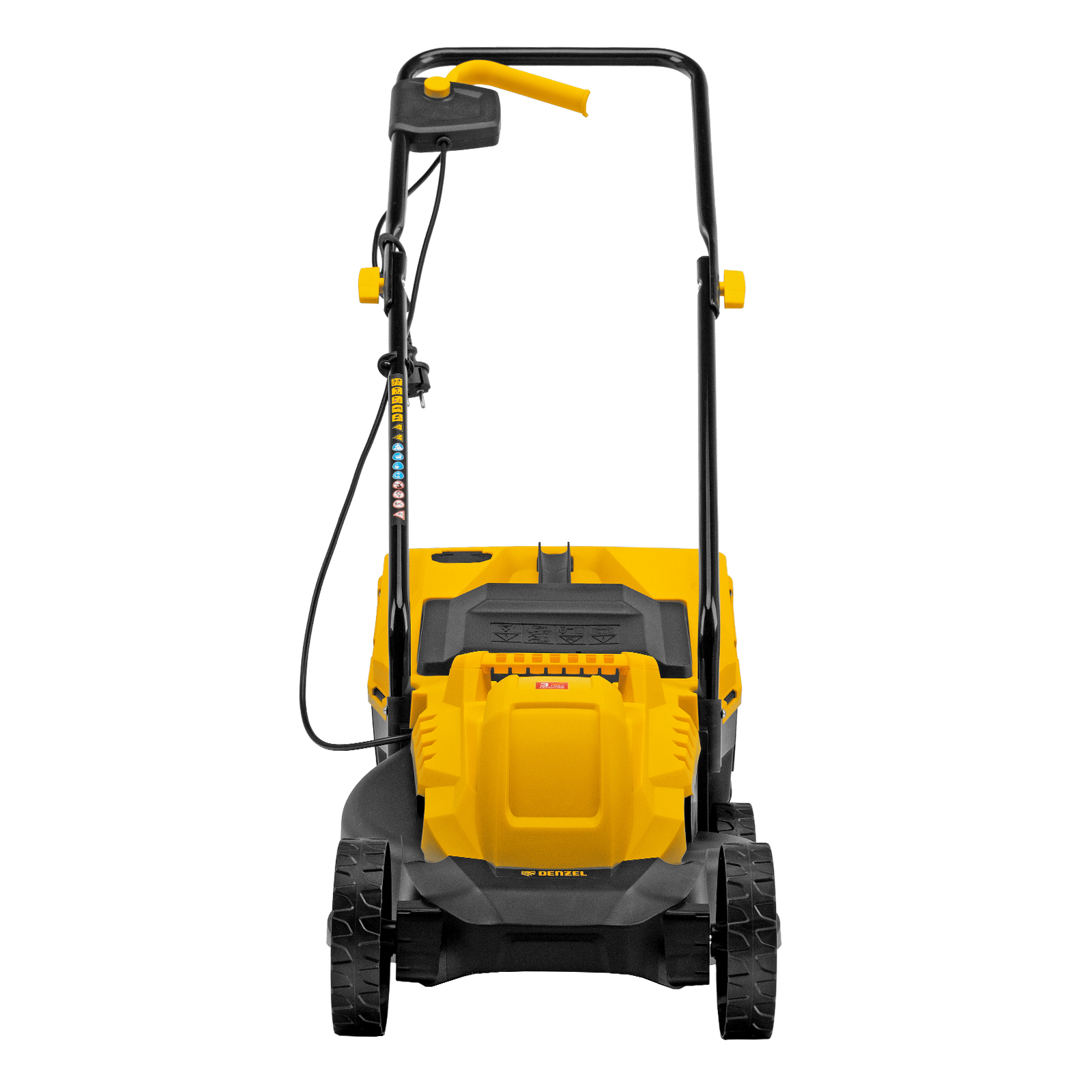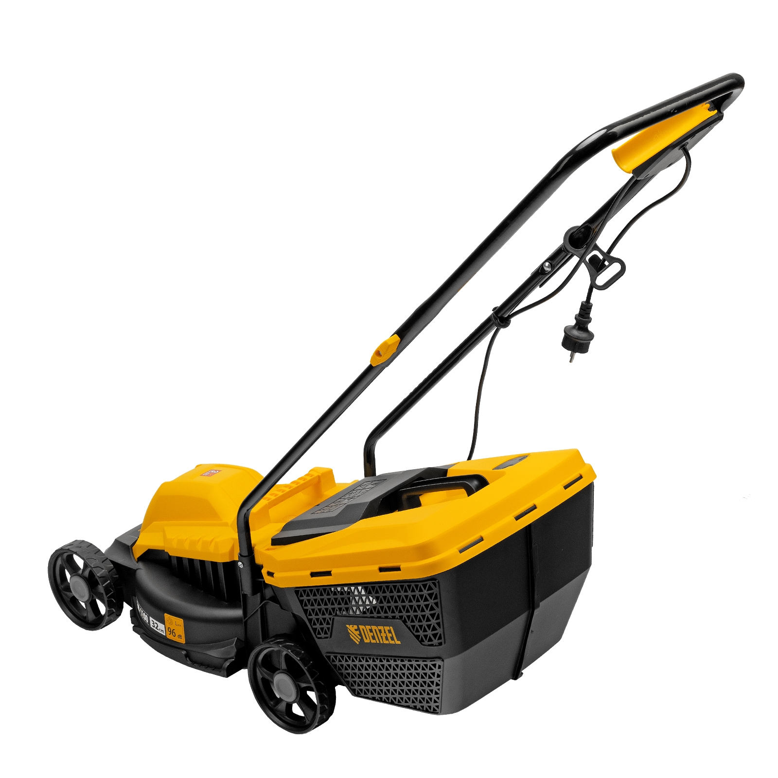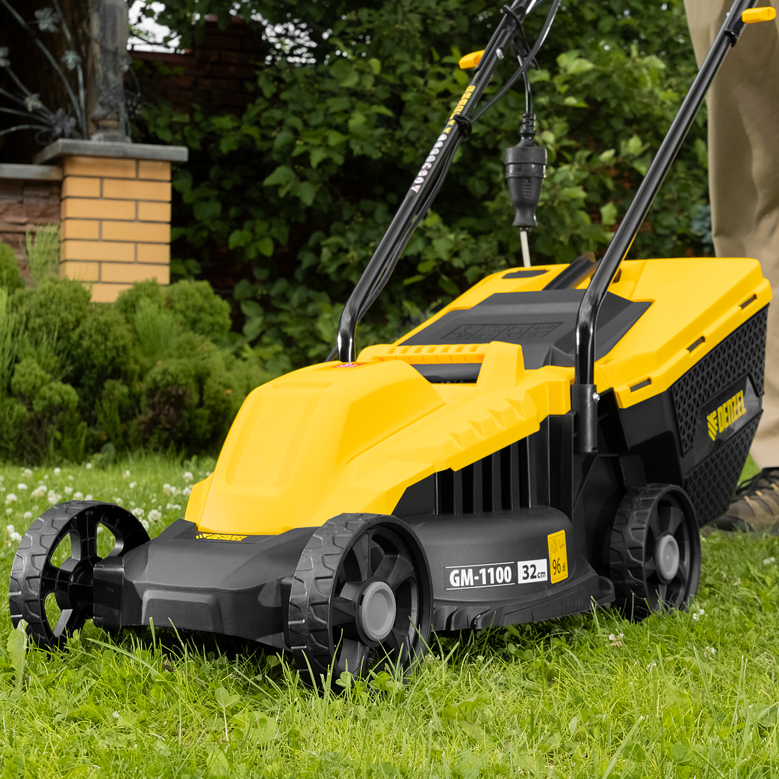 Газонокосилка электрическая Denzel GM-1100 96626 мощностью 1100 Вт, с травосборником объемом 30 л и 3 уровнями скашивания, обеспечивает ширину прохода 32 см и предназначена для стрижки газонов, кошения травы в саду и на небольшом приусадебном участке. Высота скашивания устанавливается на уровне 30, 50 или 70 мм в зависимости от типа газона. Газонокосилка проста в управлении и обслуживании, с ней легко справится неопытный пользователь.