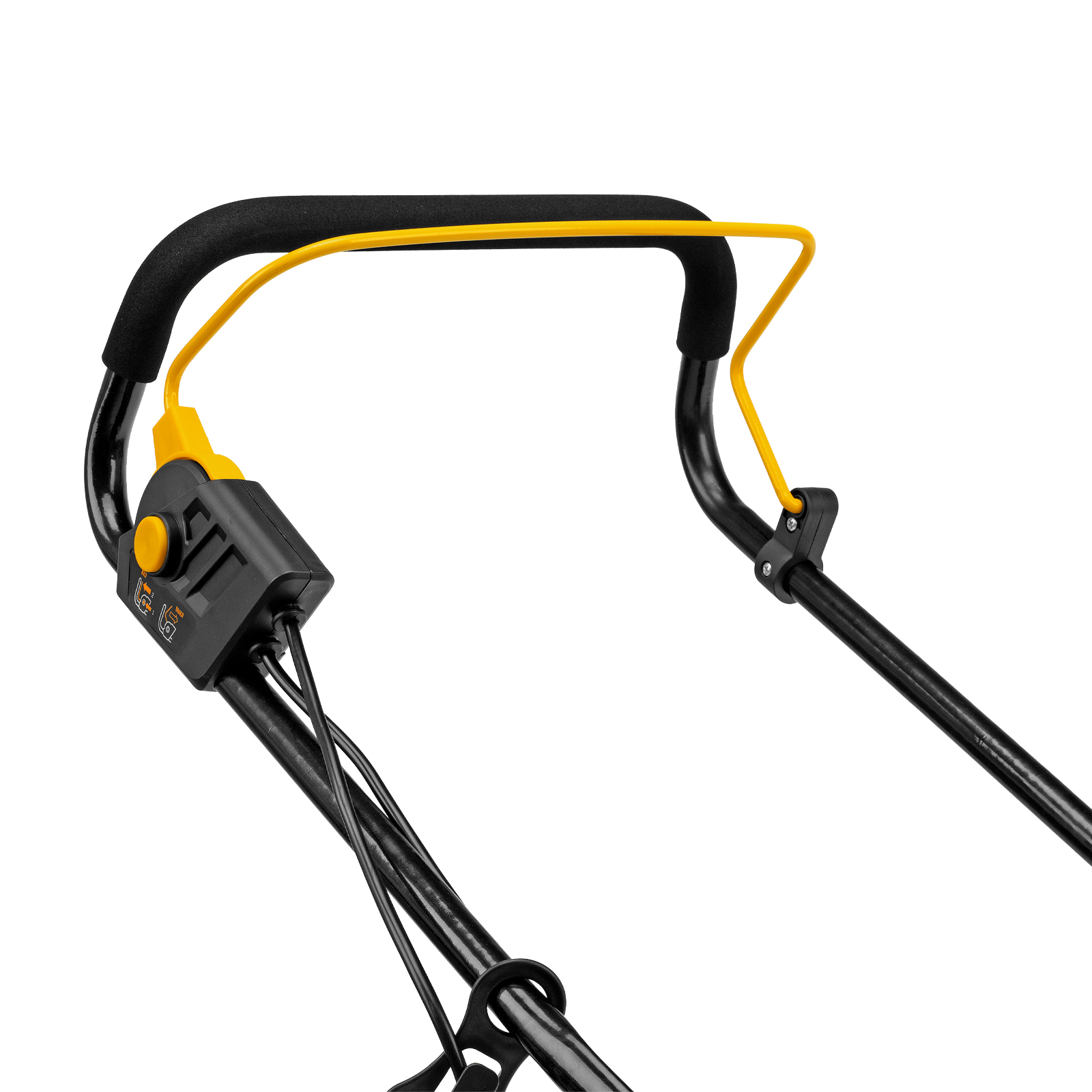 - Безопасность — функция блокировки исключает случайный запуск двигателя, а держатель кабеля предотвращает отключение техники от сети и уменьшает риск попадания провода под нож.