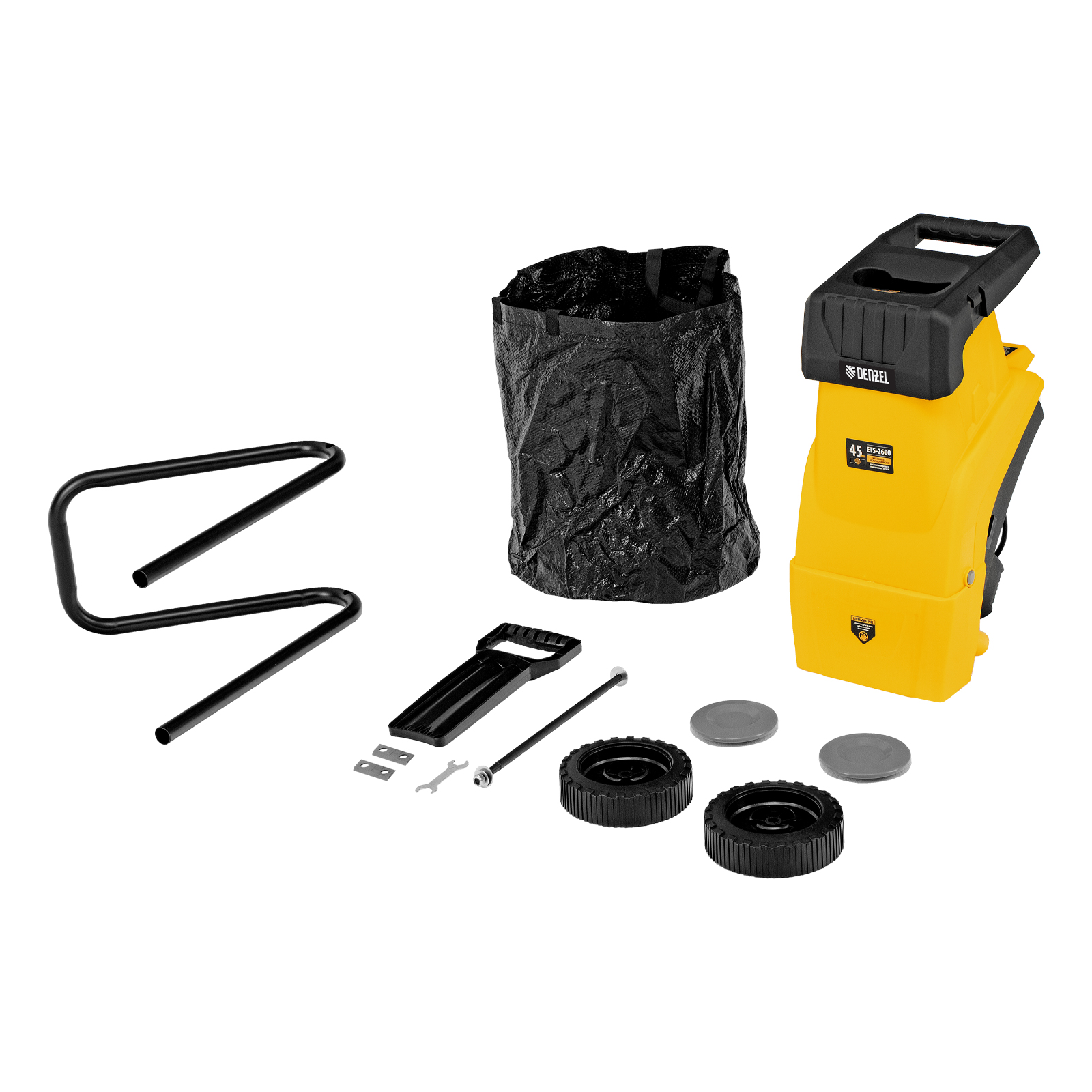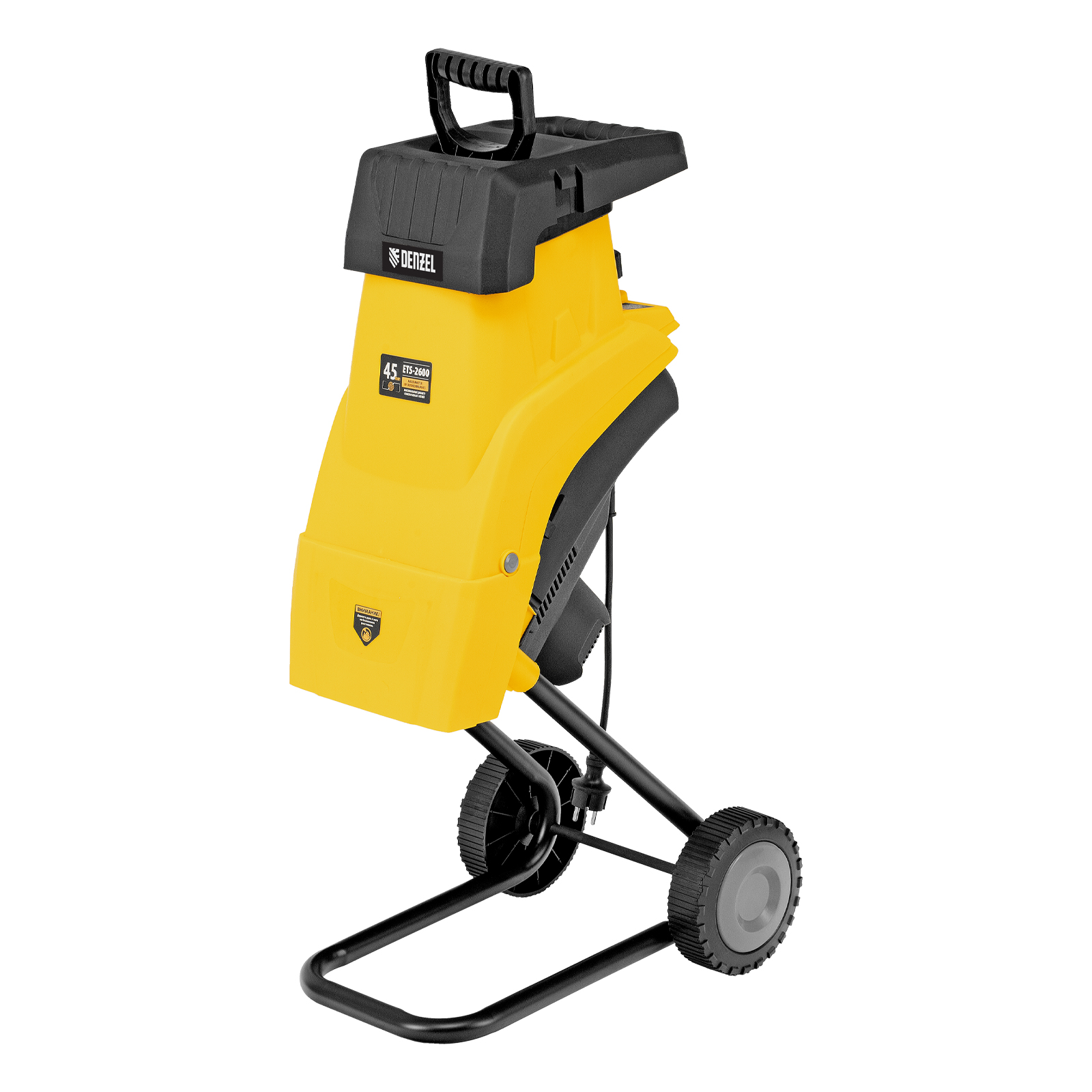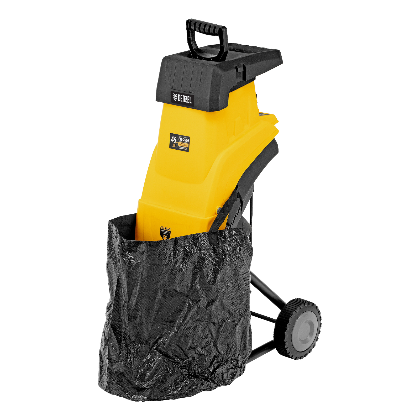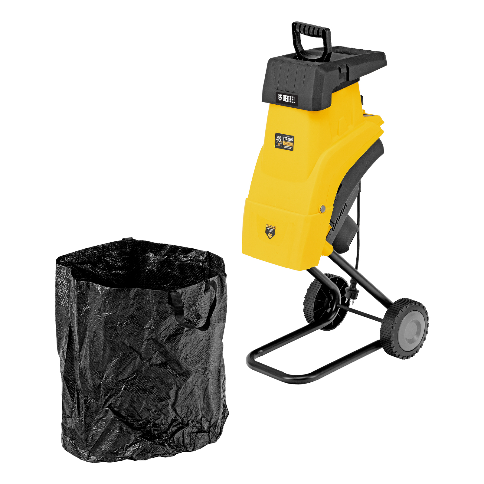 Садовый электрический измельчитель Denzel ETS-2600 59713 мощностью 2600 Вт предназначен для переработки веток диаметром до 45 мм. Полученную щепу можно использовать в качестве мульчи или сырья для компоста. Измельченные ветки попадают в мягкую подвесную сумку-травосборник объемом 60 л, которую не нужно часто опустошать. Мощный двигатель обеспечивает частоту вращения на холостом ходу 4500 об/мин, что позволяет быстро и эффективно справляться с работой. Измельчитель будет полезен на дачном участке.